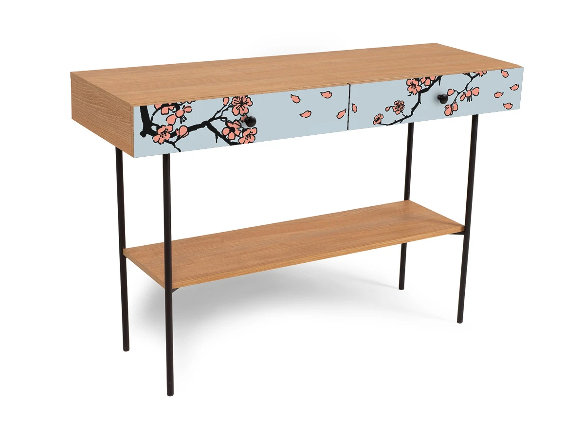 В столе два ящика на скрытых направляющих. В нижней части основания установлена полка.