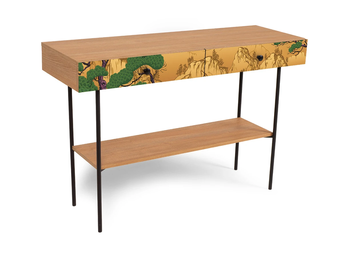В столе два ящика на скрытых направляющих. В нижней части основания установлена полка.