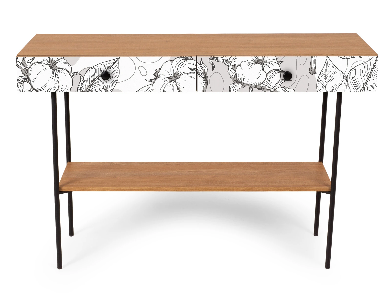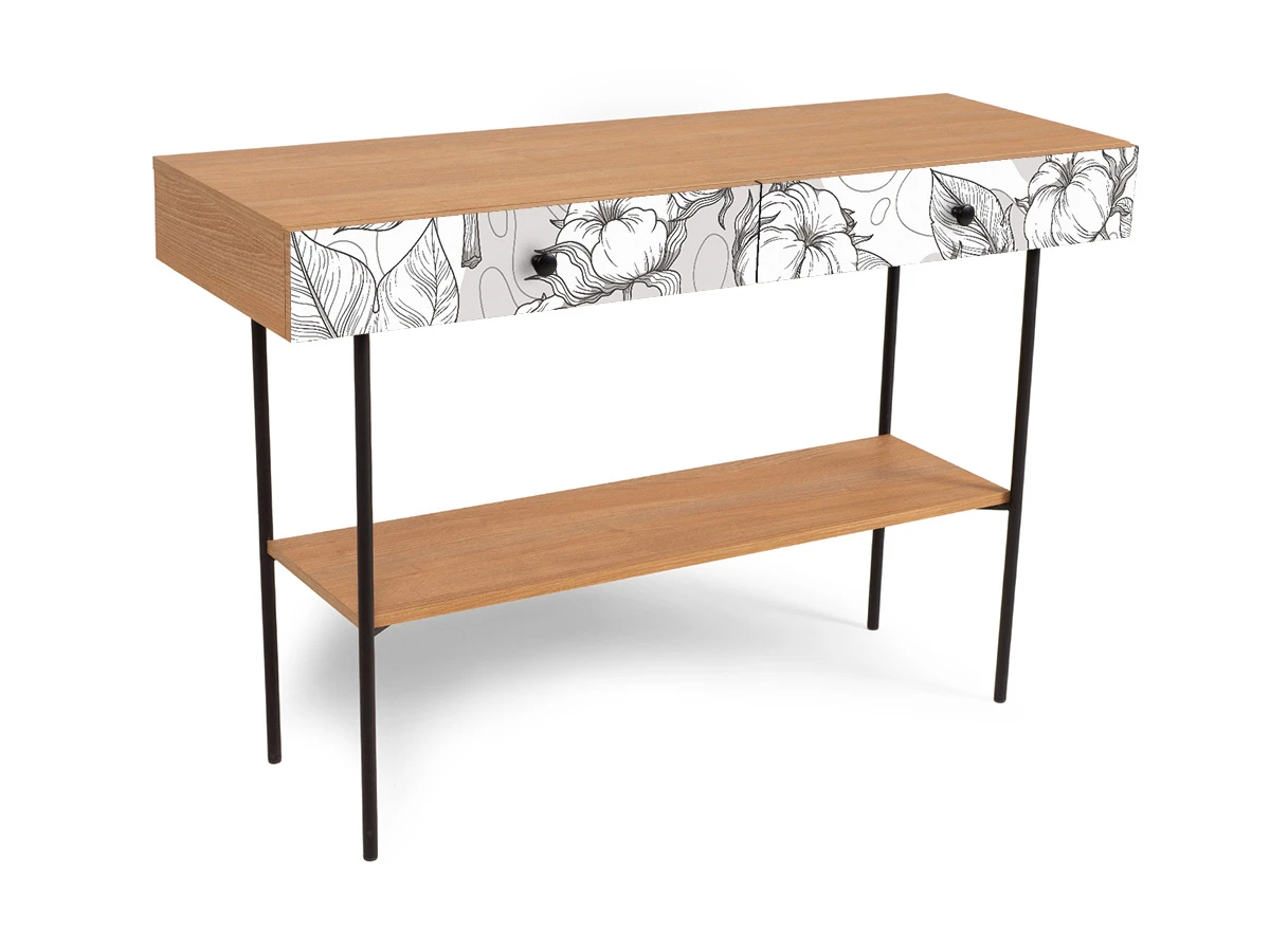В столе два ящика на скрытых направляющих. В нижней части основания установлена полка.