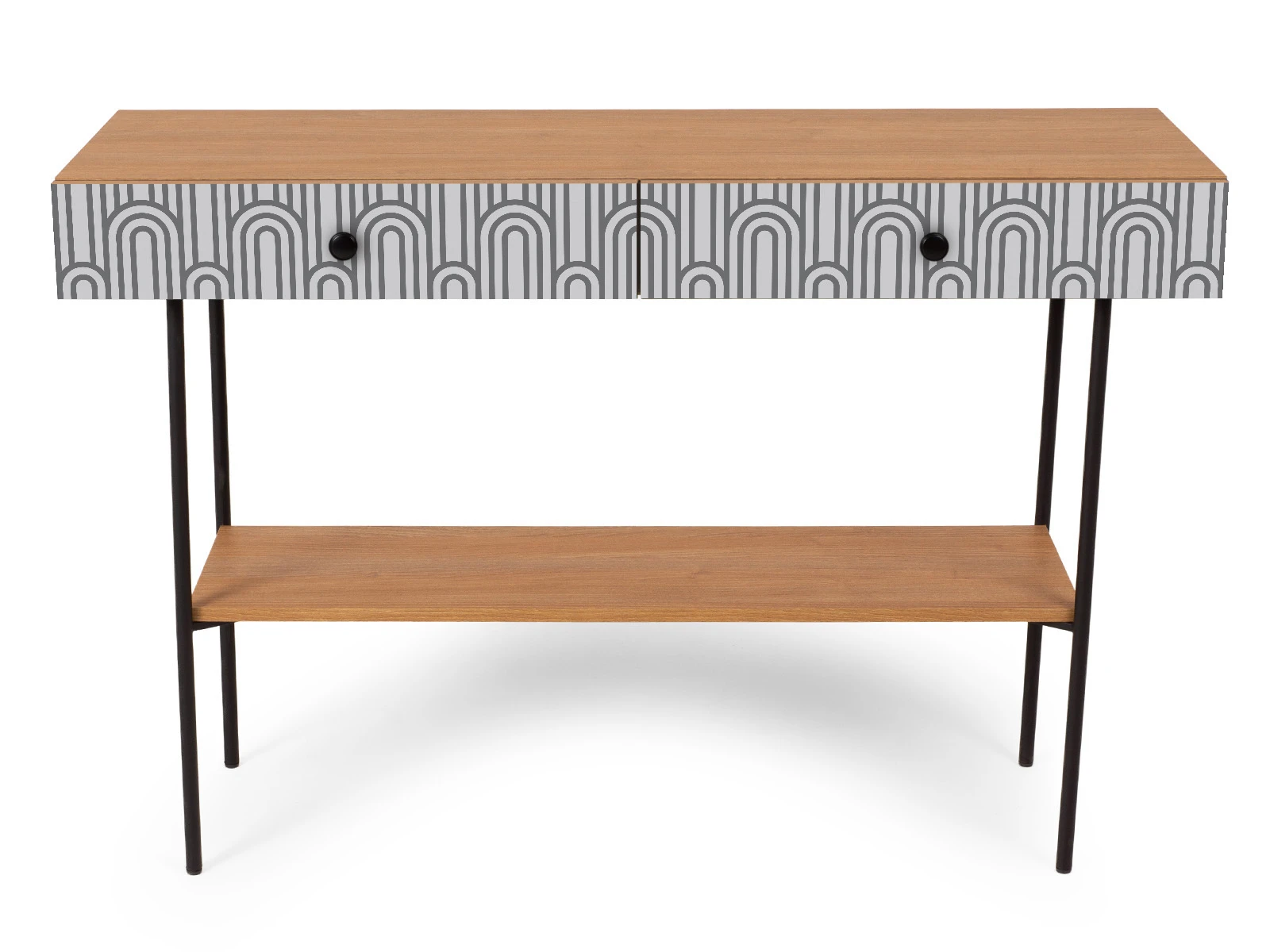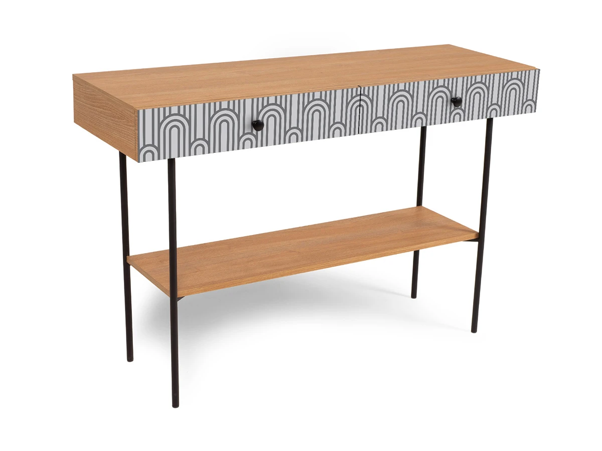 В столе два ящика на скрытых направляющих. В нижней части основания установлена полка.