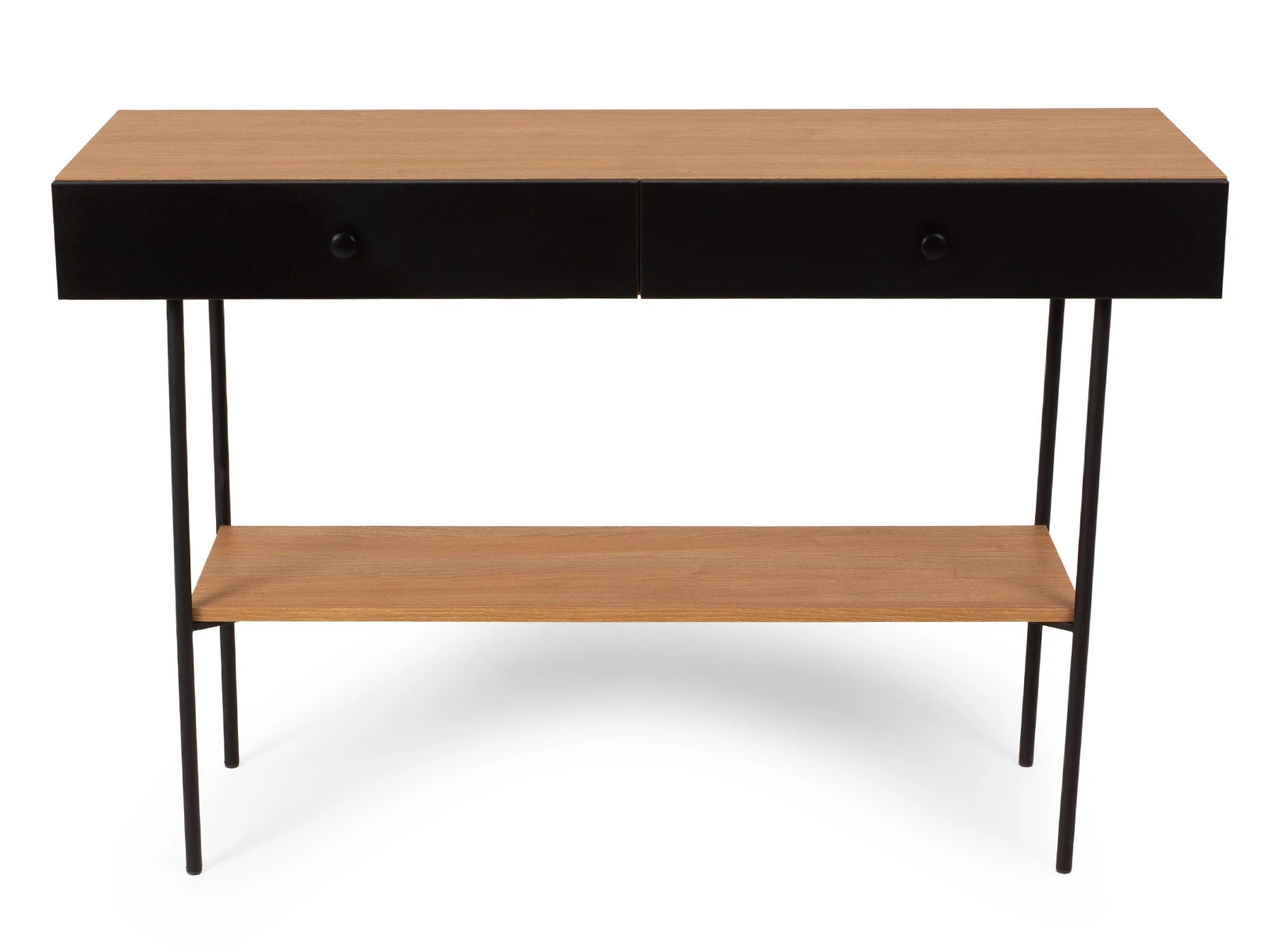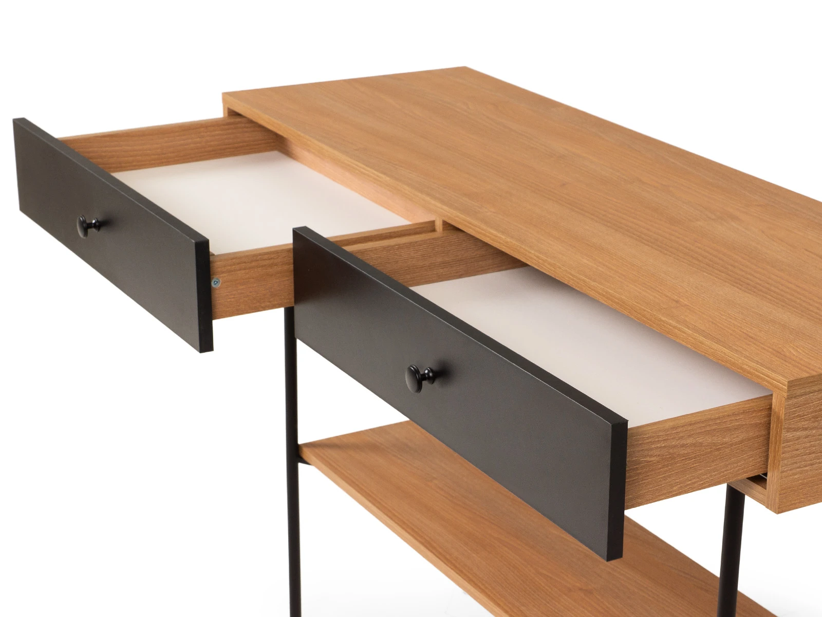 В столе два ящика на скрытых направляющих. В нижней части основания установлена полка.