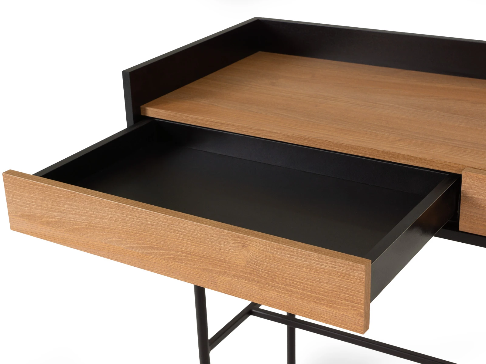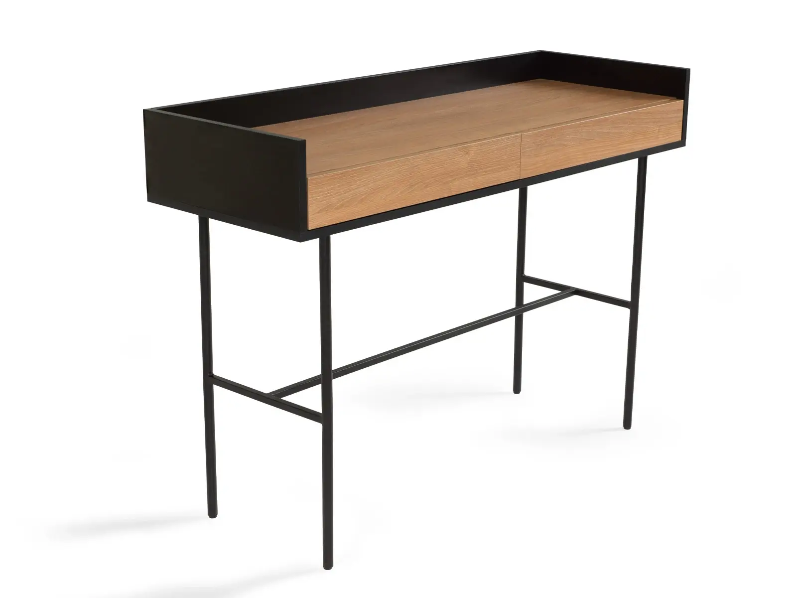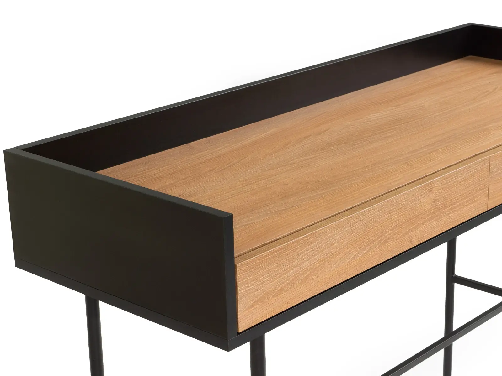 Стол консольный установлен на металлическое основание высотой 674 мм., окрашенное черной эмалью, с пластиковыми подпятниками. Стойки выполнены из круглой трубы d 20 мм, а перемычки из квадратной трубы 15*15 мм. В столе два ящика на скрытых направляющих.