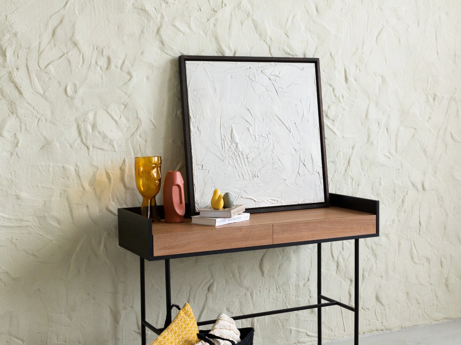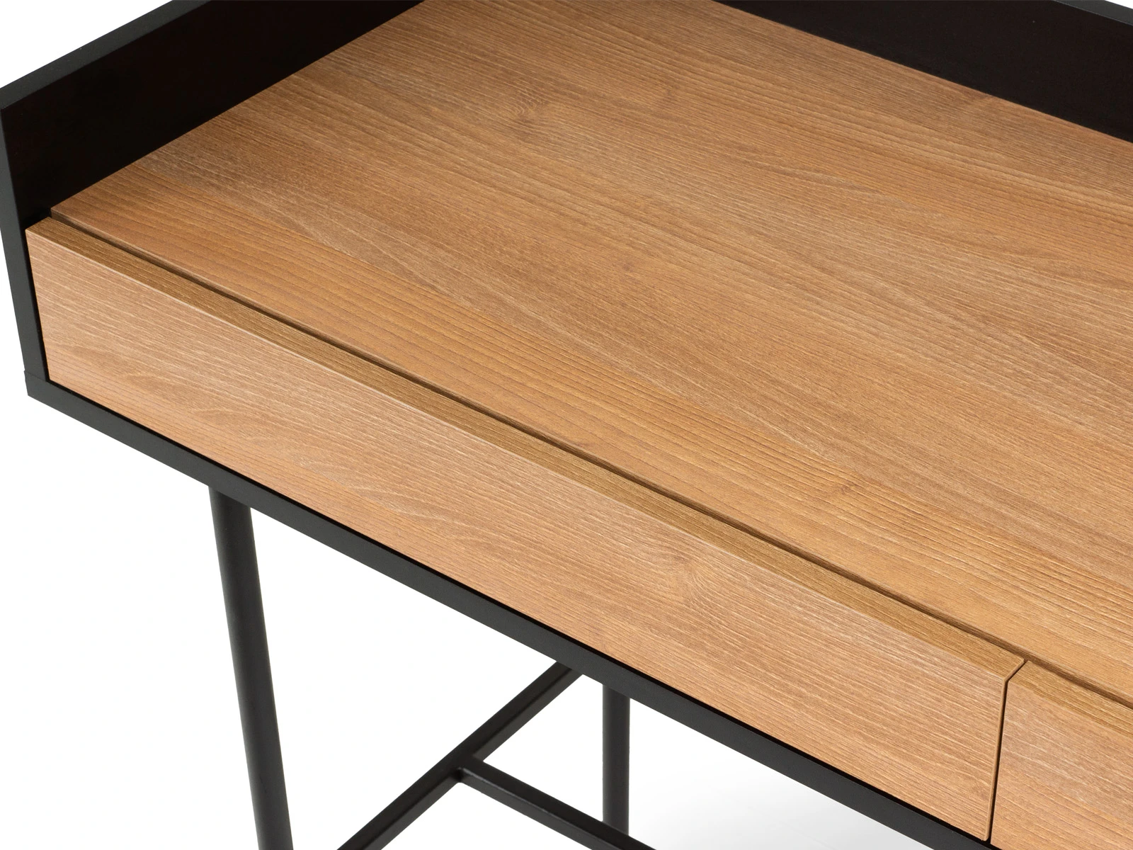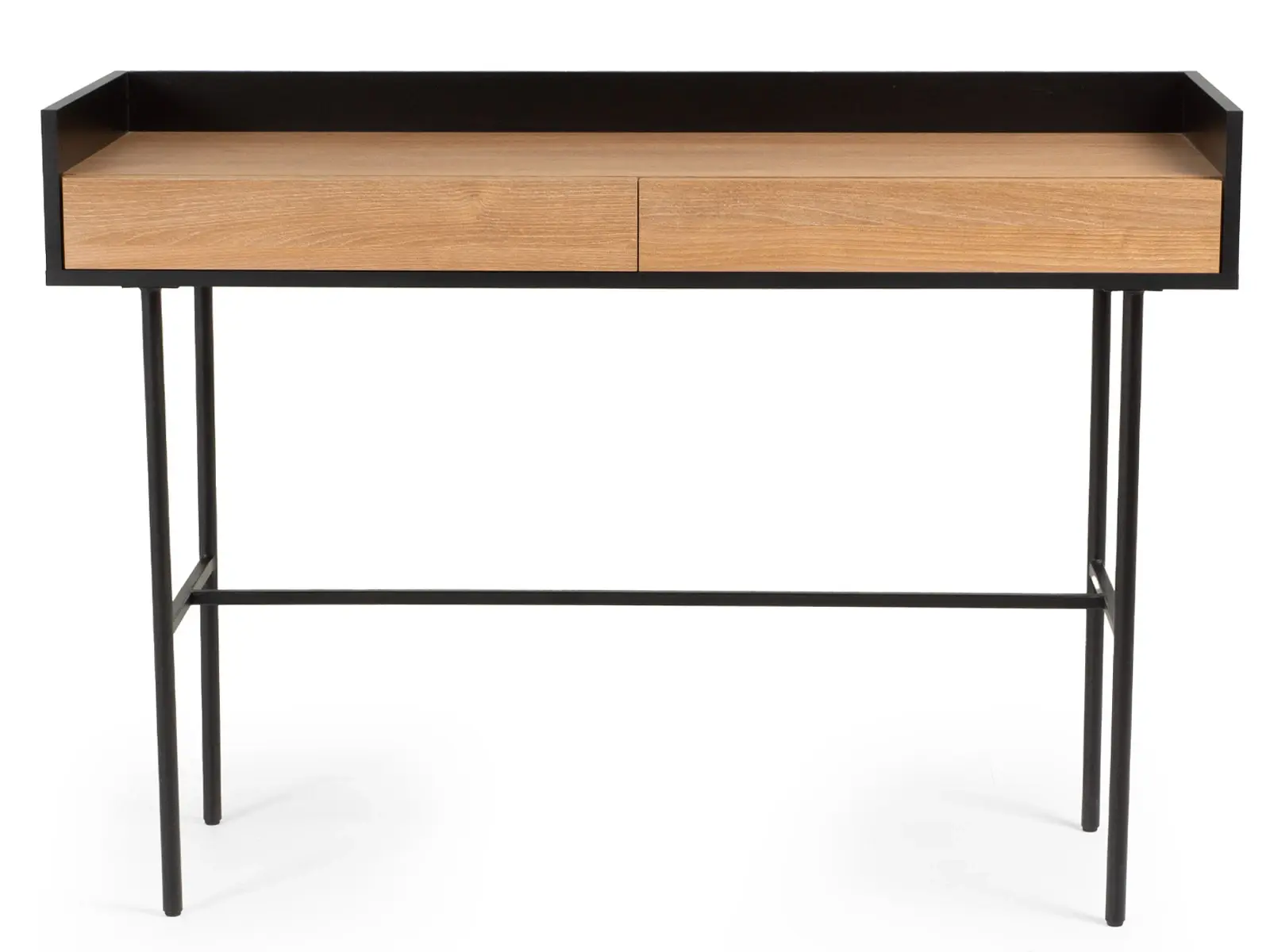 Стол консольный установлен на металлическое основание высотой 674 мм., окрашенное черной эмалью, с пластиковыми подпятниками. Стойки выполнены из круглой трубы d 20 мм, а перемычки из квадратной трубы 15*15 мм. В столе два ящика на скрытых направляющих.