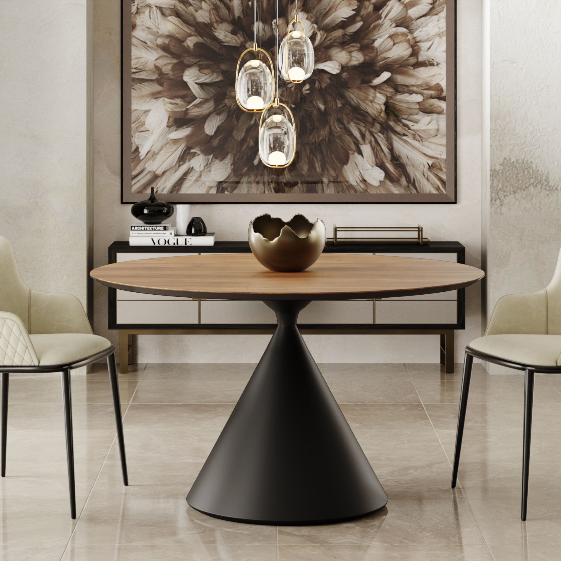 Стол с круглой столешницей AXIS не раскладывающийся, МДФ 24 мм с натуральным шпоном 1 мм. Опора стола выполнена в форме конуса и изготовлена из прочного металла. Цвет опоры - черный, что придает столу современный и стильный вид. Черный цвет добавляет элегантности и характера столу, при этом легко сочетается с различными интерьерными стилями.