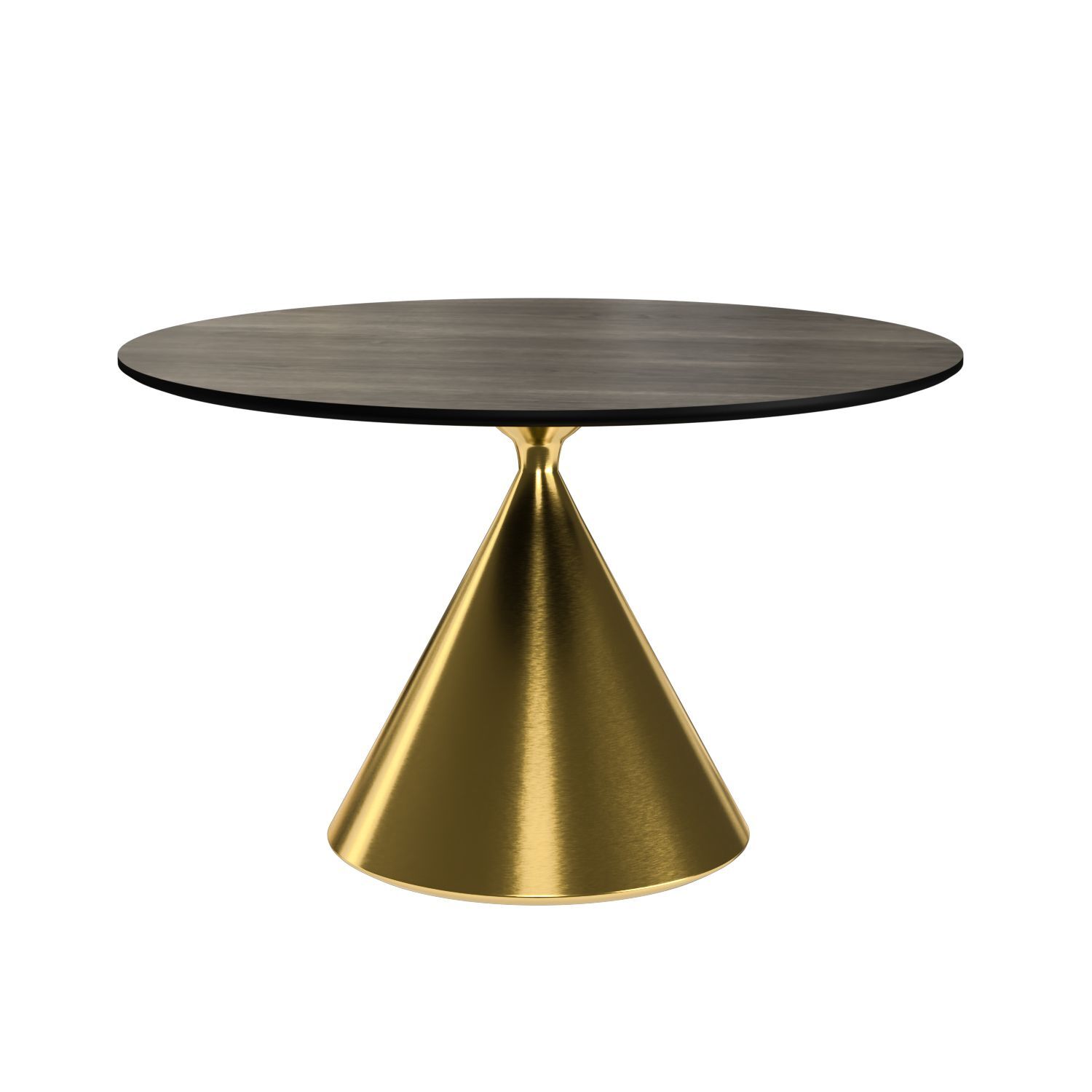 Стол с круглой столешницей AXIS не раскладывающийся, МДФ 24 мм с натуральным шпоном 1 мм. Опора стола выполнена в форме конуса и изготовлена из прочного металла. Цвет опоры - золото, что придает столу современный и стильный вид.