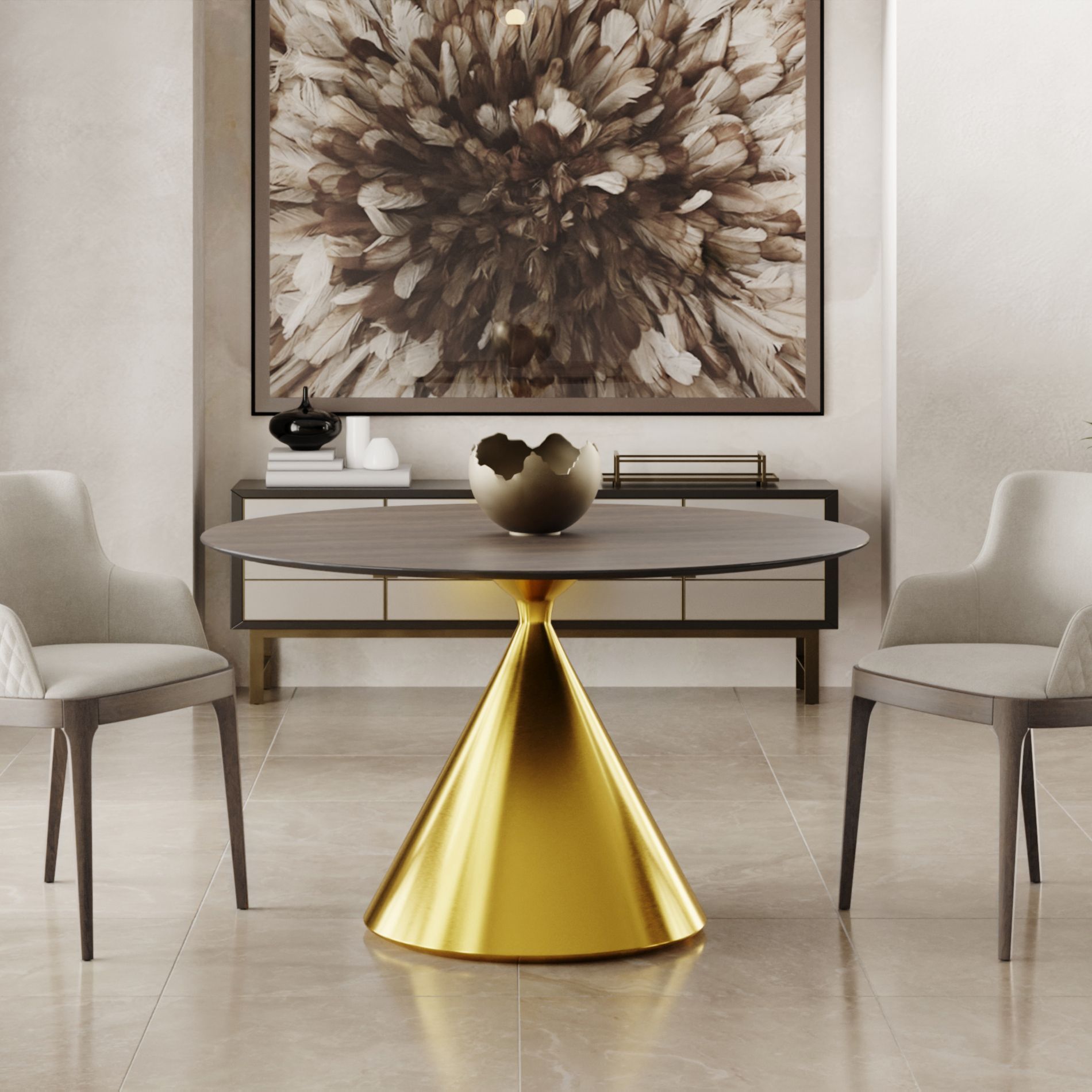 Круглый стол AXIS идеально подходит для создания уютной обеденной зоны в вашем доме или ресторане. Его дизайн и функциональность обеспечивают комфортное пространство для обеденной зоны и встреч с друзьями. Благодаря надежным материалам и качественной конструкции, этот стол будет служить вам долгое время и радовать вас своей эстетической привлекательностью. Стол с круглой столешницей AXIS не раскладывающийся, МДФ 24 мм с натуральным шпоном 1 мм. Опора стола выполнена в форме конуса и изготовлена из прочного металла. Цвет опоры - золото, что придает столу современный и стильный вид.