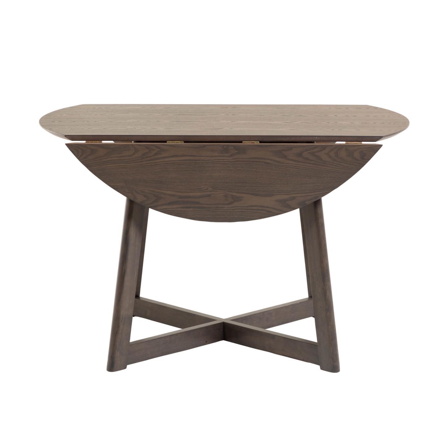 В полностью разложенном виде стол имеет круглую форму. Столешница выполнена из шпона ясеня. Она состоит из трех частей, снизу соединенных между собой металлическими дверными петлями.