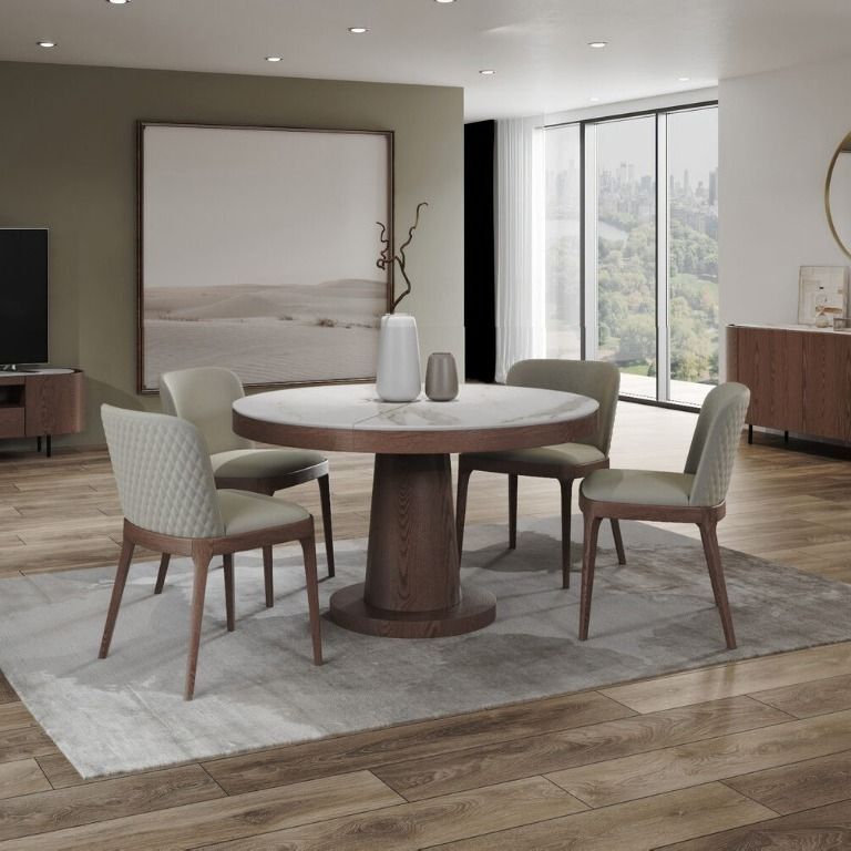 Стол с круглой столешницей, не раскладывающийся , представляет собой элегантное и удобное решение для обеденной зоны. Столешница выполнена из матовой керамики 6 мм, что придает ей стильный и современный вид. Опора стола выполнена из МДФ с натуральным шпоном, что придает конструкции прочность и устойчивость. Этот стол сочетает в себе функциональность, качество материалов и стильный дизайн, что делает его идеальным выбором для обеденной зоны вашего дома или кафе. Он станет уютным и привлекательным акцентом в любом интерьере..