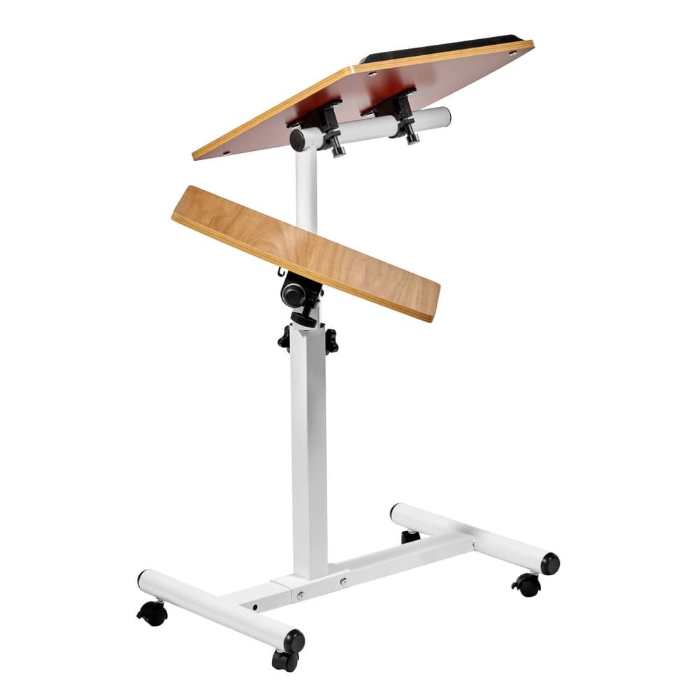 Столик оборудован поворотной столешницей из МДФ, состоящей из двух независимых частей, и металлическим основанием. Угол поворота столешницы составляет 180°, вплоть до вертикального положения. Высота подъема регулируется в диапазоне от 62 до 96 см. На столешнице имеются ограничители для ноутбука, планшета, предотвращающие падение гаджета.