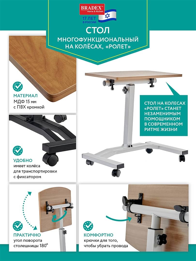 Рабочий стол для ноутбука, стол для перекуса, детский стол и тумбочка для чтения — 4 разных предмета мебели может заменить один, если это многофункциональный стол на колесах РОЛЕТ. Стол имеет колесики, благодаря чему легко может перемещаться по дому, занимая отведенное ему место. Небольшой размер столешницы позволит расположить предмет мебели практически в любой комнате. Стол регулируется по высоте и легко подстраивается под нужды обладателей. Удобный и практичный, многофункциональный стол на колесах РОЛЕТ станет незаменимым помощником в современном ритме жизни.