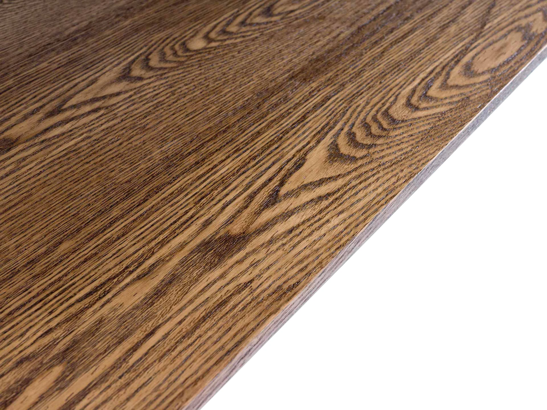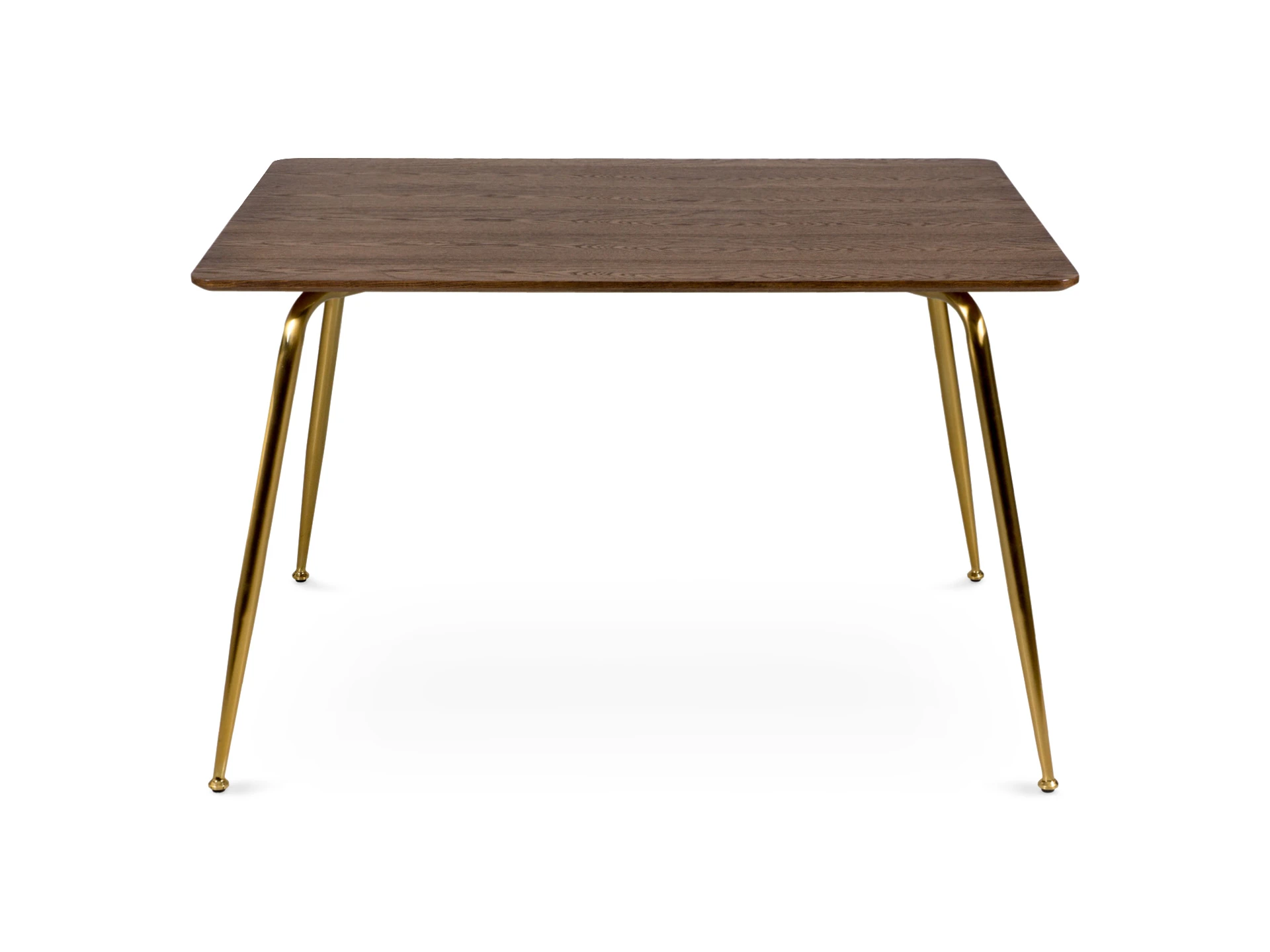 Вместительный и широкий стол Dino подойдет для любого случая. Будь то обыденный завтрак с семьей перед поездкой на работу или романтический ужин со своей второй половинкой, когда на столе стоят не только блюда, но и ваза с красивым букетом роз, зажженные свечи. А может быть вы решите пригласить друзей в гости на уютные посиделки за какой-нибудь интересной настольной игрой. Стол спокойно вмещает 4-6 человек. Тонкая столешница и ножки придают легкость помещению. Вы забудете об ощущении тесноты и захламленности. Наоборот — придет приятное чувство, будто стало легче дышать. Столешница из МДФ покрыта 2-мя вариантами шпона: ореха или черного дуба. Стол обработан специальным материалом — меламином. Он обладает высокой устойчивостью к царапинам, сколам и вмятинам. Каркас и ножки стола изготовлены из металла и покрашены в матовый золотистый цвет, что добавит капельку солнца в вашу комнату.