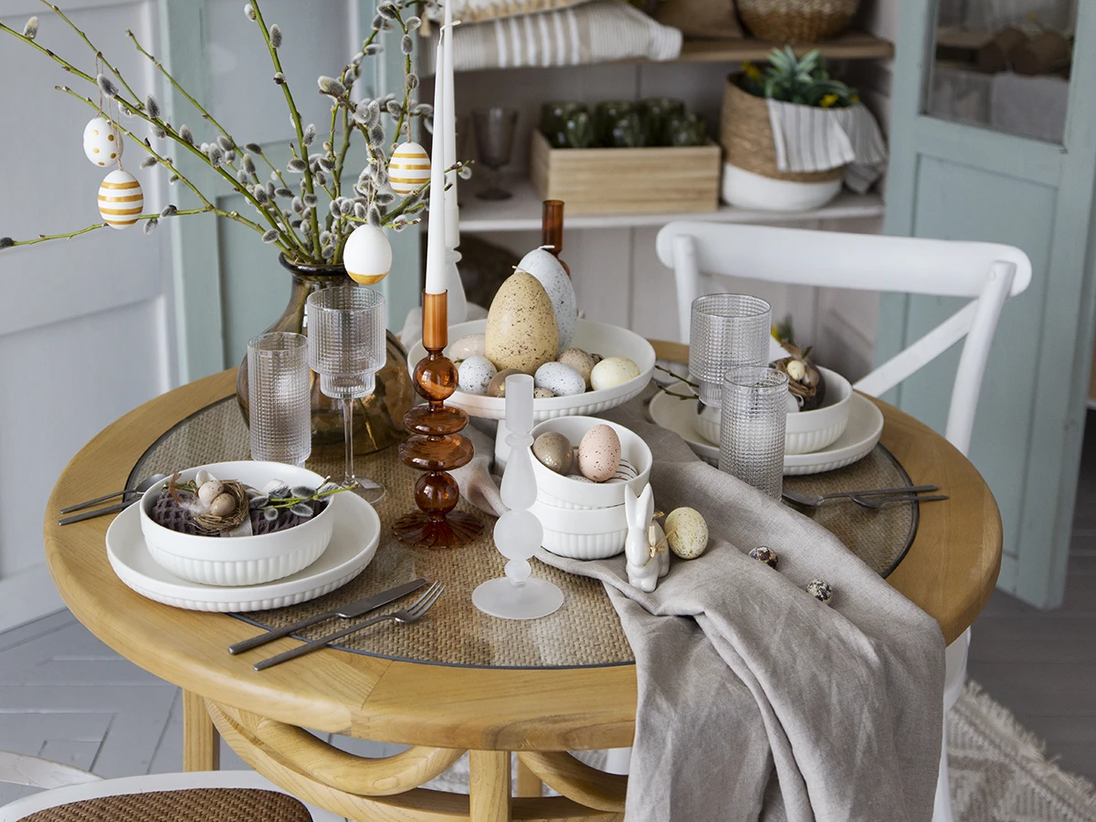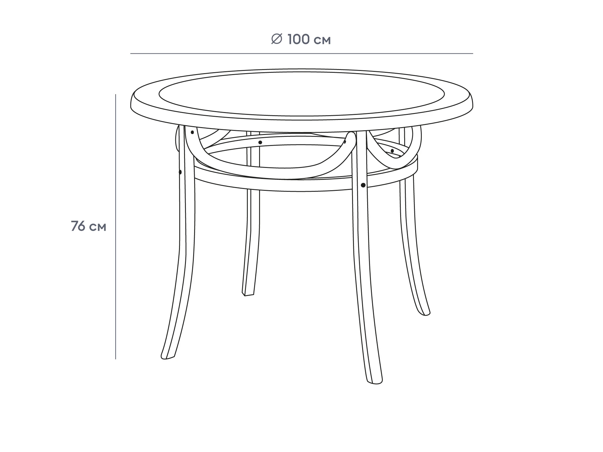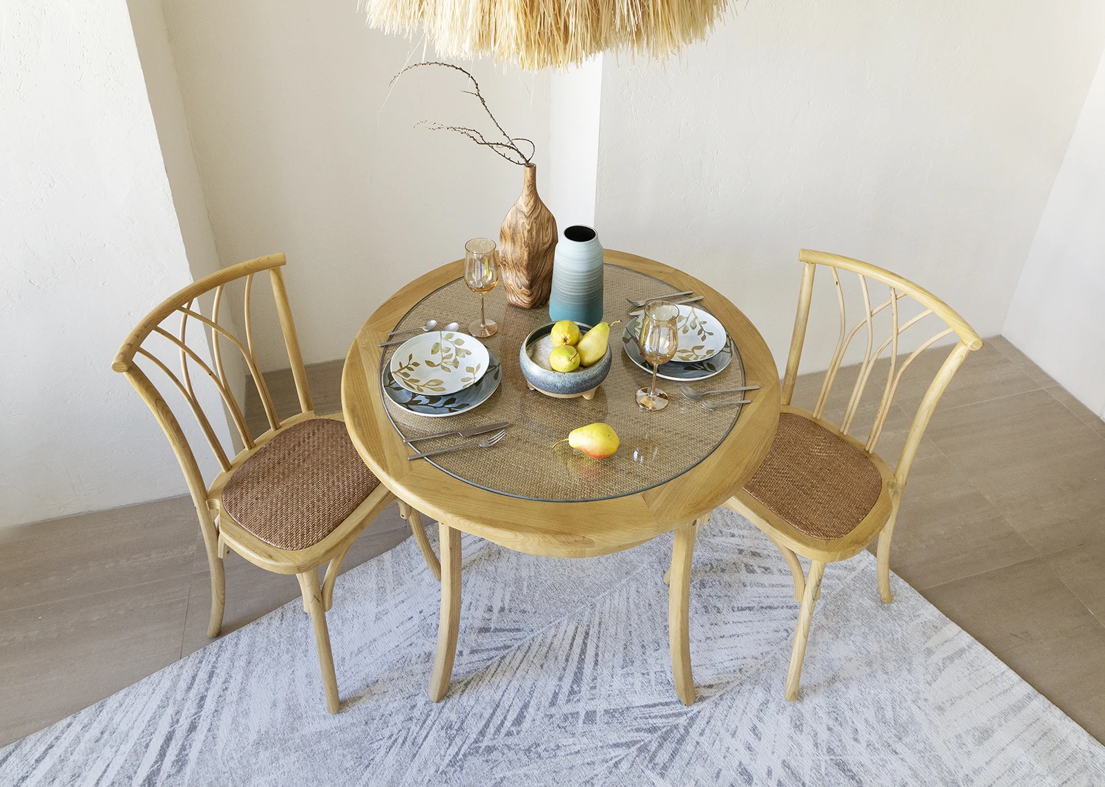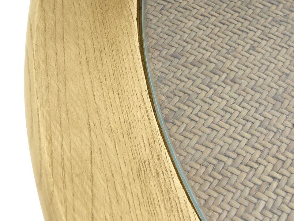 Garfield - обеденный стол из массива вяза. Столешница стола выполнена из ротанга и стекла. Диаметр стола 100 см, высота стола 76 см. Размер упаковки: Пакет 1 104х104х7 см, Пакет 2 90х90х77 см