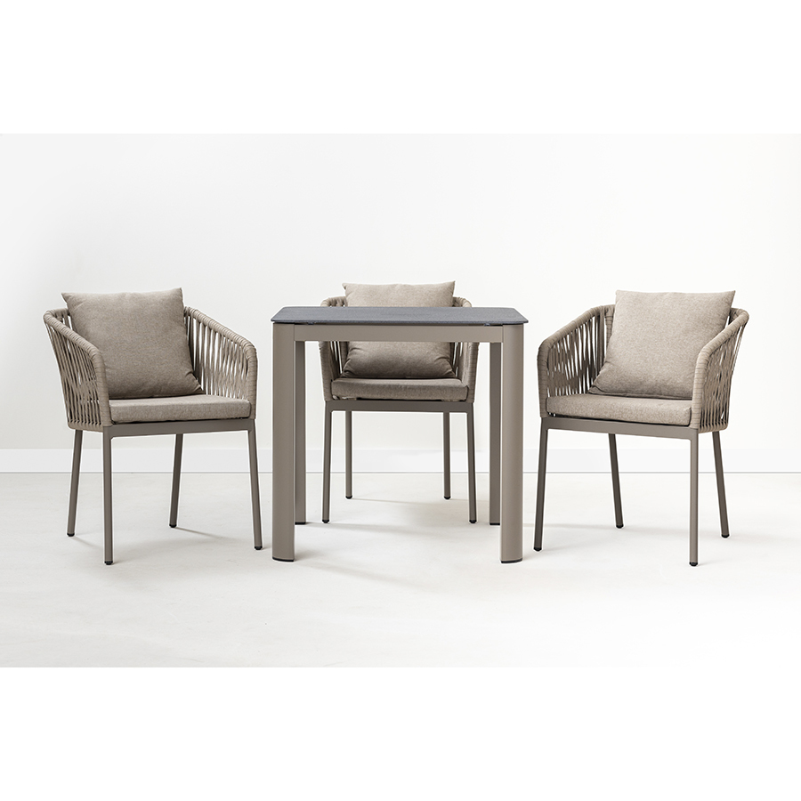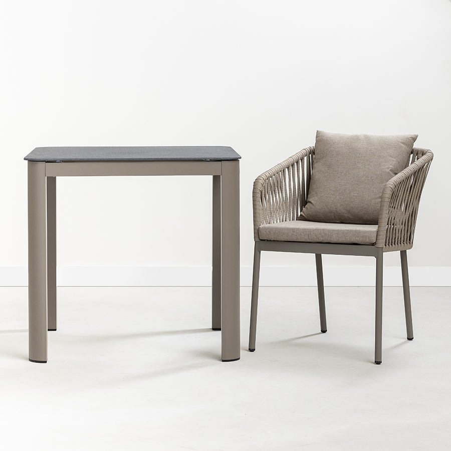 Материал: алюминий, закаленное кварцевое стекло. Размеры: 80х80х75 см. Расстояние между ножками: 76 см. Цвет: серо-бежевый.