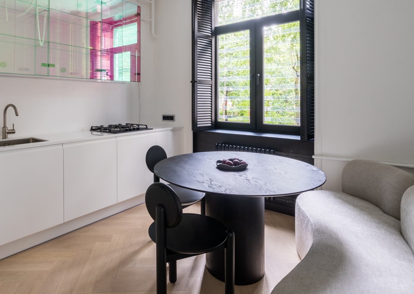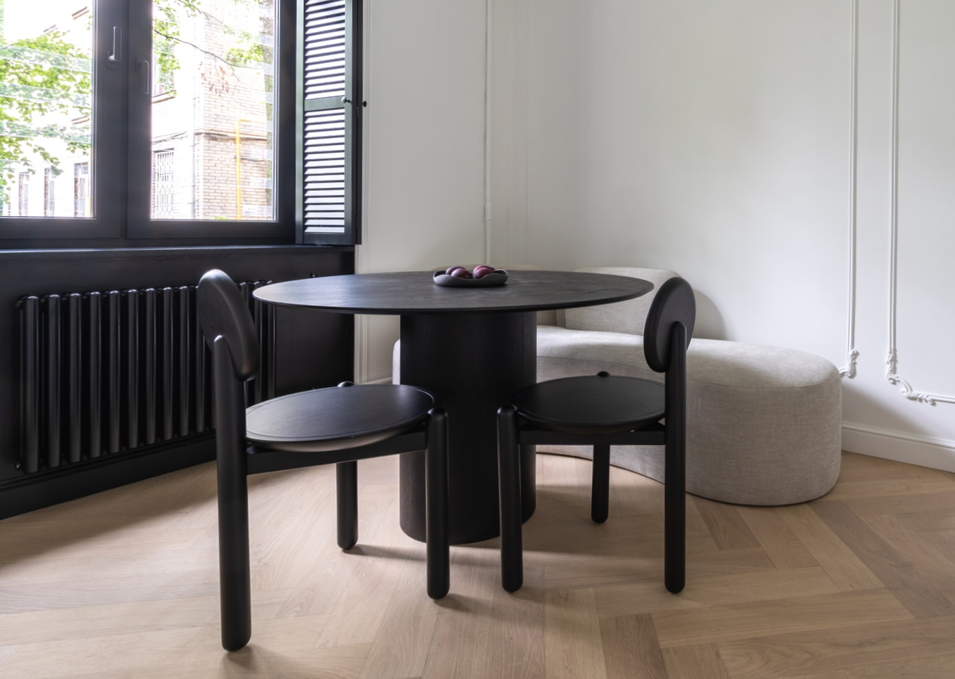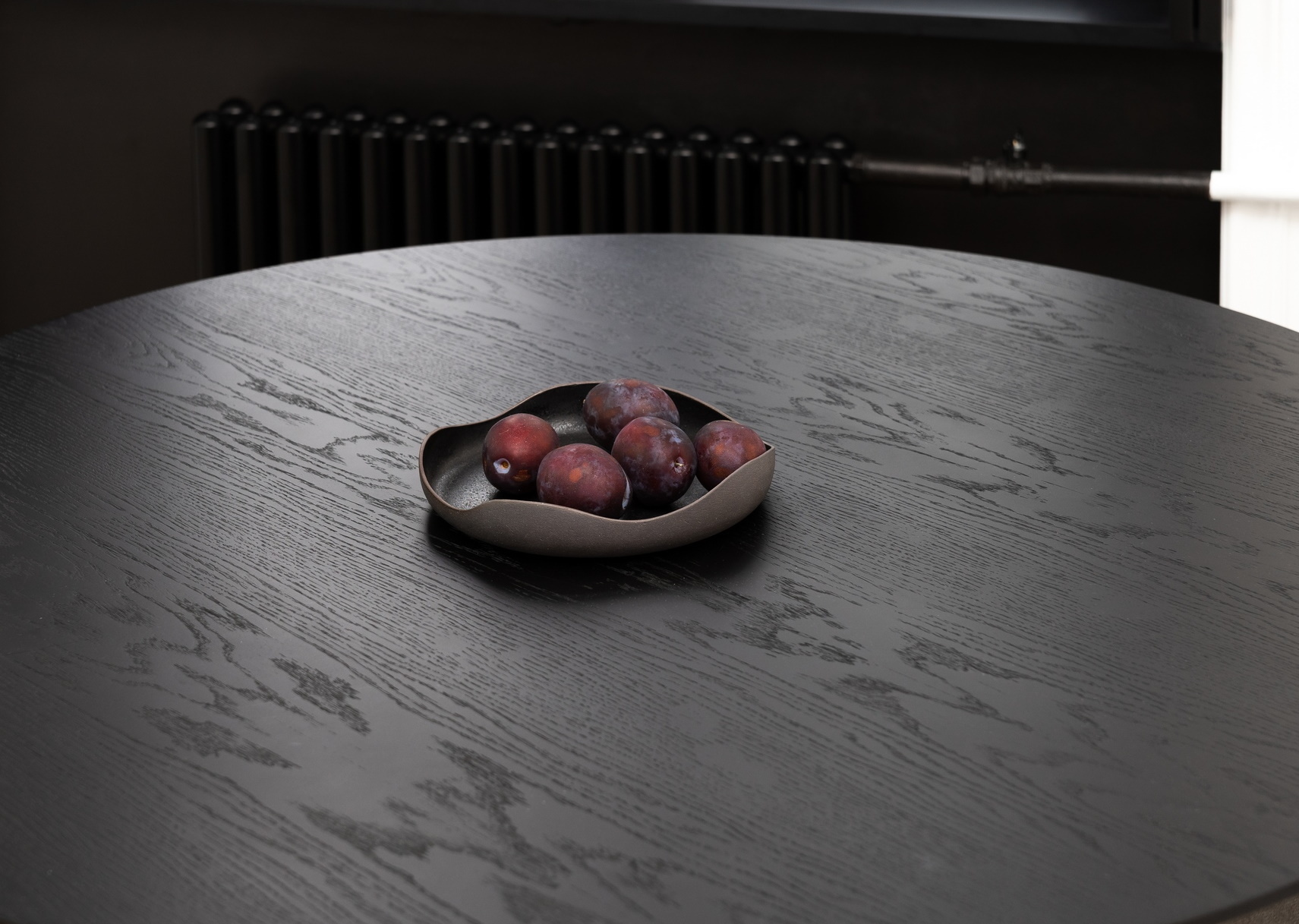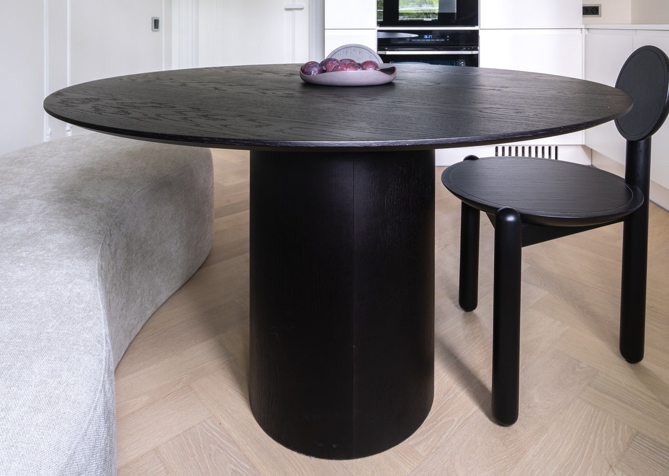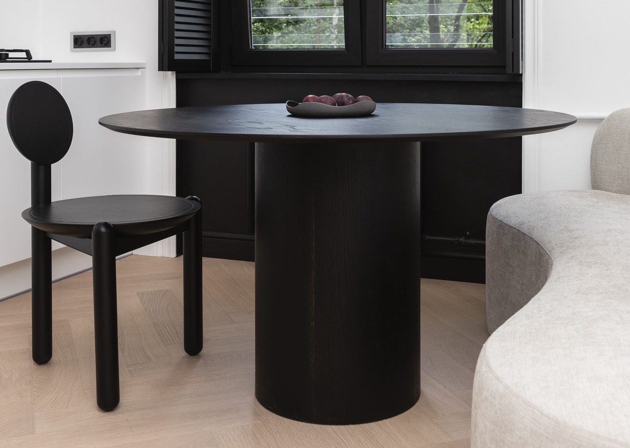 Высота: 75 см Диаметр столешницы: 120 см Диаметр основания: 43 см Вес: 69 кг Материал: массив березы, шпон дуба, мдф Покрытие: черная морилка, лак