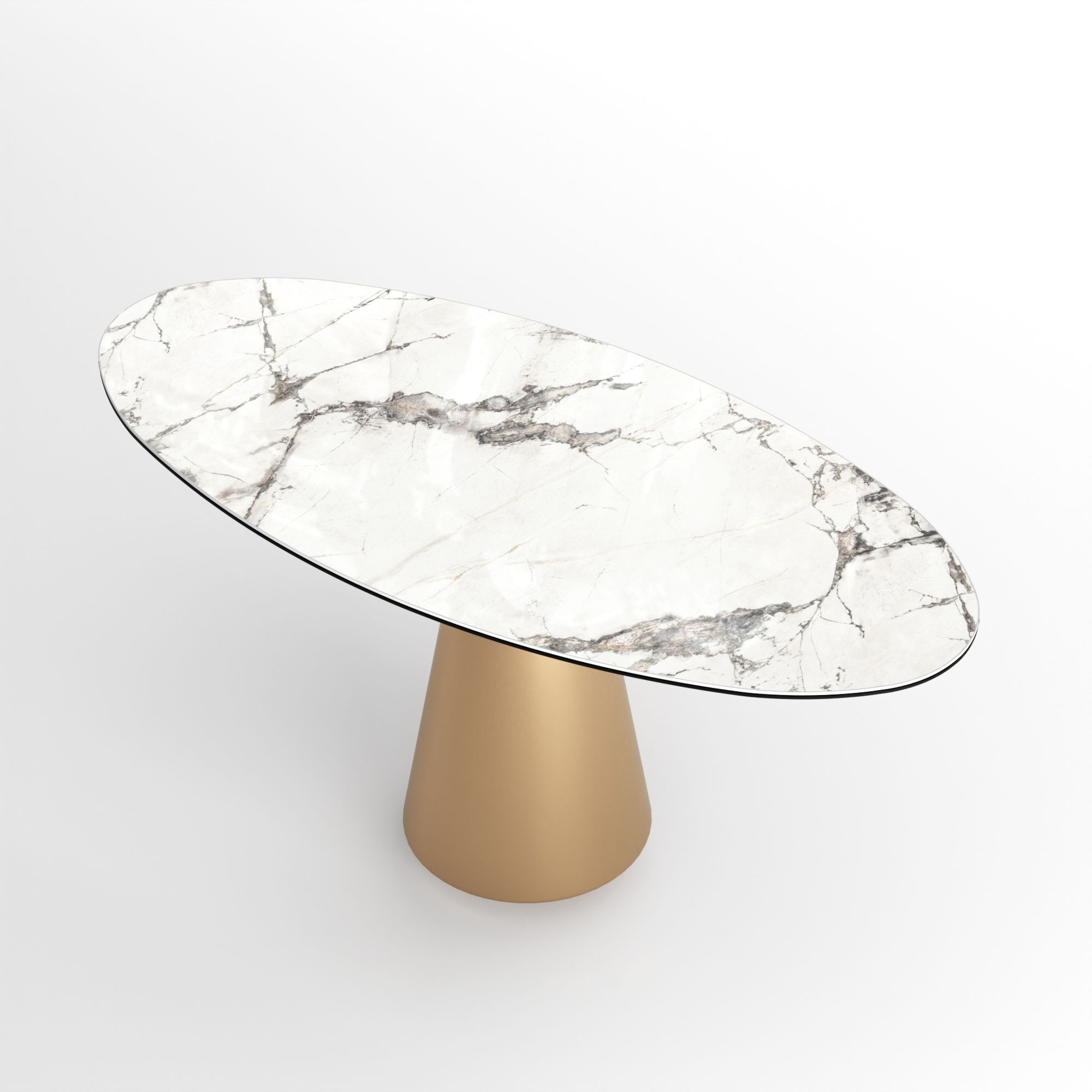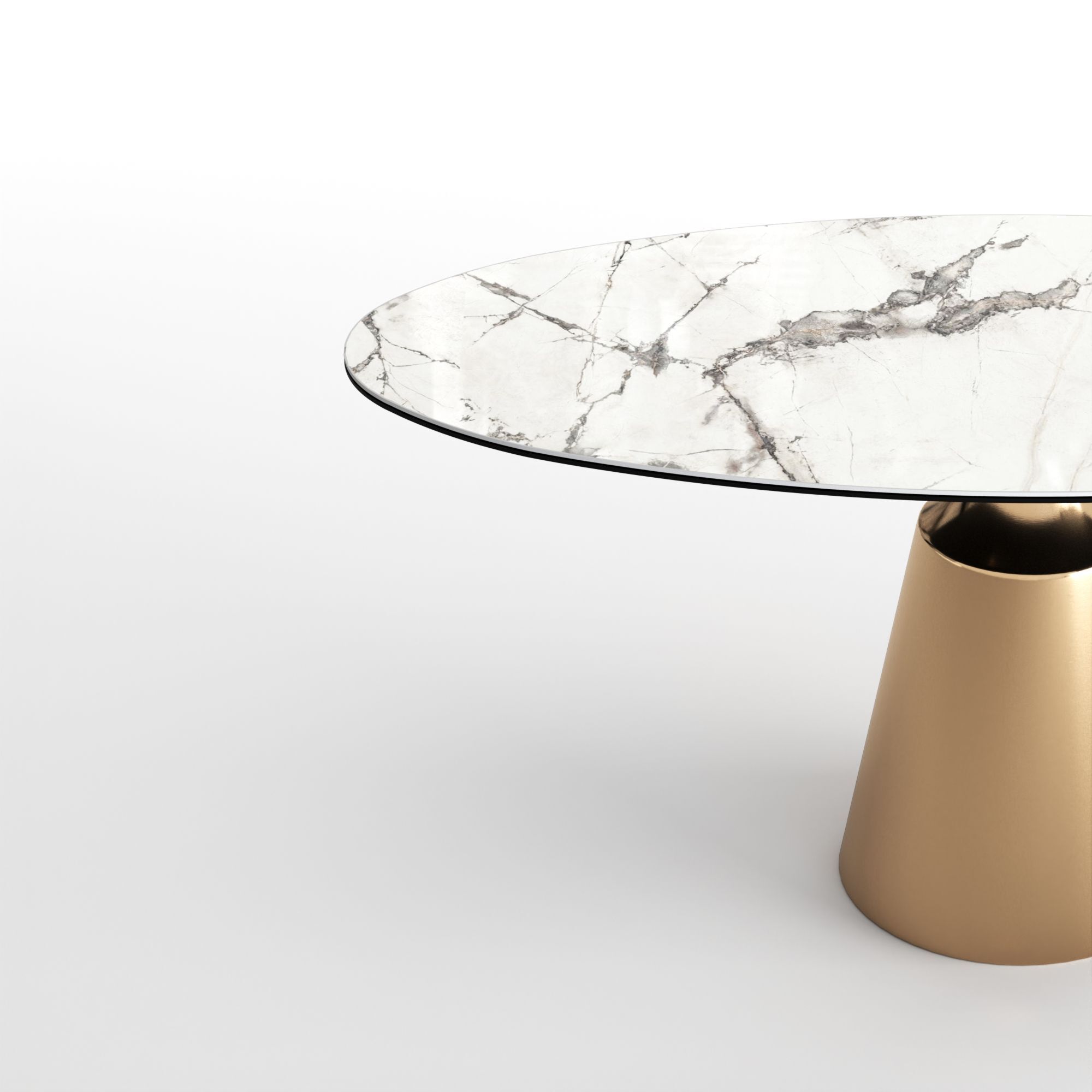 Коллекция обеденных столов Lucas - одна из самых популярных. Включает в себя различные варианты и формы обеденных столов, для персонализации своей собственной дизайнерской столовой. Основание состоит из центрального конусного ствола, выполненного из нержавеющей стали, массивный внешний вид которого облегчается металлическим покрытием нитрид титана цвет золото и соединением с узкой и отступающей столешницей, как бы напоминающей длинную элегантную шею, поддерживающую столешницу. Коллекция включает круглый, овальный, прямоугольный керамический стол Lucas с матовым или глянцевым покрытием и версию со столешницей из шпона. Столешница выполнена из МДФ 19 мм, керамика толщиной 6 мм. Ее органический и натуральный внешний вид подчеркивает путь бренда к экологичному дизайну, который создается из натуральных материалов с использованием методов с низким энергопотреблением.