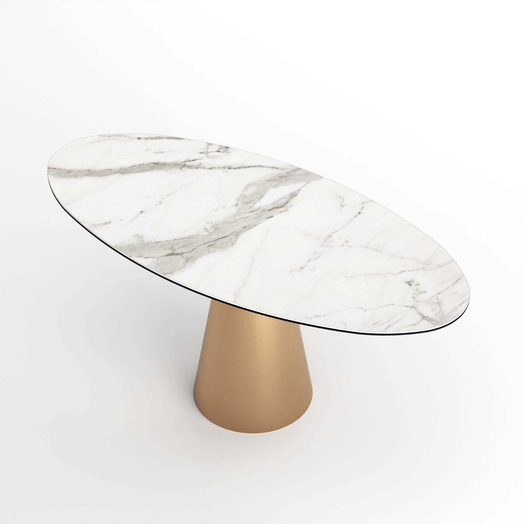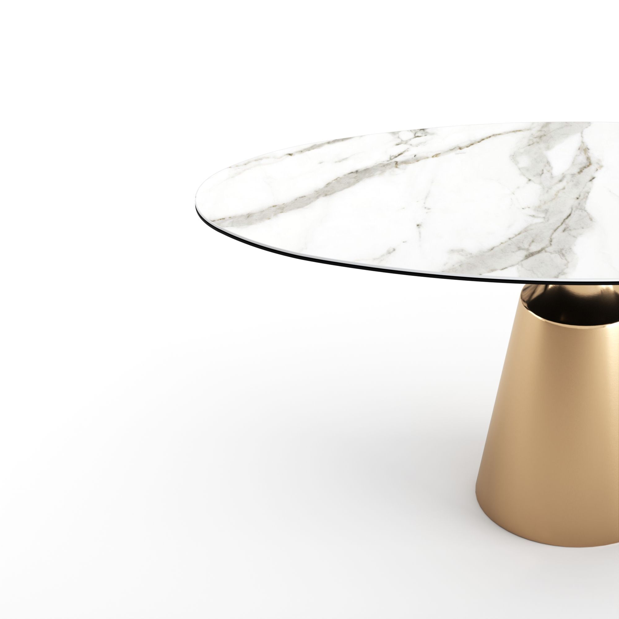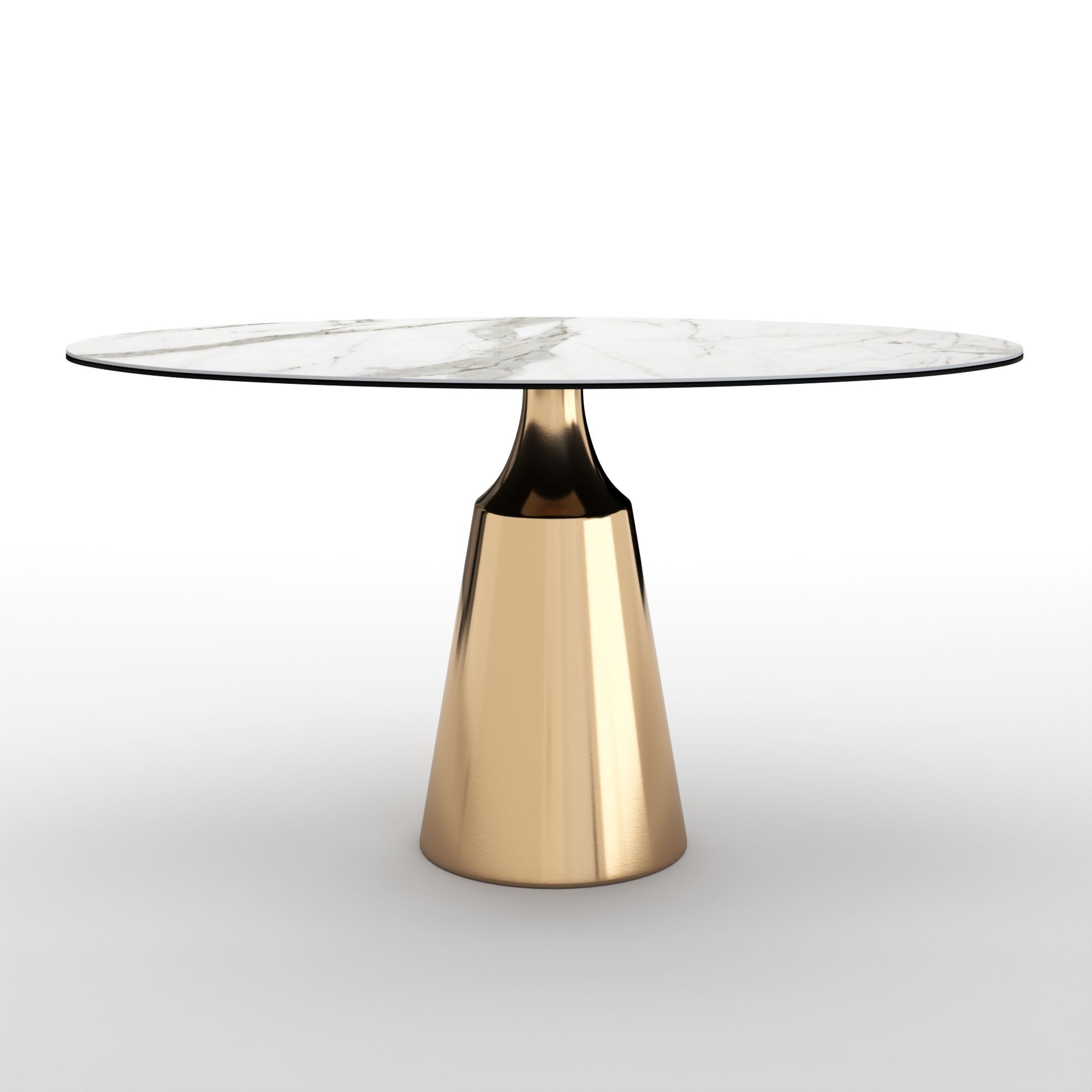 Коллекция обеденных столов Lucas - одна из самых популярных. Включает в себя различные варианты и формы обеденных столов, для персонализации своей собственной дизайнерской столовой. Основание состоит из центрального конусного ствола, выполненного из нержавеющей стали, массивный внешний вид которого облегчается металлическим покрытием нитрид титана цвет золото и соединением с узкой и отступающей столешницей, как бы напоминающей длинную элегантную шею, поддерживающую столешницу. Коллекция включает круглый, овальный, прямоугольный керамический стол Lucas с матовым или глянцевым покрытием и версию со столешницей из шпона. Столешница выполнена из МДФ 19 мм, керамика толщиной 6 мм. Ее органический и натуральный внешний вид подчеркивает путь бренда к экологичному дизайну, который создается из натуральных материалов с использованием методов с низким энергопотреблением.