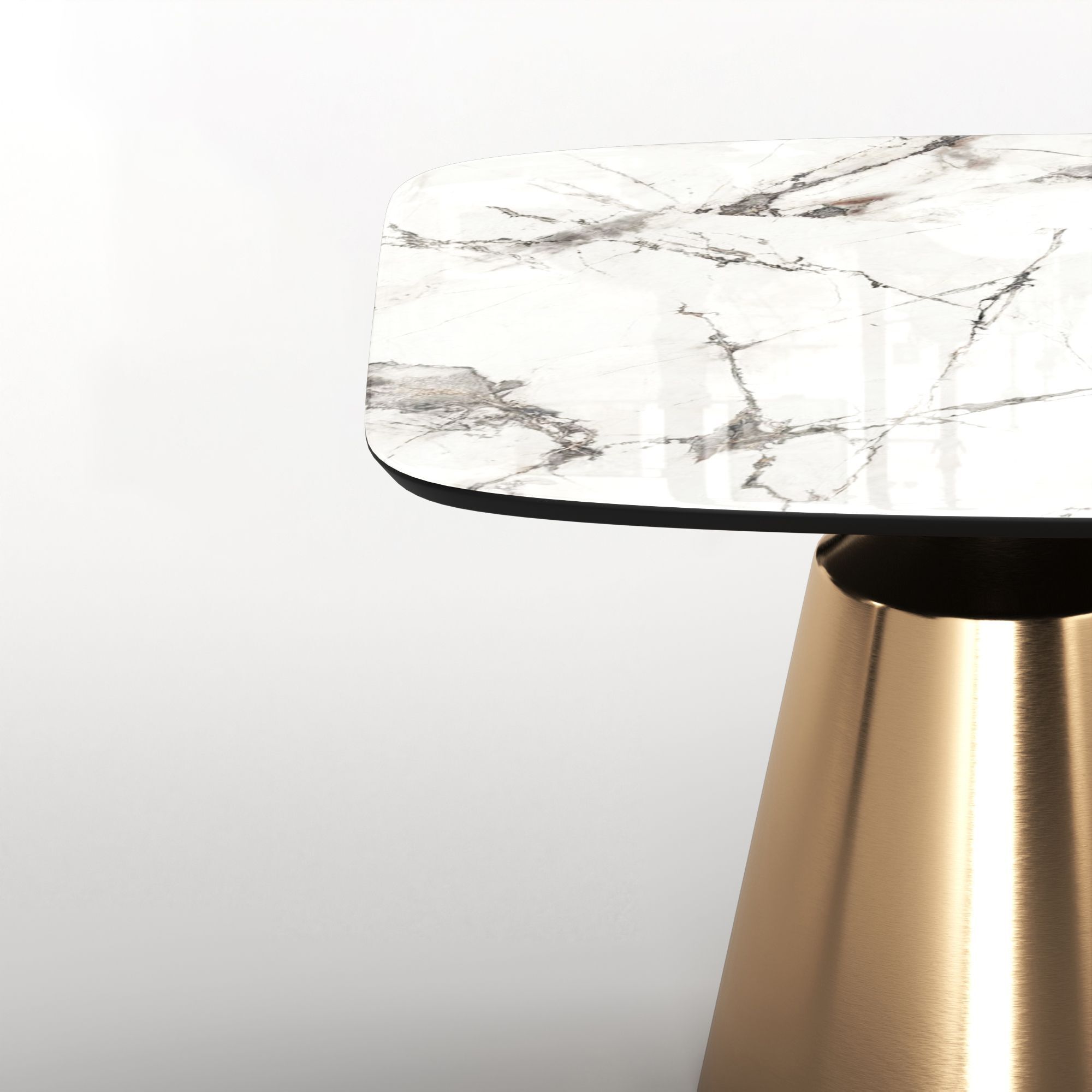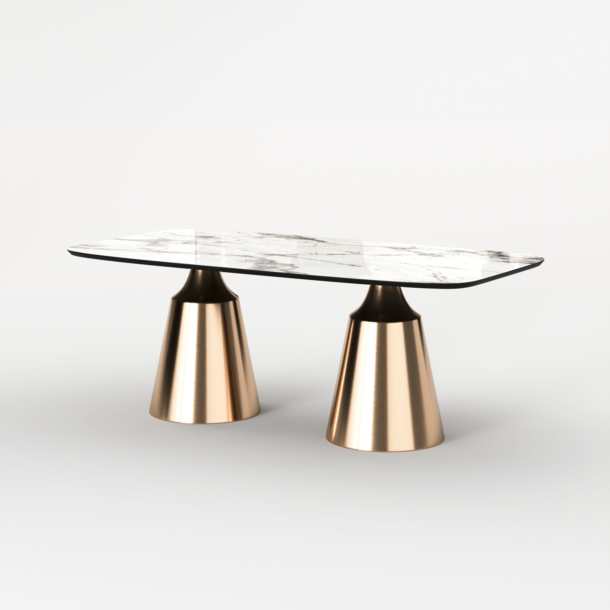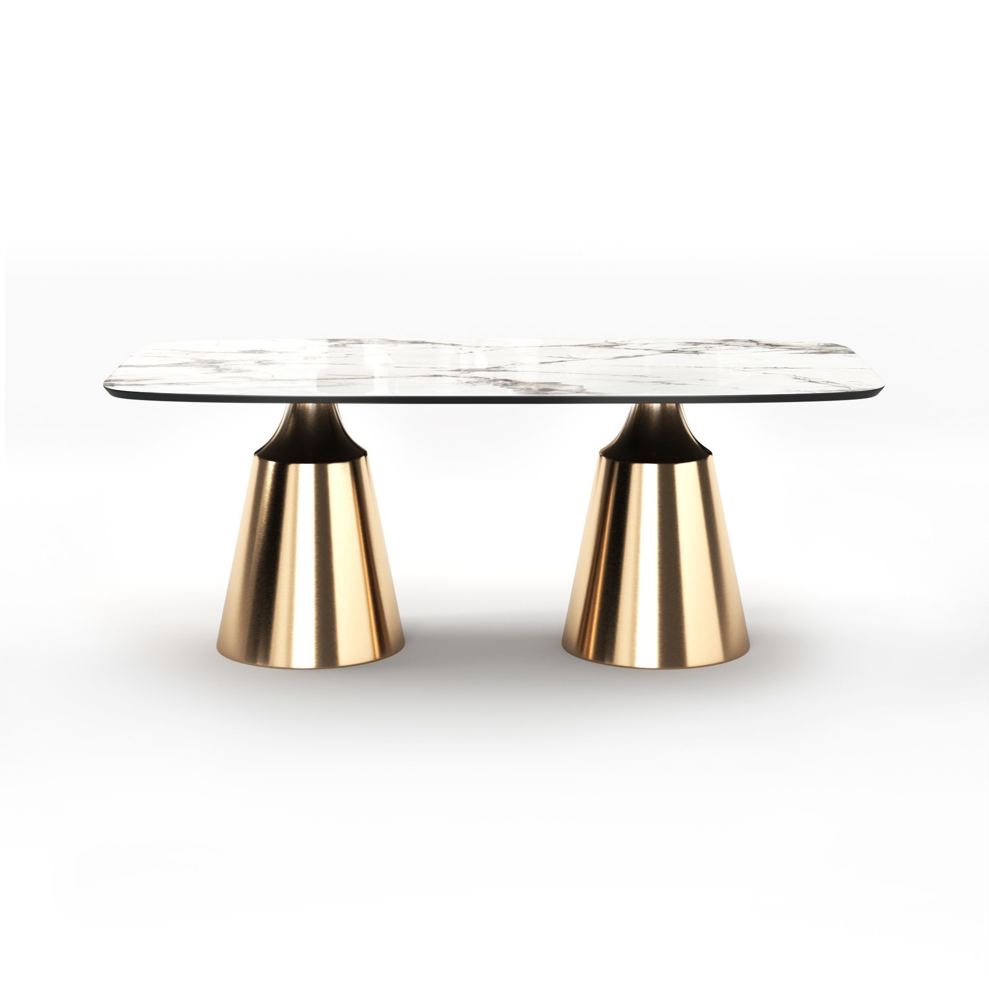 Коллекция обеденных столов Lucas - одна из самых популярных. Включает в себя различные варианты и формы обеденных столов, для персонализации своей собственной дизайнерской столовой. Основание состоит из центрального конусного ствола, выполненного из нержавеющей стали, массивный внешний вид которого облегчается металлическим покрытием нитрид титана цвет золото и соединением с узкой и отступающей столешницей, как бы напоминающей длинную элегантную шею, поддерживающую столешницу. Коллекция включает круглый, овальный, прямоугольный керамический стол Lucas с матовым или глянцевым покрытием и версию со столешницей из шпона. Столешница выполнена из МДФ 19 мм, керамика толщиной 6 мм. Ее органический и натуральный внешний вид подчеркивает путь бренда к экологичному дизайну, который создается из натуральных материалов с использованием методов с низким энергопотреблением.