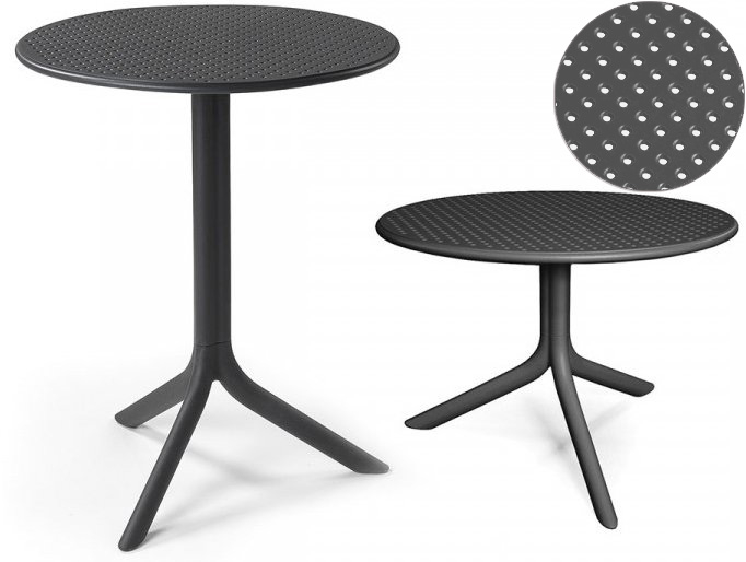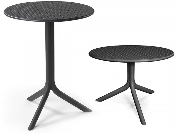 Дизайн: Raffaello Galiotto. Стол Step из стекловолокна с круглой столешницей с небольшими декоративными перфорациями, которые также эффективно выполняют функцию дренажа. Вы легко можете сделать его как обеденным столом с высотой 765 мм, так и кофейным столиком высотой 400 мм.
