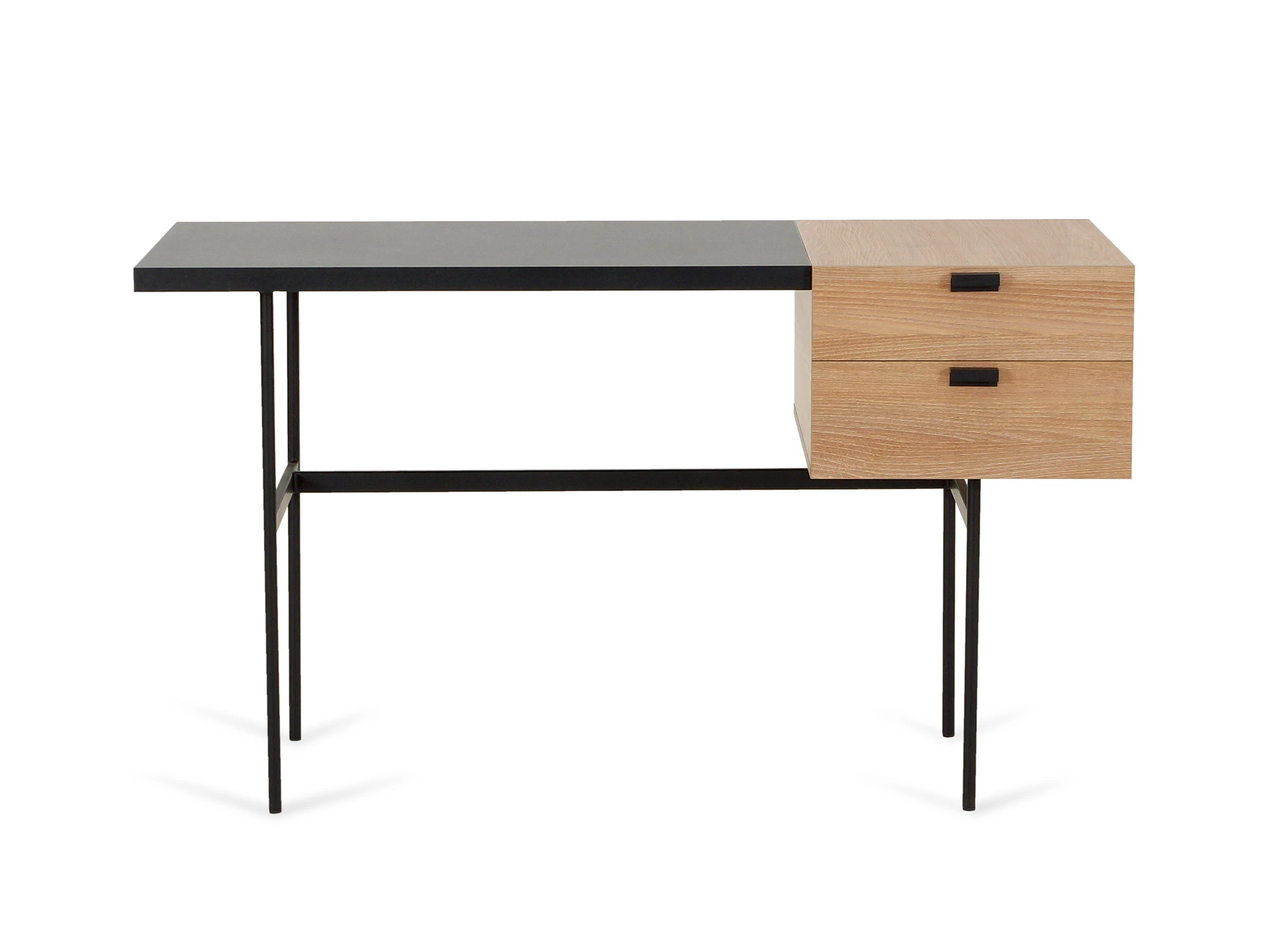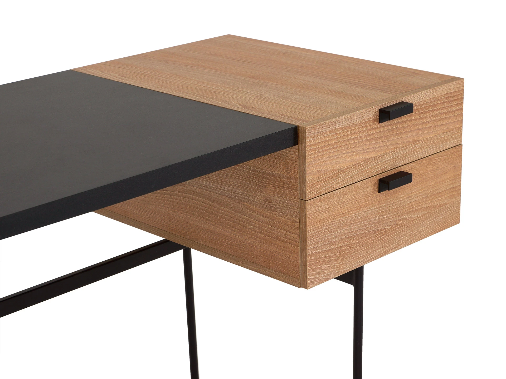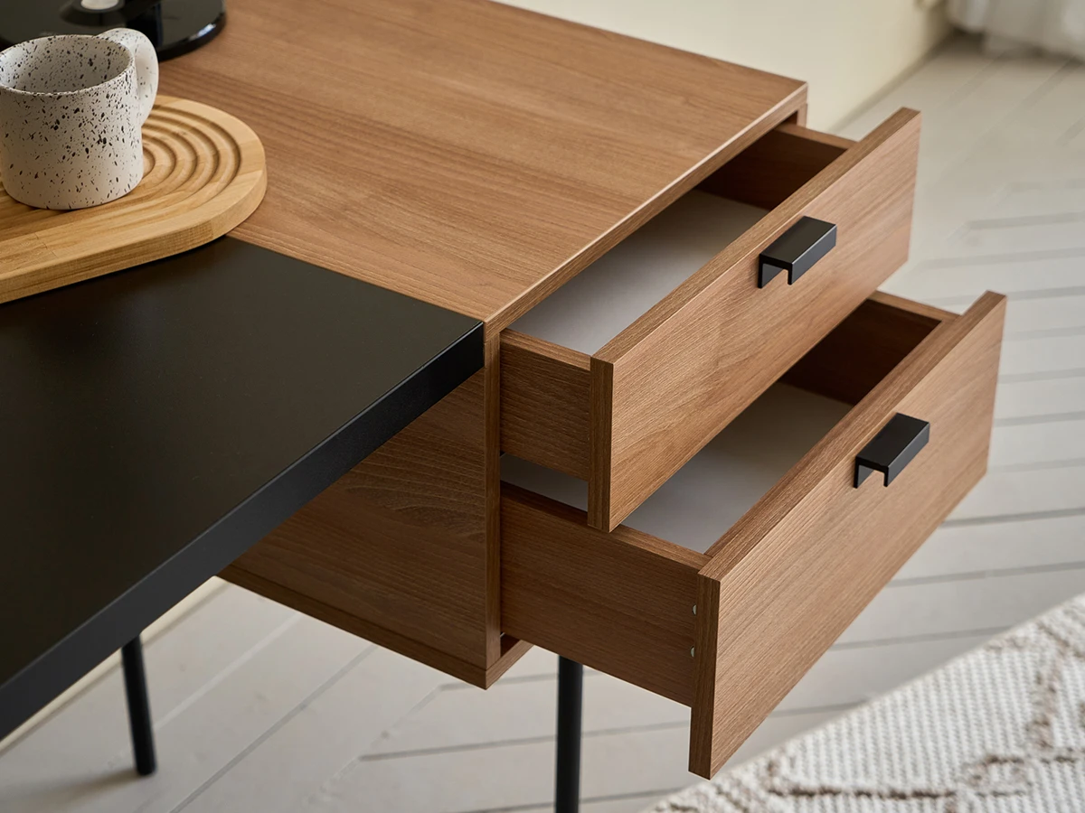 Столешница и тумба стола выполнены из ЛДСП толщиной 32 мм. и 16 мм. Стол имеет два ящики на направляющих скрытого монтажа с плавным закрыванием. Основание стола - сварная металлоконструкция черного матового цвета. Ножки круглые из трубы диаметром 20 мм. с пластиковыми подпятниками. Тумба всегда располагается справа, переустановка невозможна.