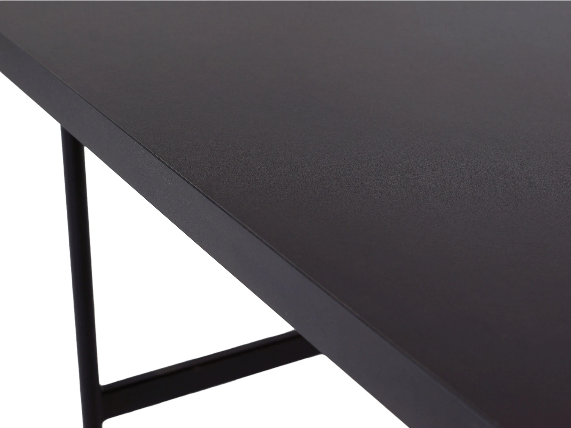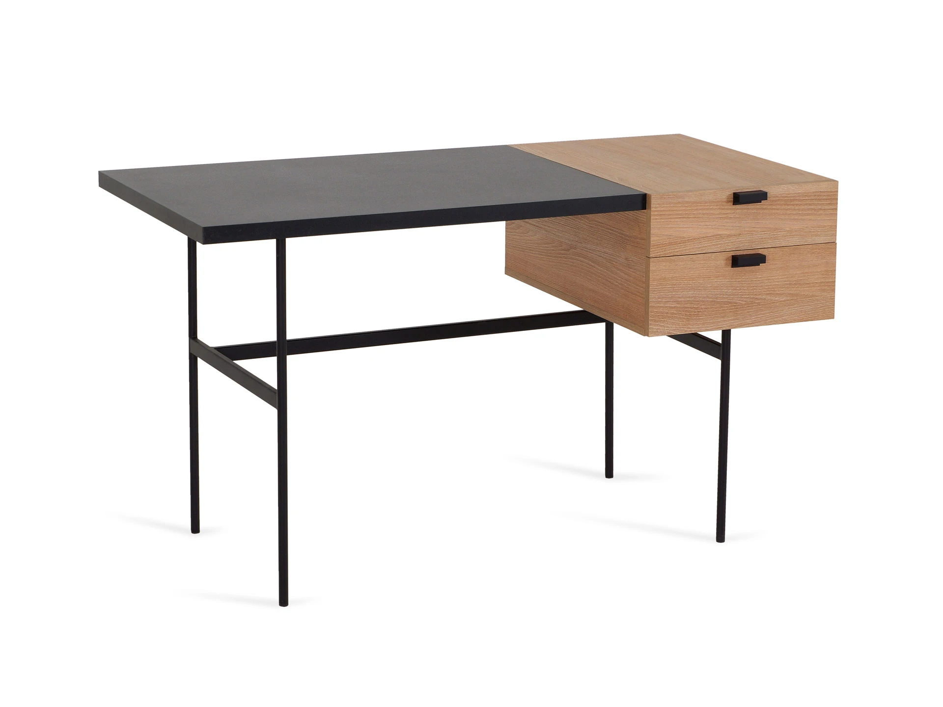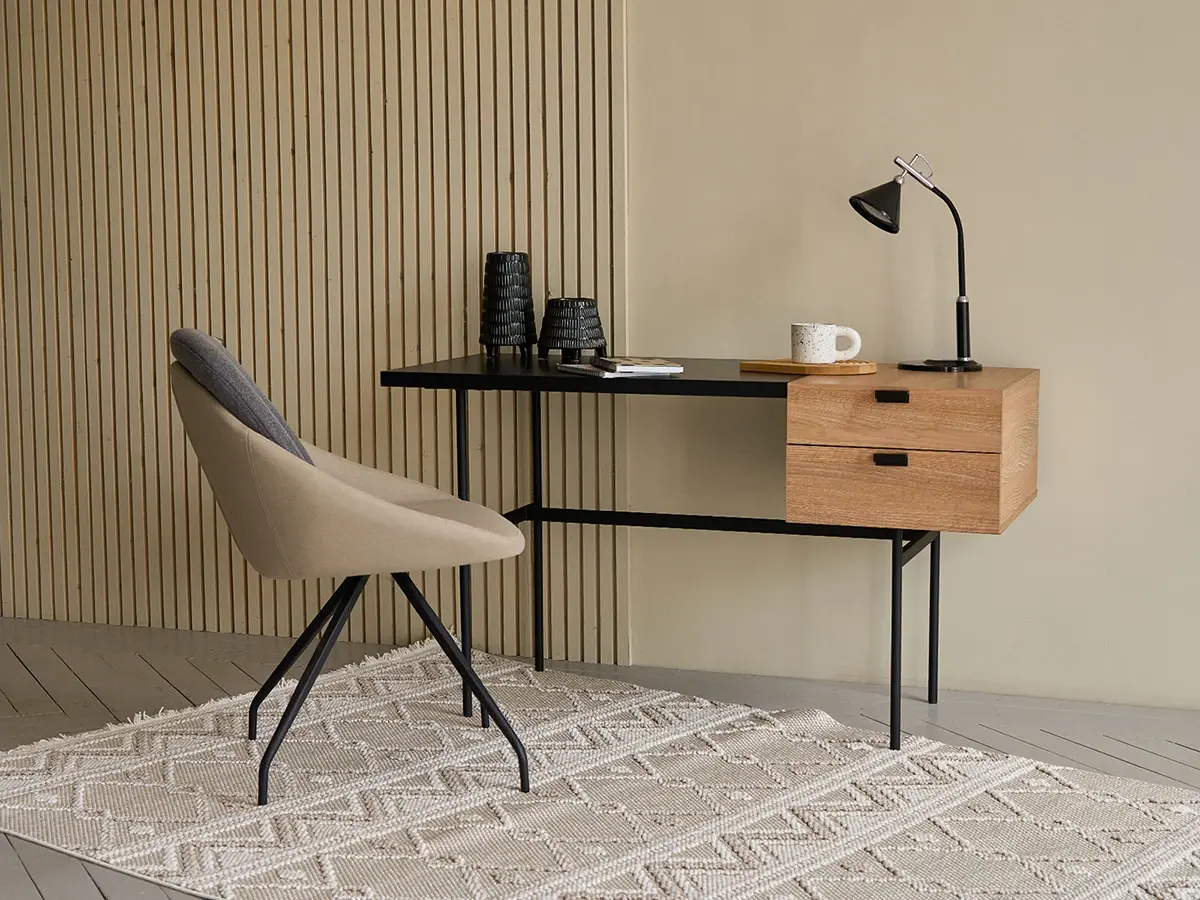 Столешница и тумба стола выполнены из ЛДСП толщиной 32 мм. и 16 мм. Стол имеет два ящики на направляющих скрытого монтажа с плавным закрыванием. Основание стола - сварная металлоконструкция черного матового цвета. Ножки круглые из трубы диаметром 20 мм. с пластиковыми подпятниками. Тумба всегда располагается справа, переустановка невозможна.