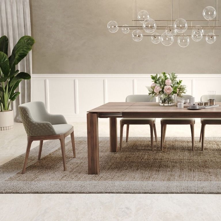 Прямоугольная форма раскладного стола Aron идеально подходит для современных интерьеров, обеспечивая достаточное пространство для комфортного размещения гостей и семейных трапез. Столешница выполнена из шпона, что придает изделию элегантный внешний вид и делает его устойчивым к царапинам и другим механическим повреждениям. Столешница также обеспечивает легкость в уходе, не требуя особых усилий для поддержания чистоты.