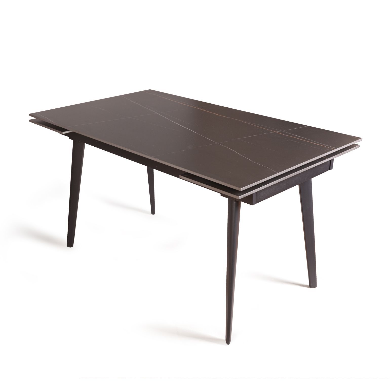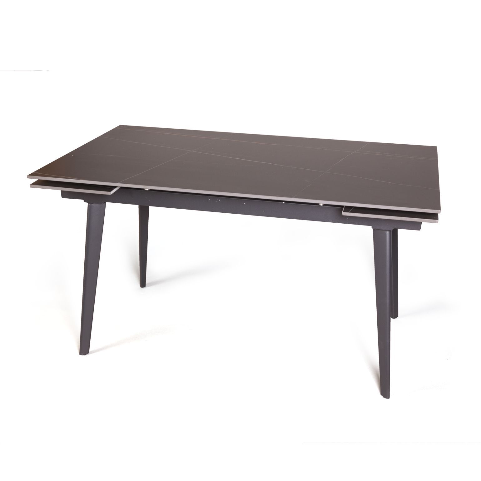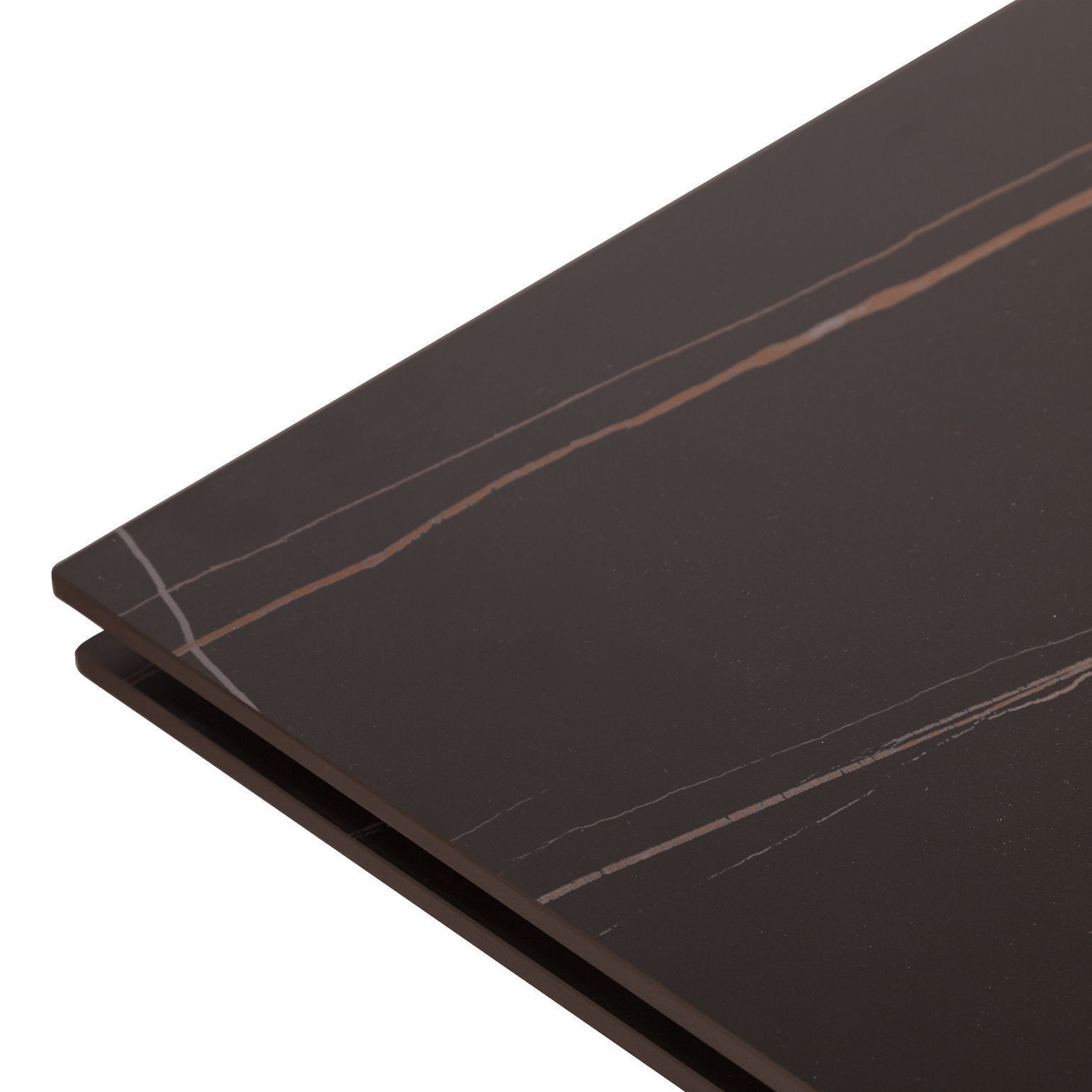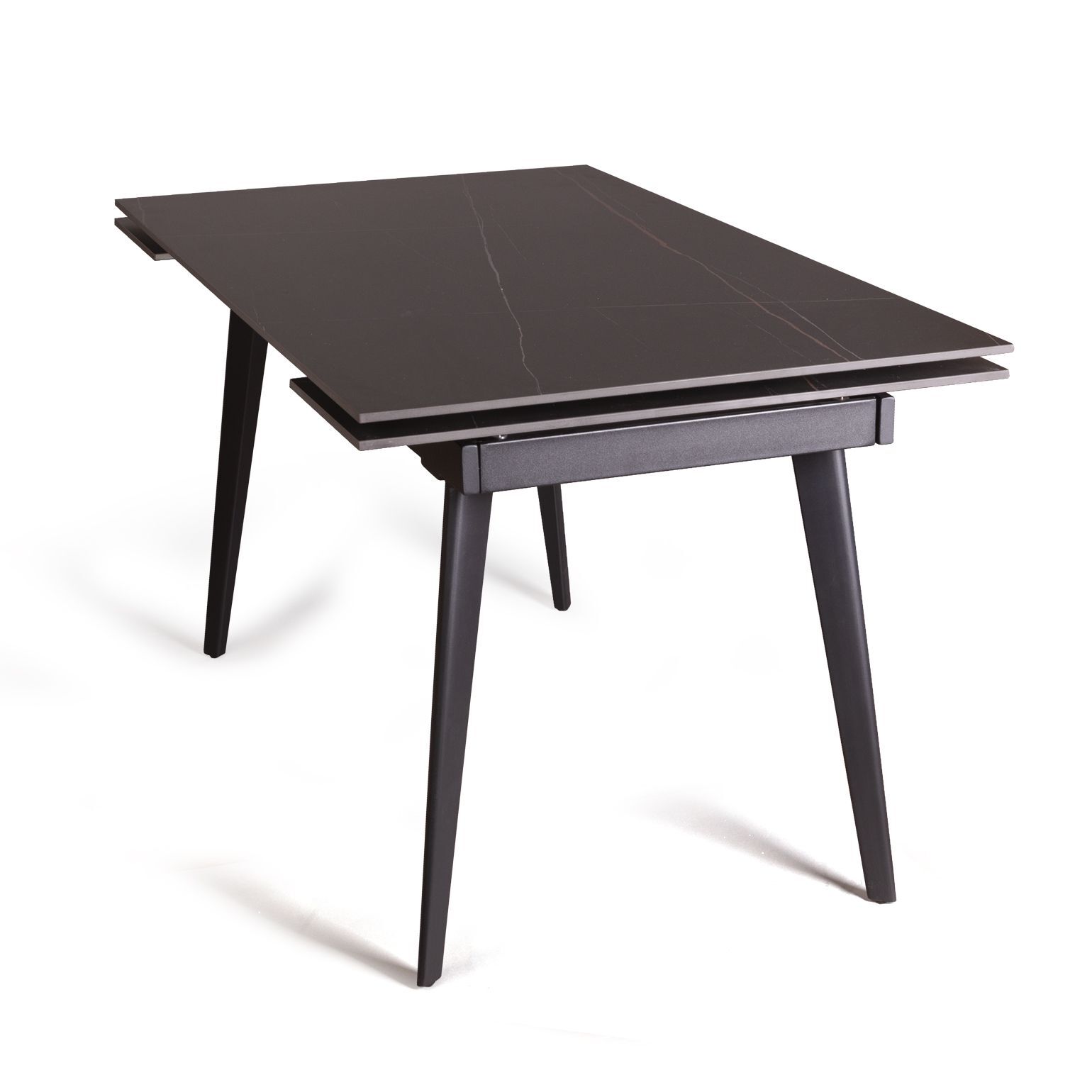 Керамическая столешница с рисунком мрамор идеально сочетается с остроконечными опорами, выполненными в черном цвете. Толщина столешницы 12 мм. (прослужит вам долгое время и не потеряет свой внешний вид). Стол смотрится легко, изящно, стильно и, конечно, станет украшением любого интерьера.