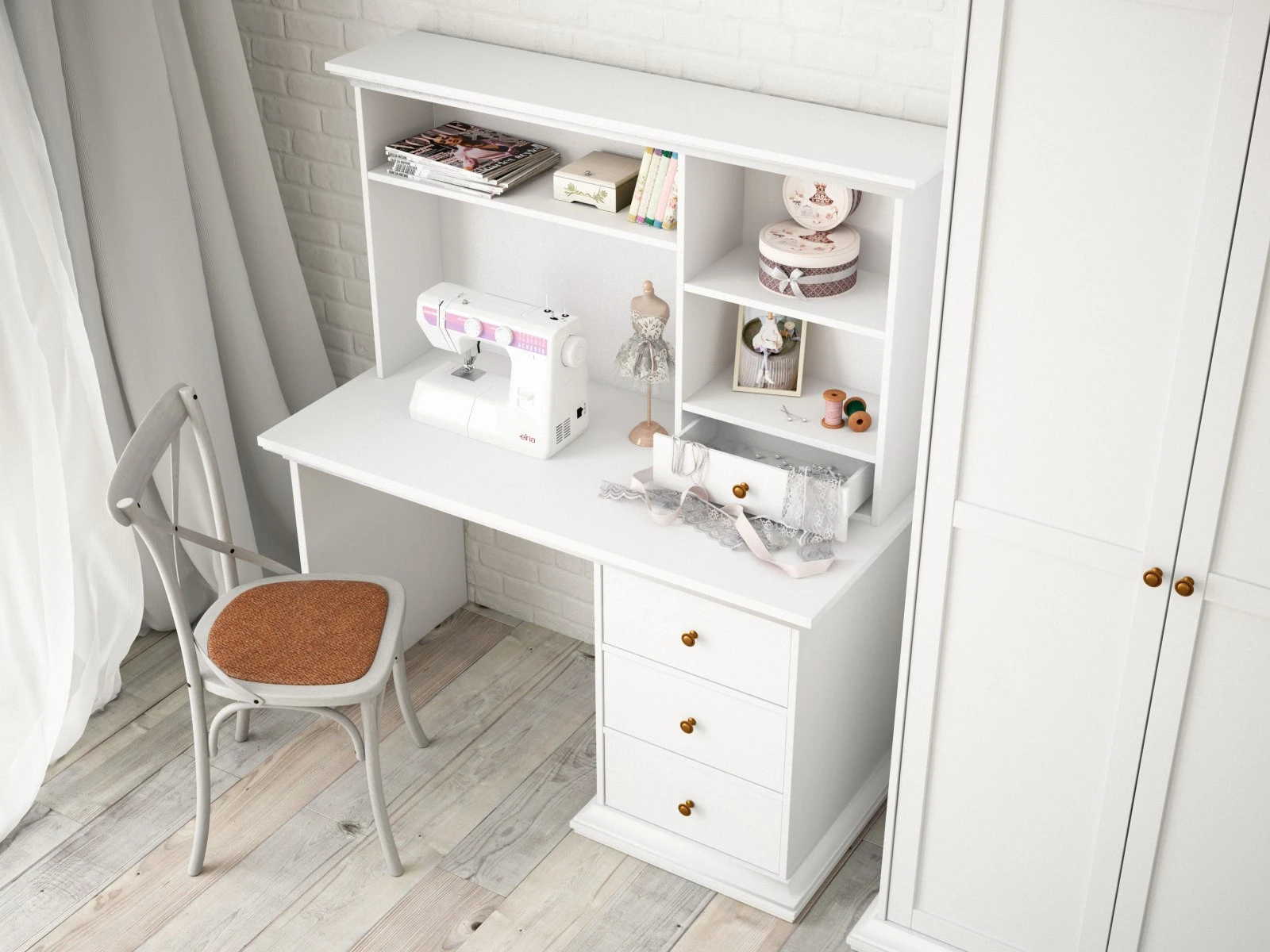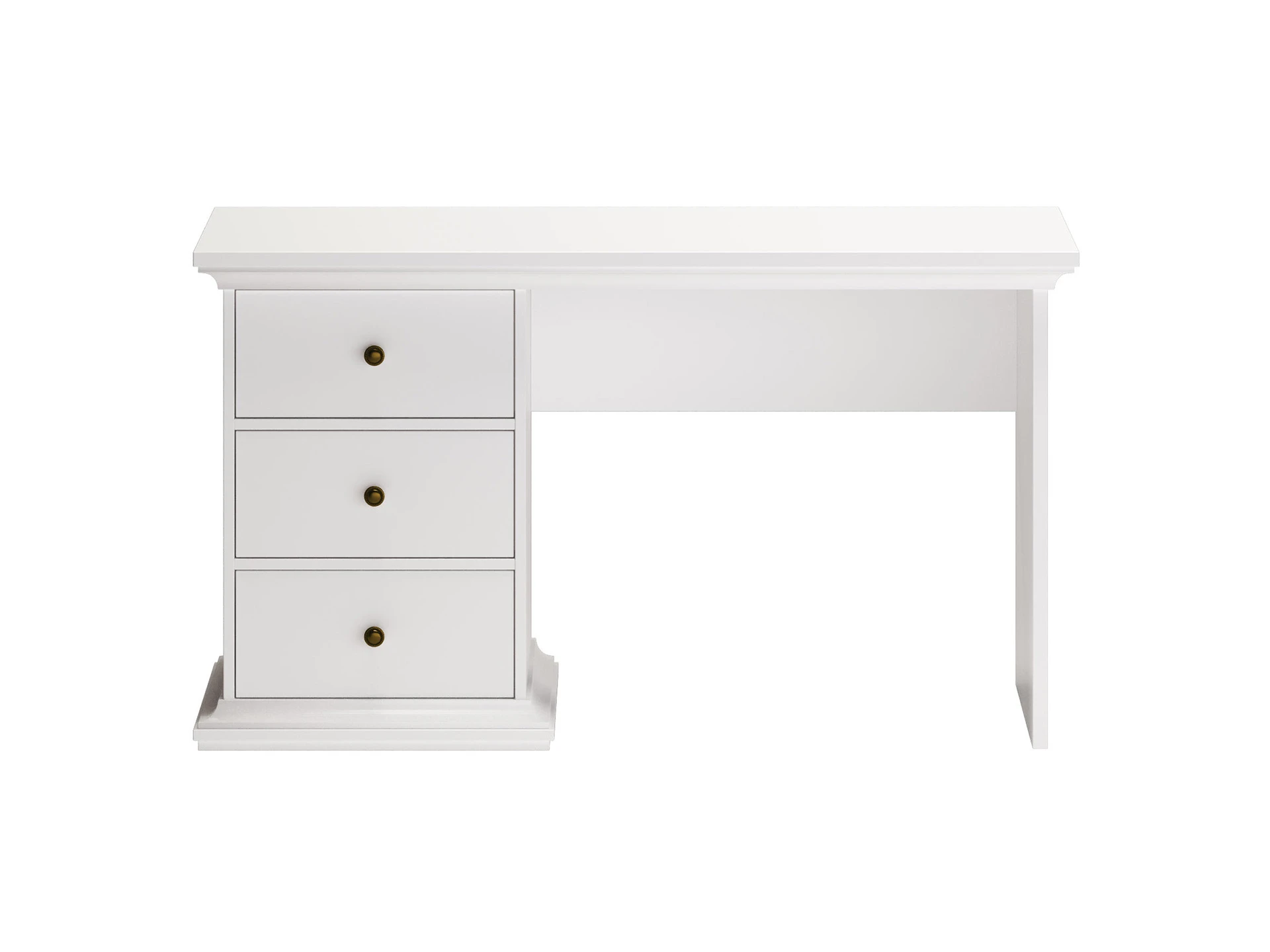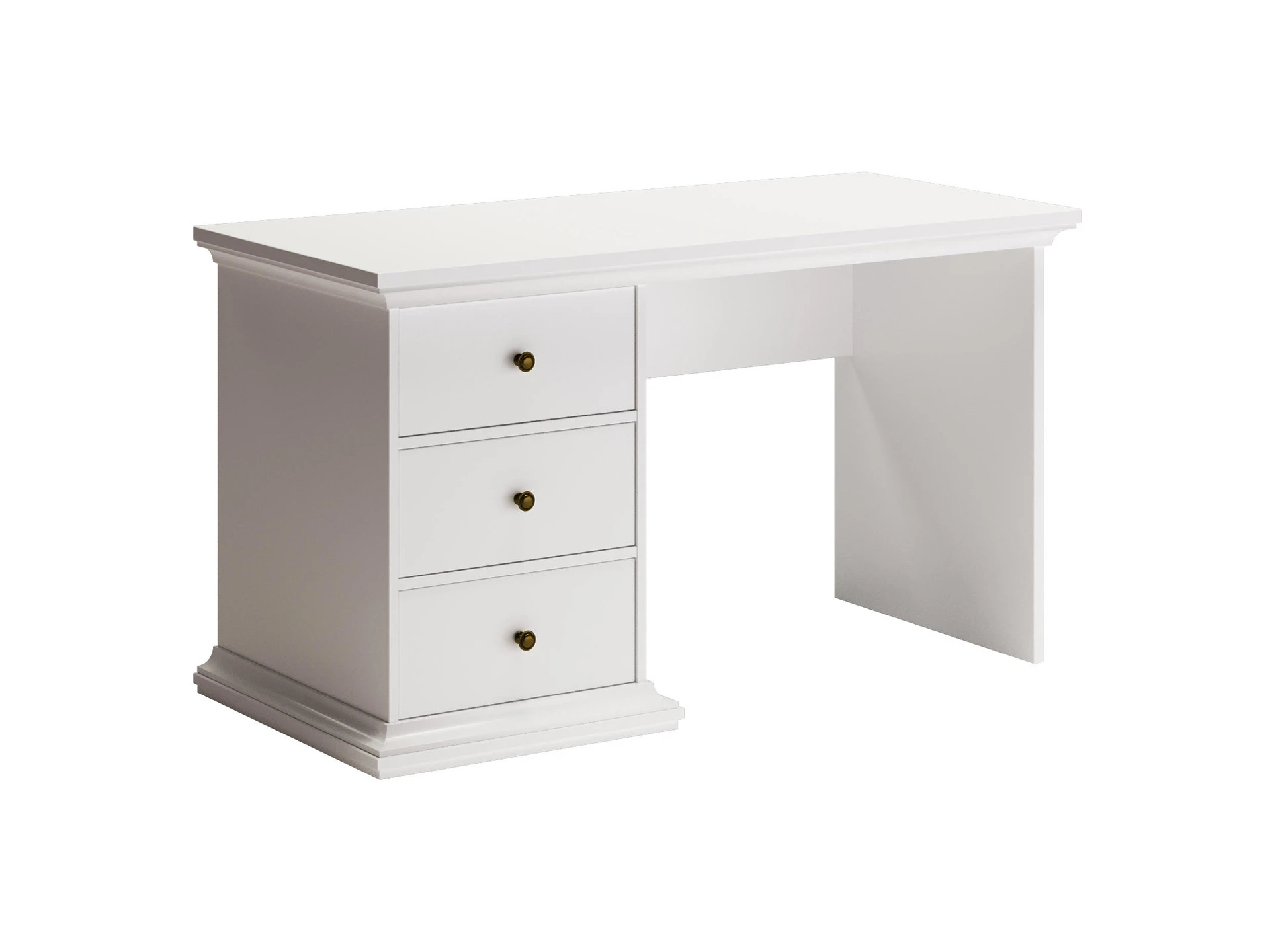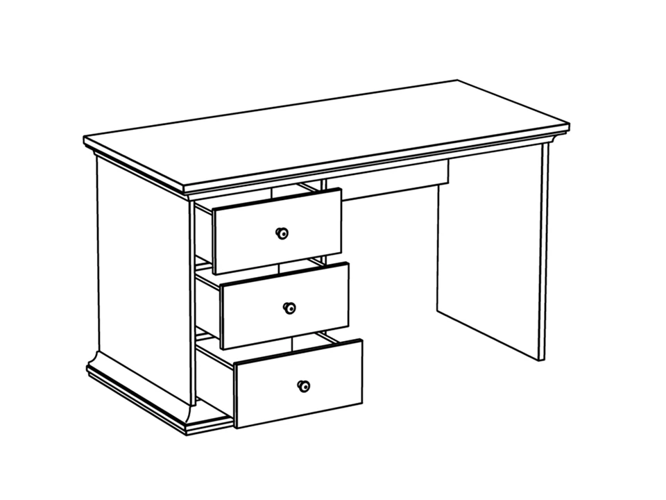 Стол с тумбой и тремя выдвижными ящиками. Стол может быть собран с правым или левым расположением тумбы с ящиками.