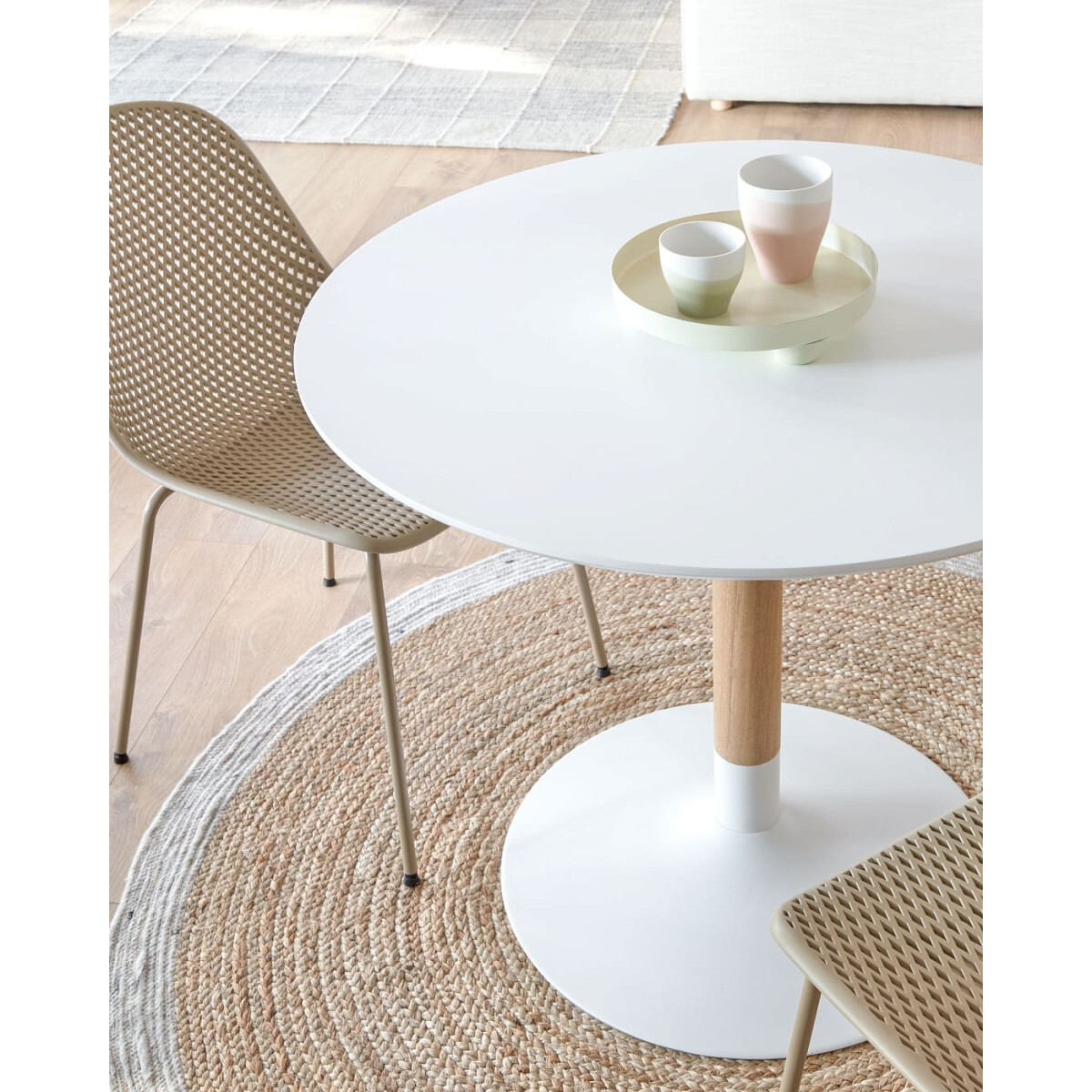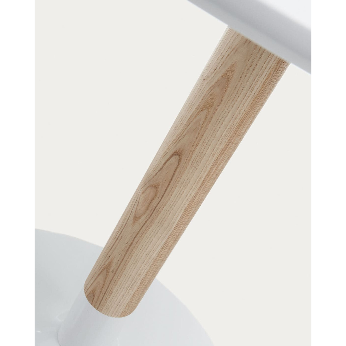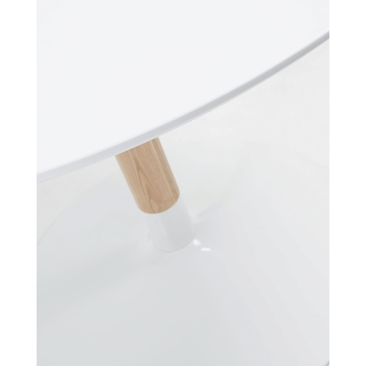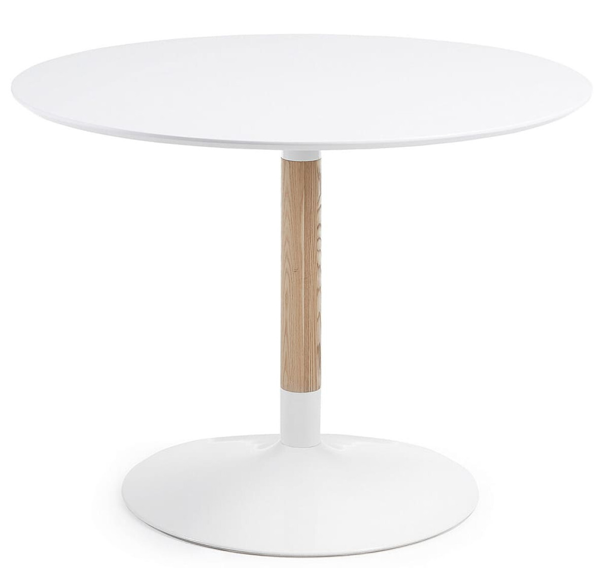Стол полностью выполнен из дерева. Круглая столешница толщиной 1,8 см покрыта белой матовой краской (цвет изделия указан для базовой модели). Она опирается на стойку диаметром 8 см, имеющую в своем основании диск диаметром 60 см. Стойка имеет натуральный цвет и покрыта лаком для защиты от влаги, загрязнений. Диск обеспечивает устойчивость изделия на любом напольном покрытии, а также правильное распределение его веса.