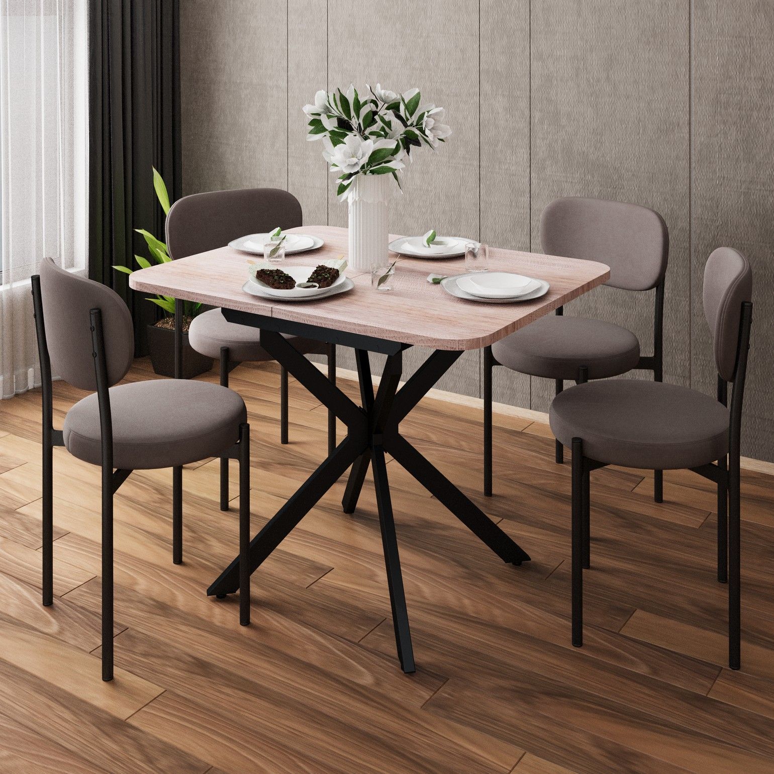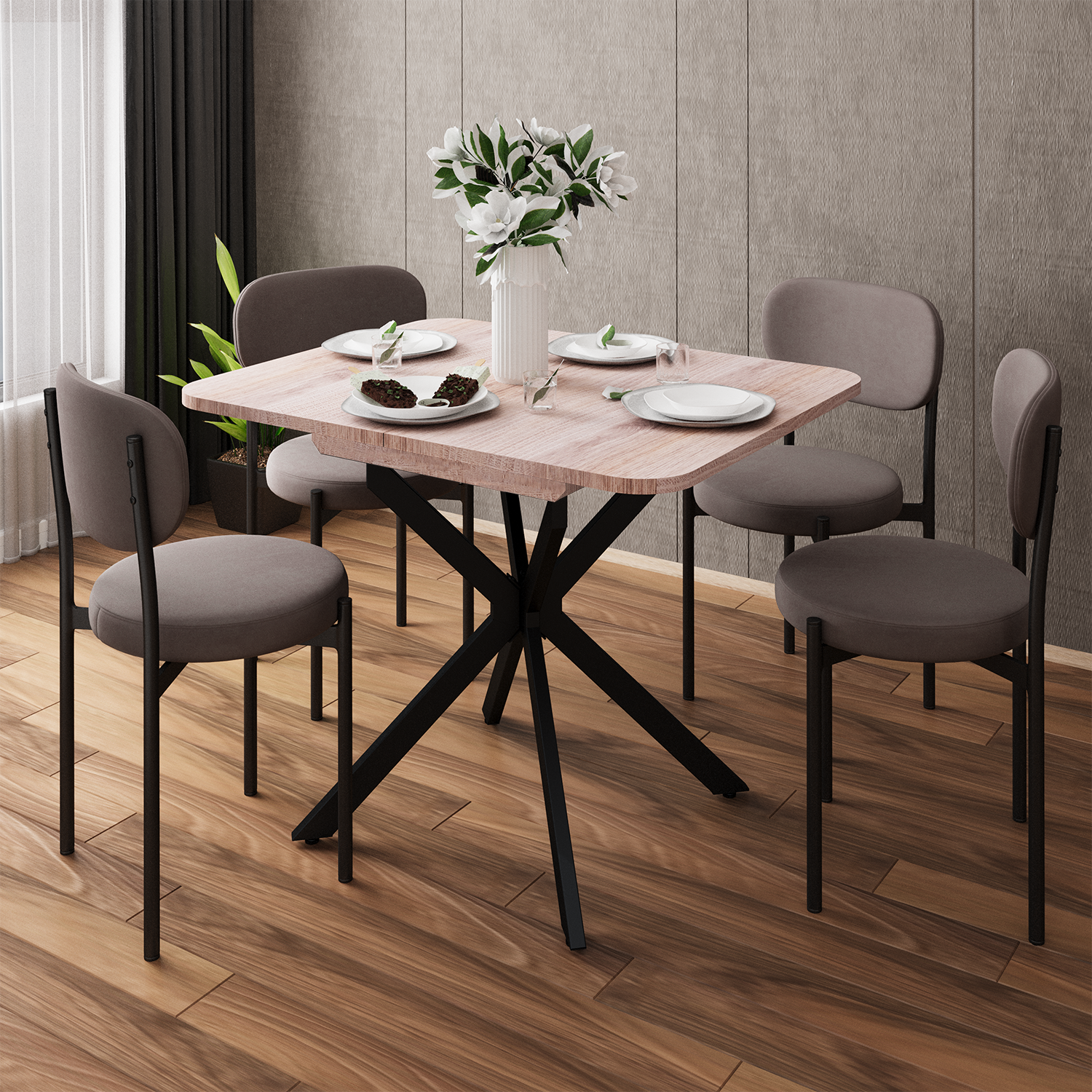 Раздвижной обеденный стол Твист разработан для малогабаритных кухонь и квартир-студий: в сложенном виде компактный и не занимает пространство, при необходимости легко раскладывается для гостей. Особая форма опоры позволяет беспрепятственно задвигать стулья под стол, делая посадку удобной. Модель выглядит актуально благодаря чистым линиям, спокойной текстуре столешницы «под дерево» и выразительной Х-образной опоре, которая и дала название линейке. h3Столешница/h3 Столешница выполнена из ЛДСП толщиной 22 мм. Материал устойчив к бытовым царапинам, обладает высокой ударопрочностью, легкий в уходе, долговечный и практичный. Форма столешницы с плавными скруглениями обеспечивает комфорт и безопасность при каждом использовании. Никаких выступающих углов — только продуманная геометрия, которая заботится о вас. h3Механизм трансформации/h3 Трансформация стола построена на синхронном принципе: обе половины столешницы расходятся одновременно, сохраняя идеальную геометрию. Центральная вставка-«бабочка» шириной 30 см плотно фиксируется между ними, исключая люфт и перепады высоты. В разложенном виде стол выглядит монолитно, а механизм не доставляет хлопот при каждой сборке. Вставка повторяет цвет и фактуру столешницы, благодаря этому конструкция выглядит монолитно: переход от столешницы к опорам визуально сглажен, а общий вид остается максимально аккуратным и продуманным. h3Опоры/h3 Металлические опоры стола окрашены методом порошковой окраски. Это обеспечивает высокую стойкость покрытия: оно не боится коррозии, сколов и царапин, сохраняя безупречный вид долгие годы. Чтобы исключить деформацию и продлить срок службы, предусмотрено дополнительное усиление опор в точках изгиба. Возможность регулировки опор по высоте компенсирует перепады и обеспечивает идеальную устойчивость на любом напольном покрытии. h3Гарантия/h3 Продленная гарантия 36 месяцев на металлокаркас: дополнительная защита вашей покупки и подтверждение качества. h3Модификации стола/h3 Модели и размеры: круглый 90(120)х90 или прямоугольный 100(130)х80; Столешница (лдсп): дуб эндгрейн / цемент светлый / камень тёмный; Опора: черный муар или белый муар.