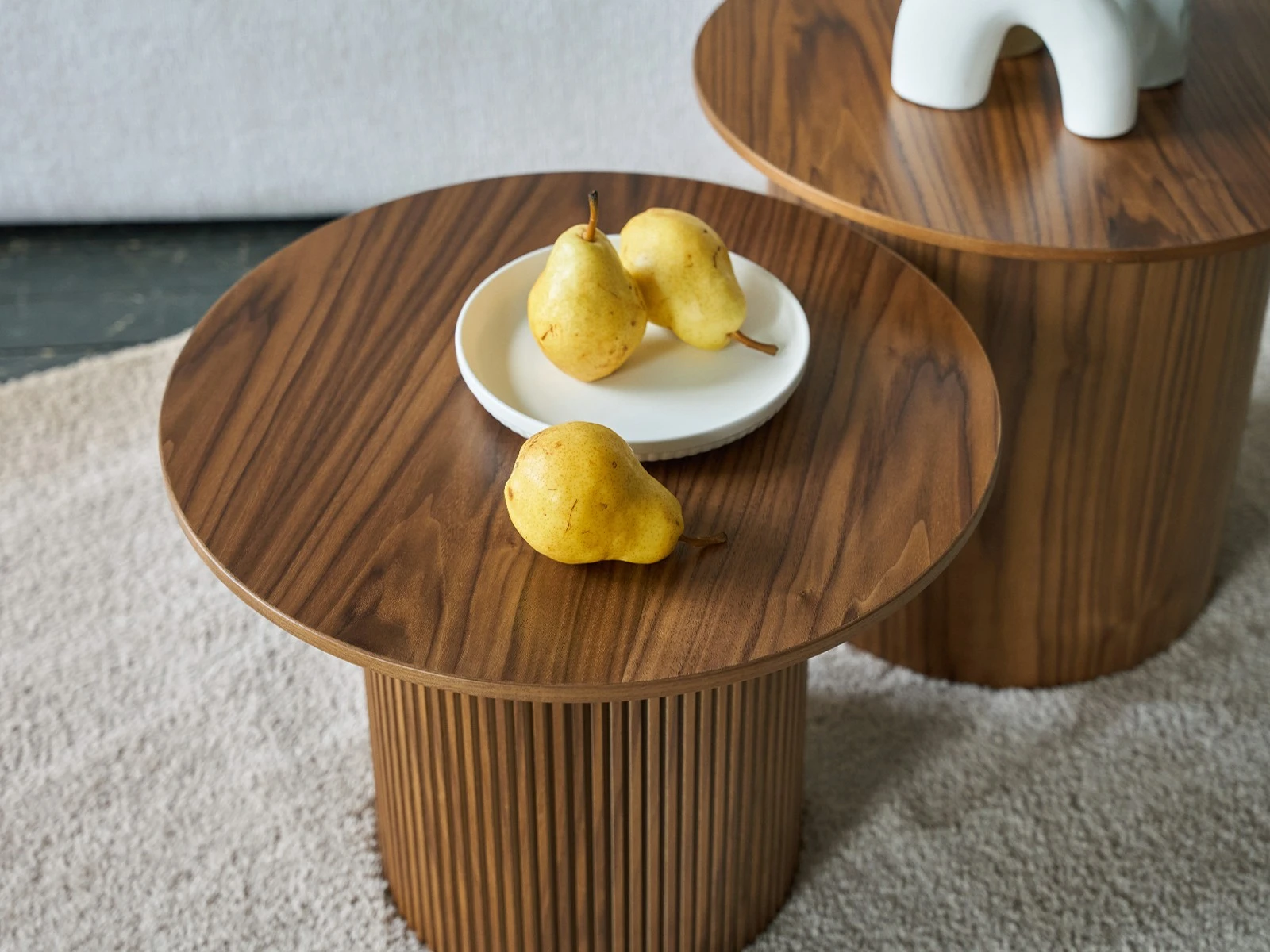 Дизайн сфокусирован на контрастном взаимодействие фактур. Цилиндрическое основание с «гофрированной поверхностью» поддерживает гладкую круглую столешницу. Рельефные углубления на ножке придают динамичности, выразительности, эффектности. С этим столиком можно создавать вариативные интерьерные комбинации, которые подчеркнут индивидуальный характер пространства. Красивый естественный рисунок внесёт в пространство частичку природной энергии. Уместен будет в любой локации от диванной зоны до спальни.