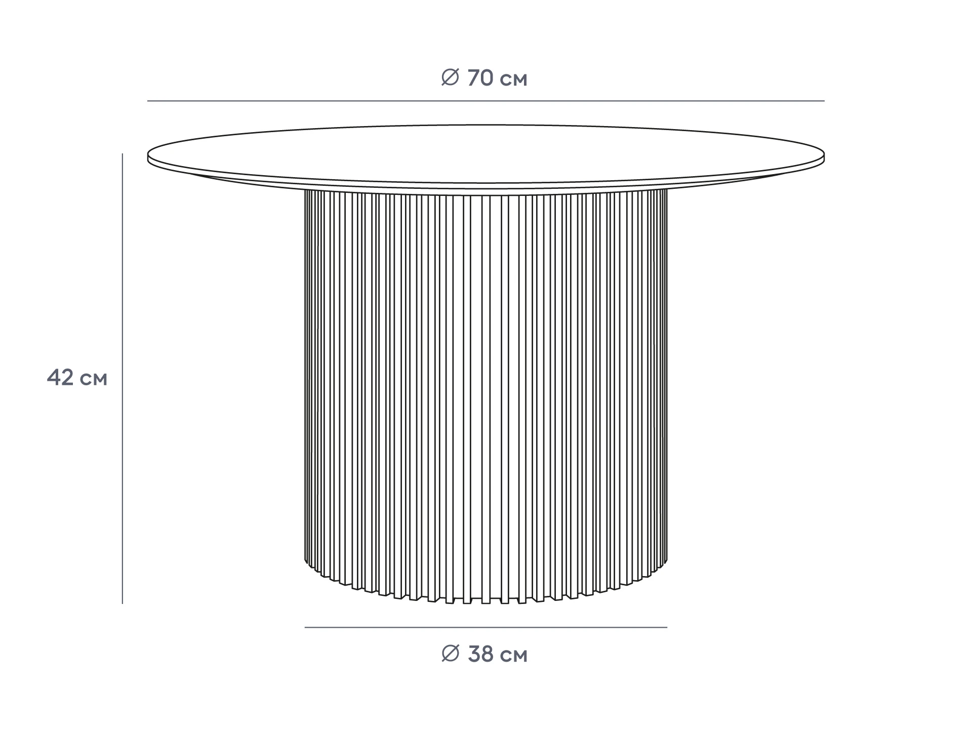Дизайн сфокусирован на контрастном взаимодействие фактур. Цилиндрическое основание с «гофрированной поверхностью» поддерживает гладкую круглую столешницу. Рельефные углубления на ножке придают динамичности, выразительности, эффектности. С этим столиком можно создавать вариативные интерьерные комбинации, которые подчеркнут индивидуальный характер пространства. Красивый естественный рисунок внесёт в пространство частичку природной энергии. Уместен будет в любой локации от диванной зоны до спальни.
