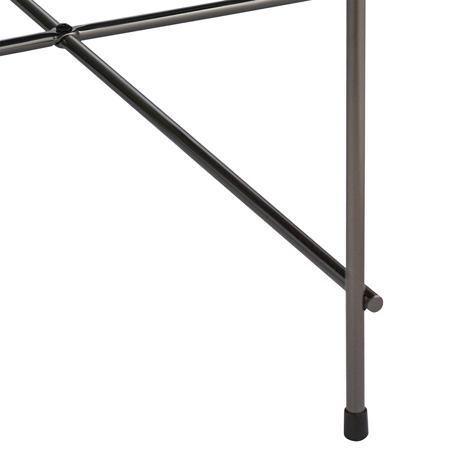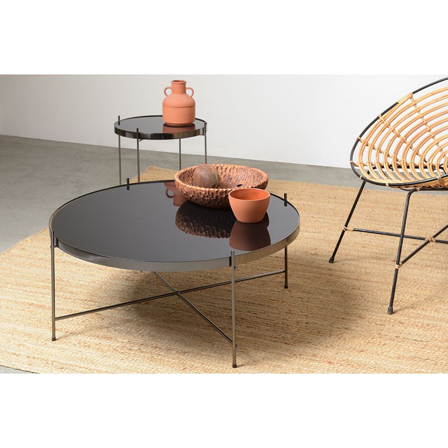 Материалы: столешница – черное закаленное стекло, каркас – сталь. Размеры: диаметр – 42,7 см, высота – 43 см.
