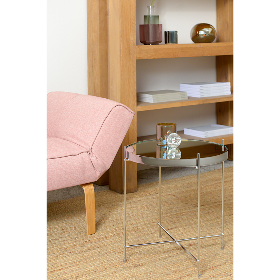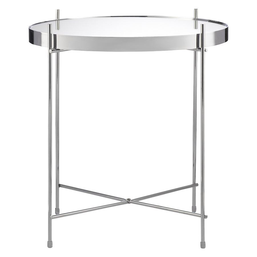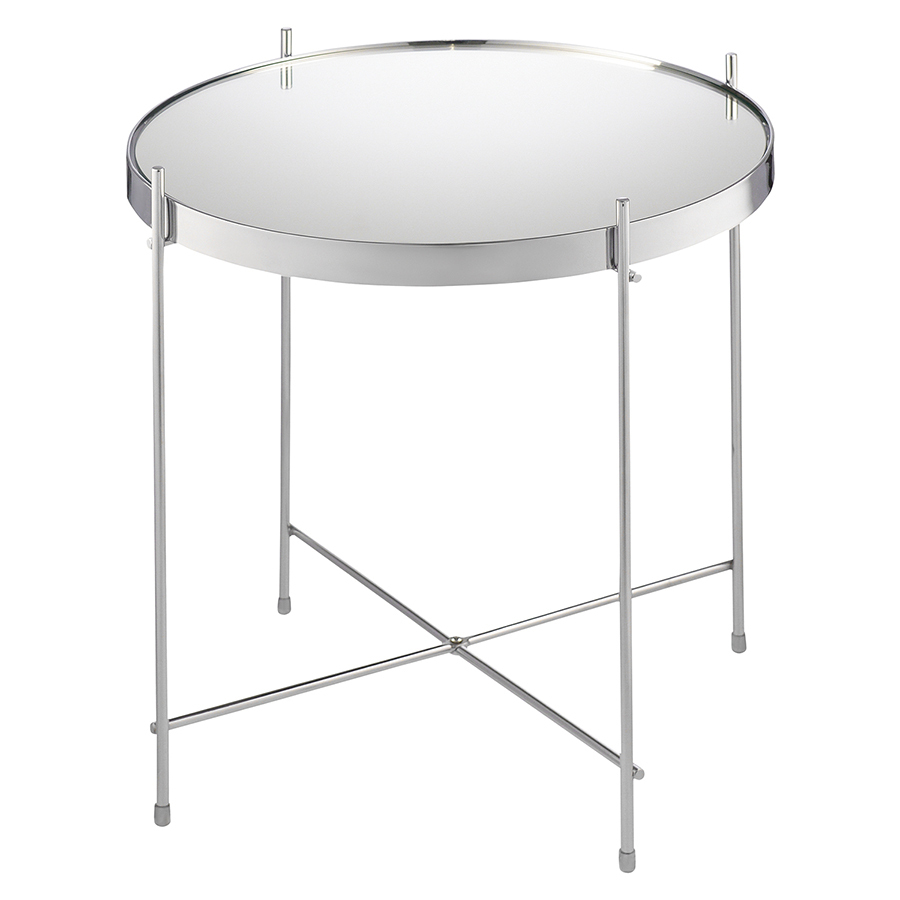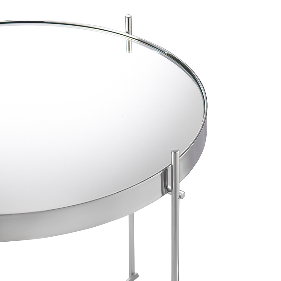 Материалы: столешница – серебряное зеркало, каркас – сталь с хромовым напылением. Размеры: диаметр – 42,7 см, высота – 45 см.