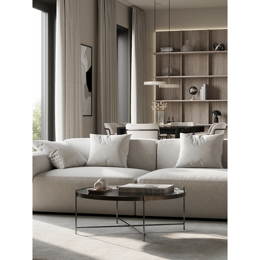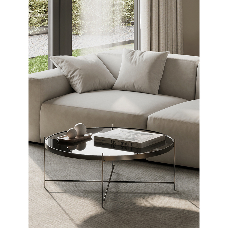 Материалы: столешница – черное закаленное стекло, каркас – сталь с покрытием черный никель. Размеры: диаметр – 84,8 см, высота – 33 см.