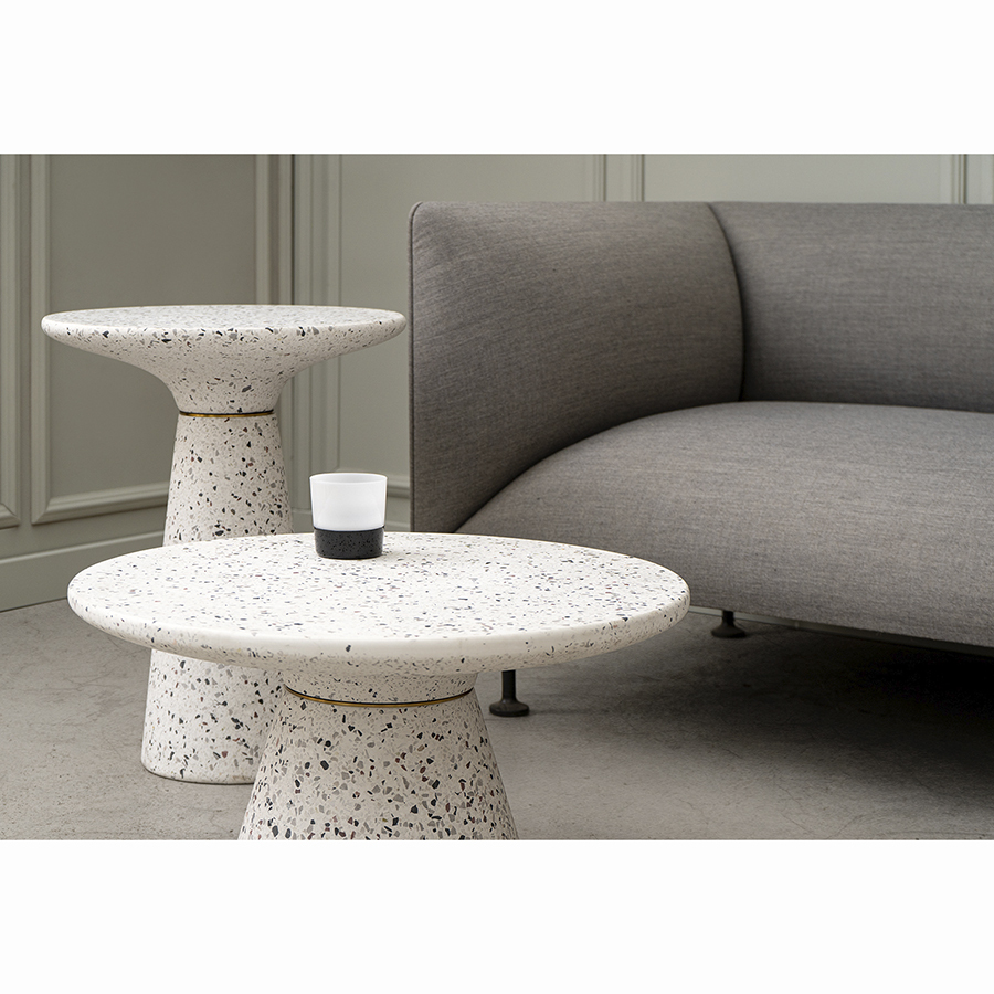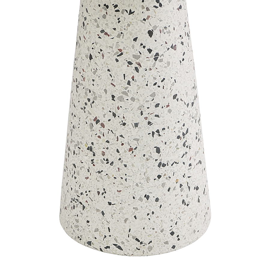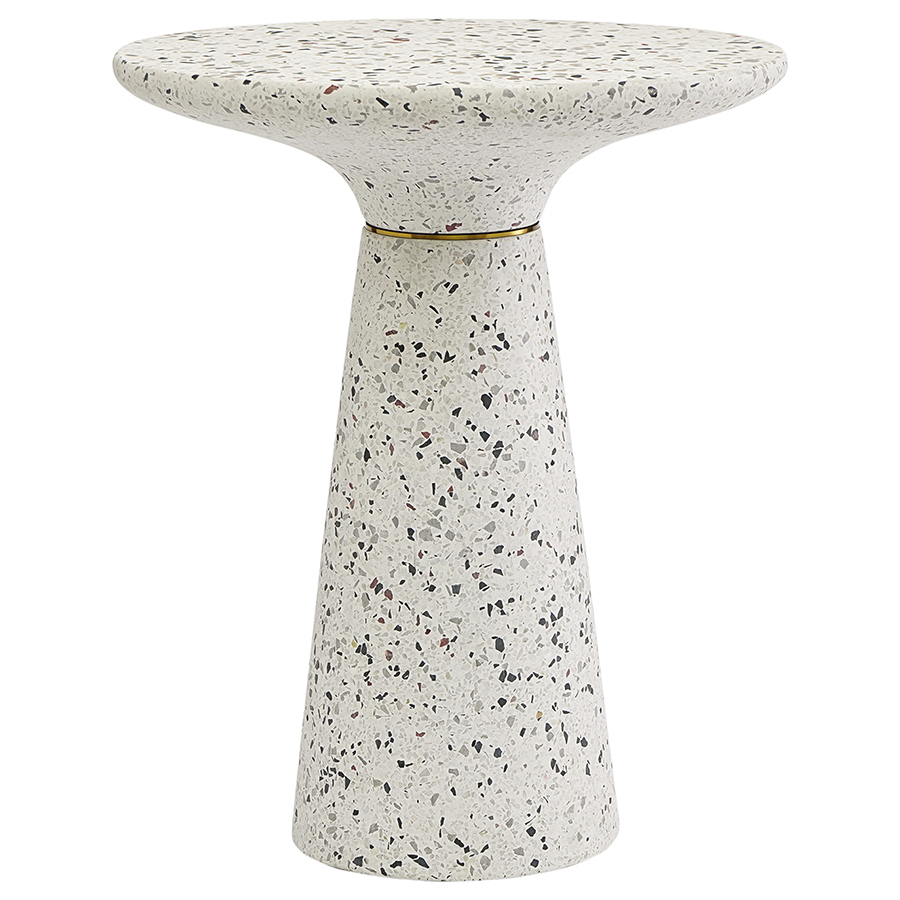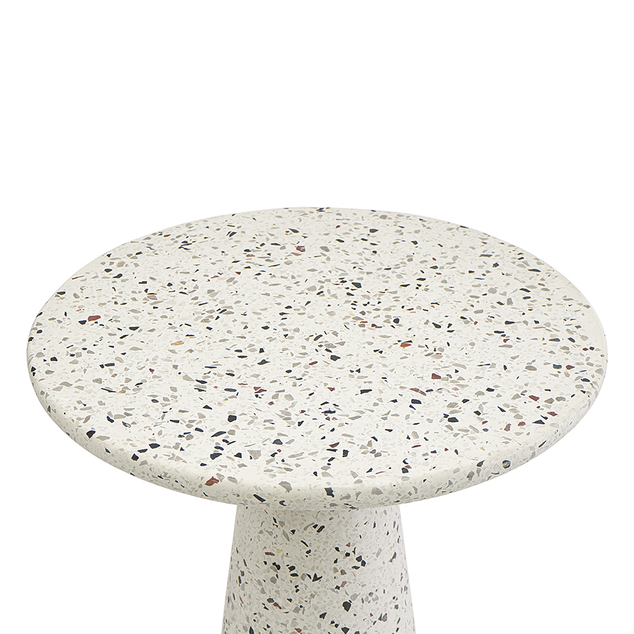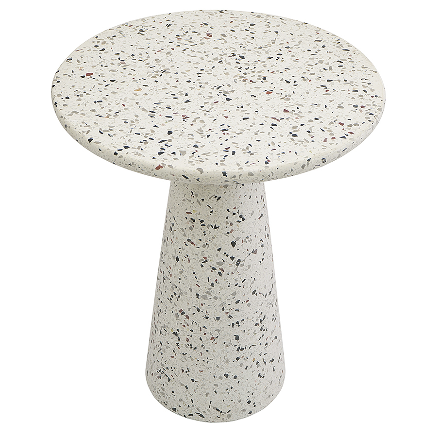 Столешница и основание столика выполнены из материала терраццо, характеризующегося высокой прочностью и устойчивостью к износу. В его состав входят мелкие кусочки натурального камня, скрепленные цементным раствором с добавлением пластификаторов. Поверхность терраццо гладкая, приятная на ощупь, прекрасно смотрится и не требует сложного ухода. Столешница диаметром 45 см позволяет размещать все необходимое – чашки кофе, десерты и прочее. При этом модель имеет компактные размеры, что способствует экономии полезного пространства.