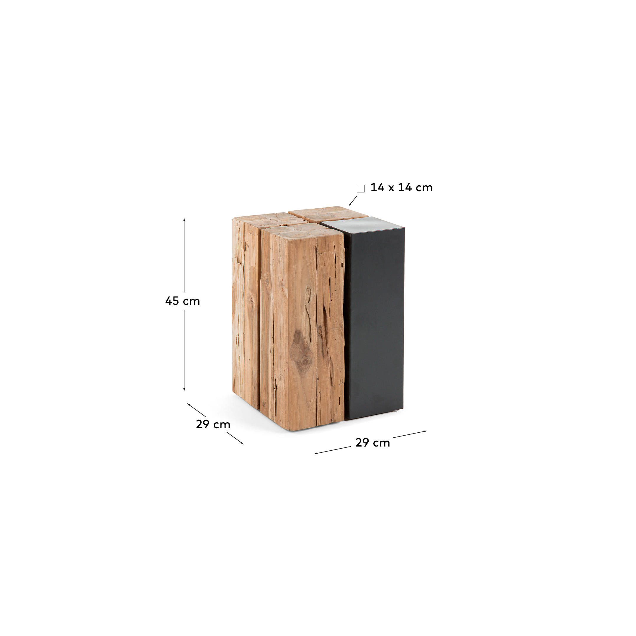 Столик имеет форму правильного параллелепипеда, состоящего из четырех одинаковых по своим габаритам брусков. Три выполнены из натурального тикового дерева и один изготовлен из металла. Размер каждого – 14 на 14 см.