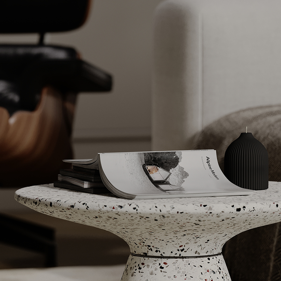Столешница и основание столика выполнены из материала терраццо, характеризующегося высокой прочностью и устойчивостью к износу. В его состав входят мелкие кусочки натурального камня, скрепленные цементным раствором с добавлением пластификаторов. Поверхность терраццо гладкая, приятная на ощупь, прекрасно смотрится и не требует сложного ухода. Столешница диаметром 60 см позволяет размещать все необходимое – от чашек кофе до любимых книг и декора. При этом модель имеет компактные размеры, что способствует экономии полезного пространства.