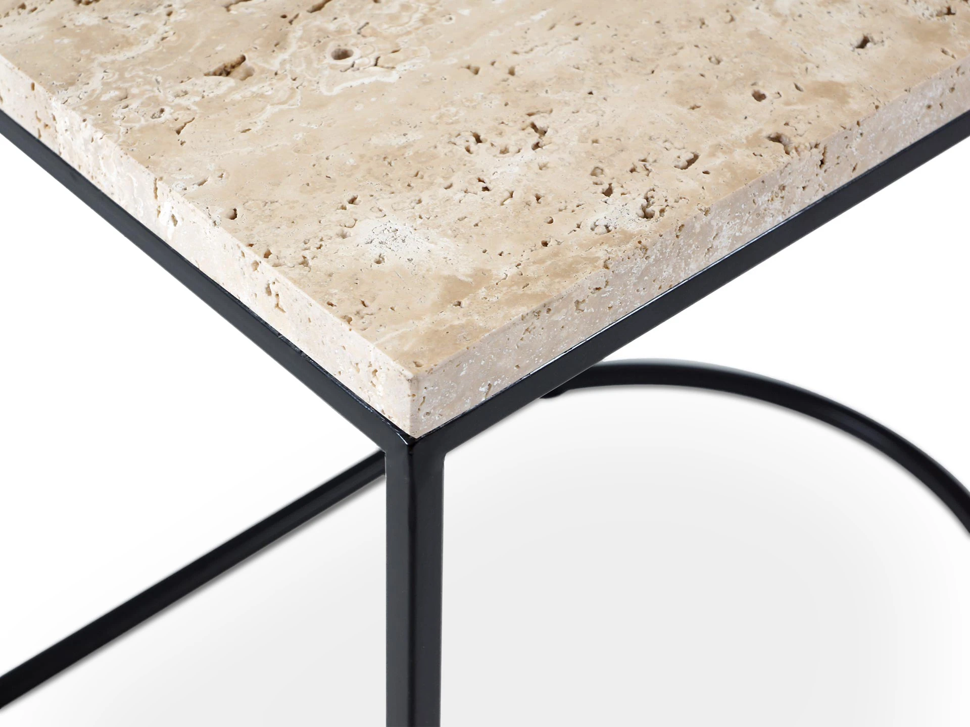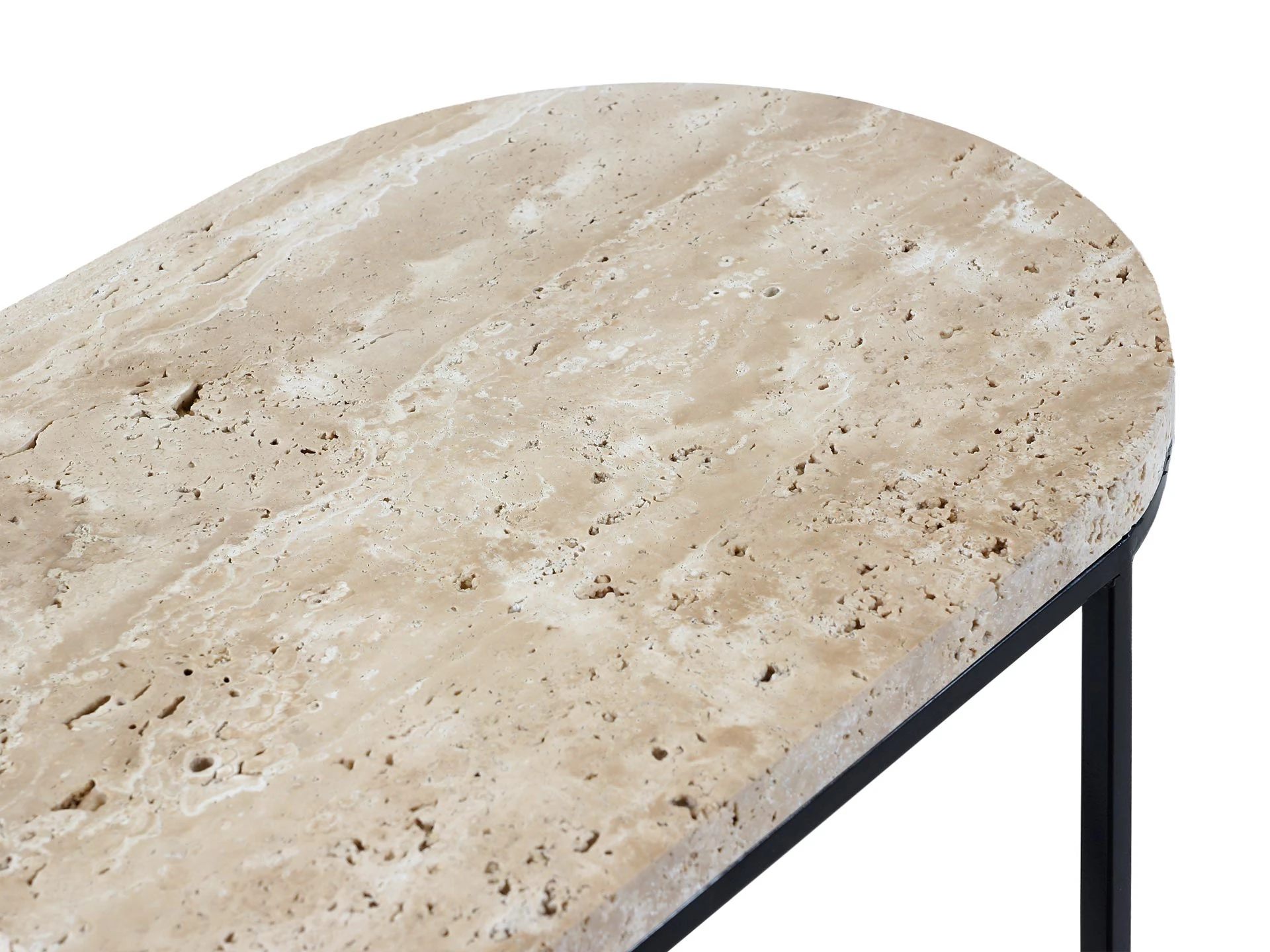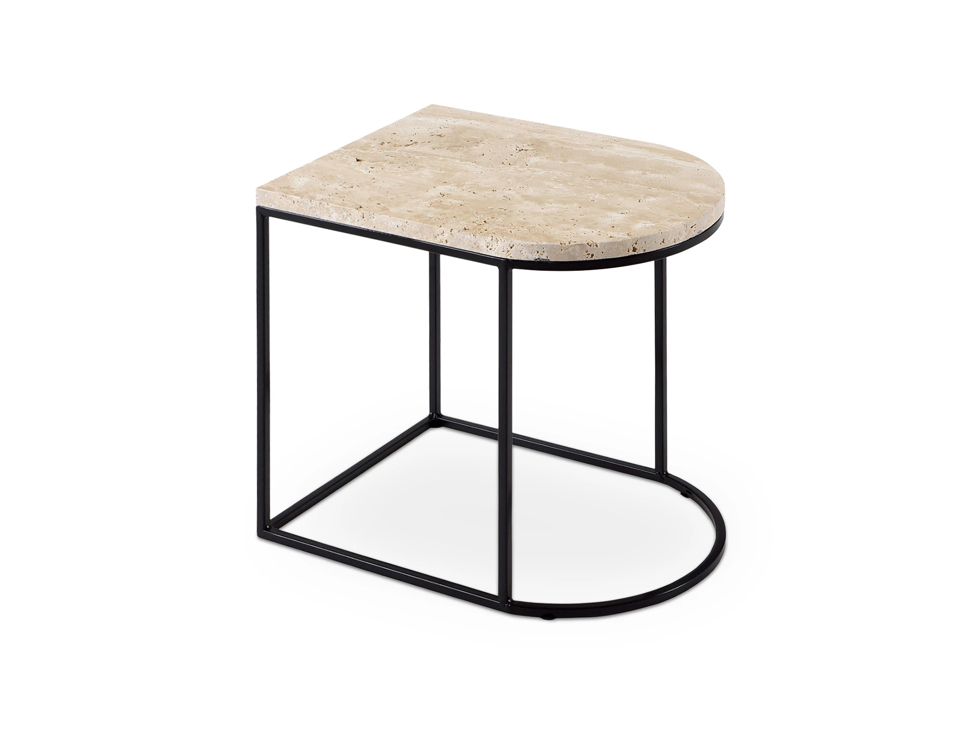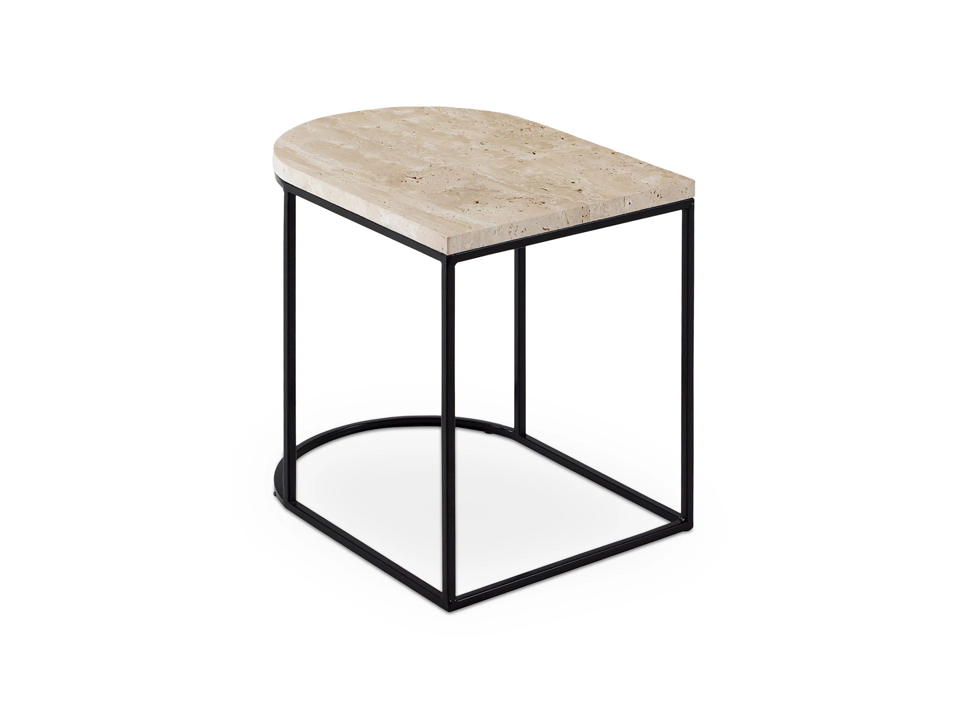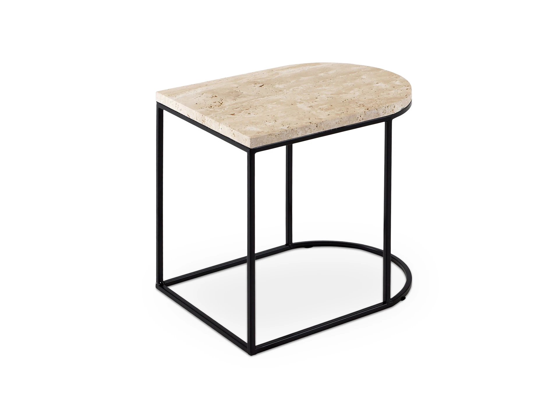 Материал столешницы - натуральный камень травертин, материал основания - металл черного матового цвета. Наличие подпятников, предохраняющие от появления царапин на полу.