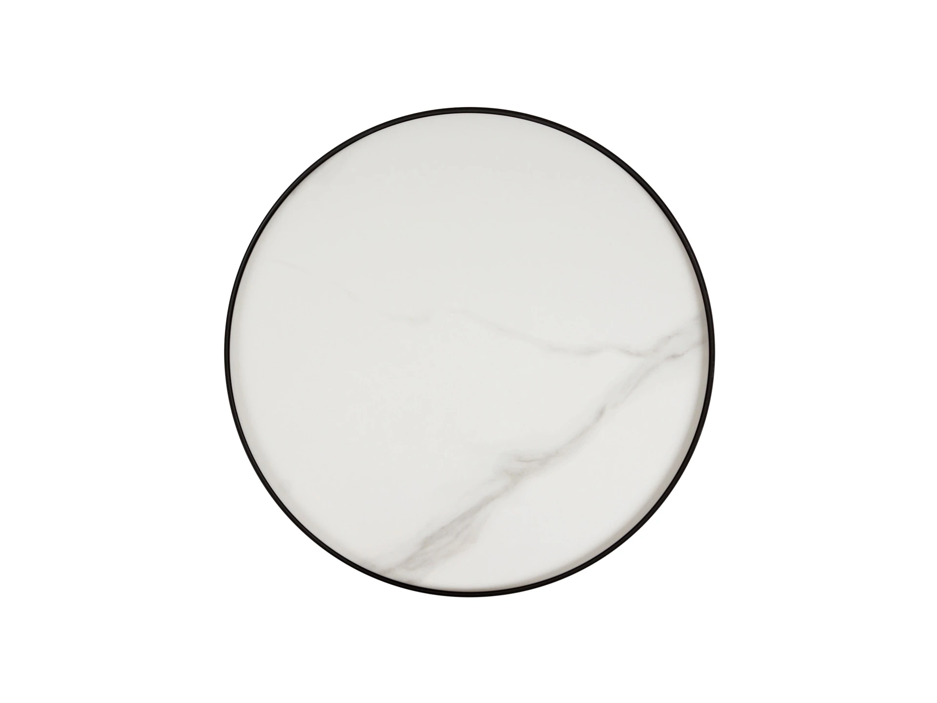 Материал столешницы - верхний слой из спеченного камня с фактурой под керамику на плите из МДФ, установленная на металлическое основание черного матового цвета круглой формы.
