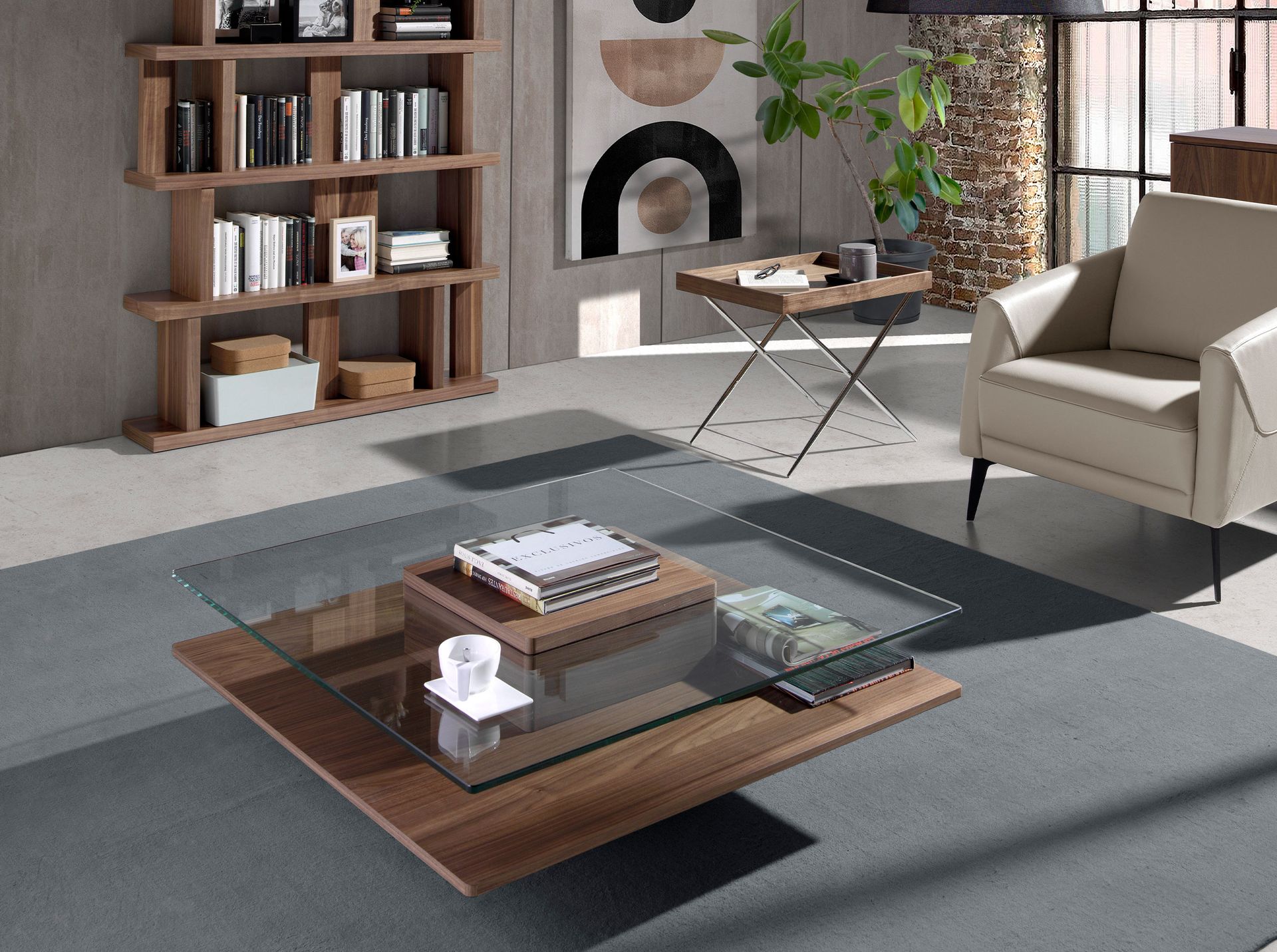 Столик квадратной формы, имеет сразу две столешницы. Верхняя выполнена из ударопрочного прозрачного стекла. Нижняя – из МДФ и шпона цвета орехового дерева (для базового фабричного варианта). Из этих же материалов сделаны и остальные элементы изделия. Два «этажа» разделяет квадратная опора. Она имеет достаточную площадь основания, чтобы обеспечить стойкость верхней столешницы к весовым нагрузкам. Вверху находится вторая часть «междуэтажной» опоры. Она служит плотным фиксатором для стекла, а также может быть использована в качестве декоративной подставки под посуду, предметы декора.