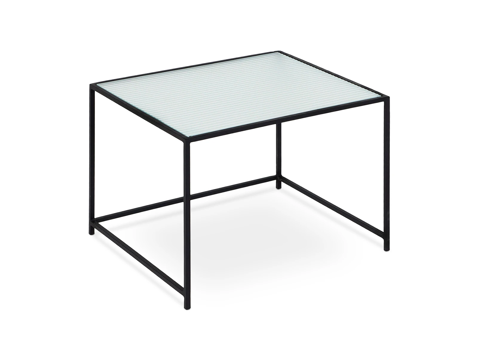 Каркас металлический с черным матовым покрытием. Стеклянная столешница выполнена из прозрачного рифленого стекла. Столешница укладывается сверху на резиновые демпферы, расположенные в углах каркаса.