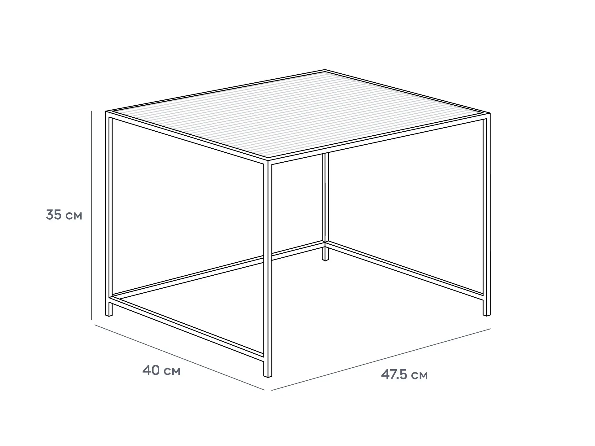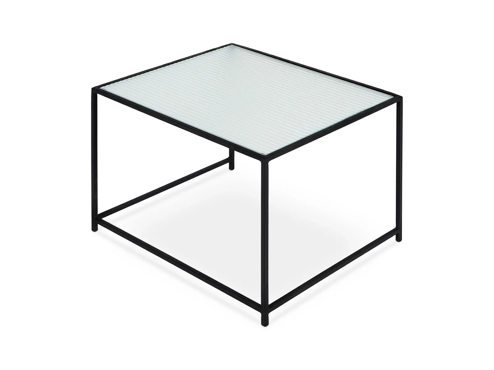 Каркас металлический с черным матовым покрытием. Стеклянная столешница выполнена из прозрачного рифленого стекла. Столешница укладывается сверху на резиновые демпферы, расположенные в углах каркаса.