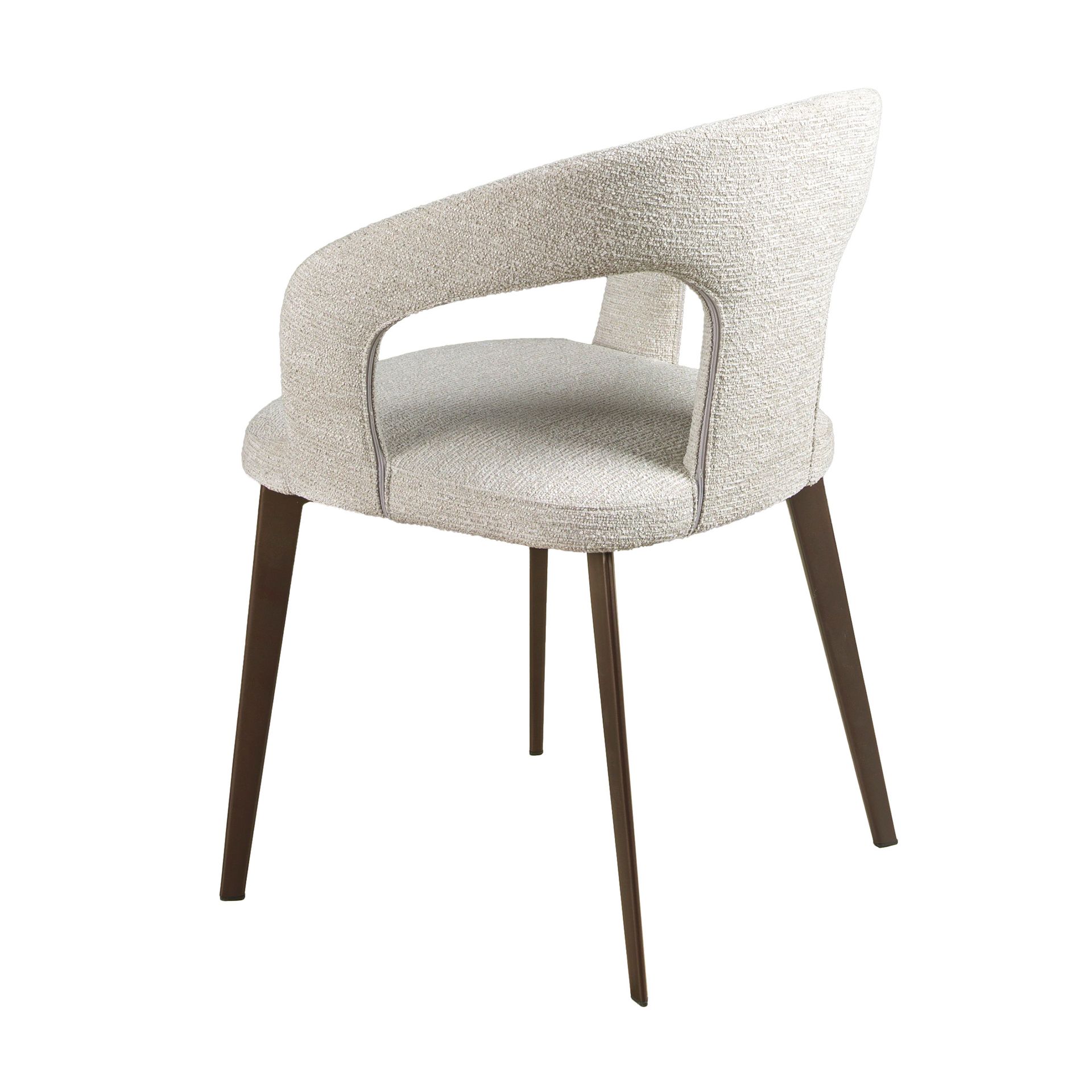 Стул с подлокотниками в современном дизайне с сиденьем и спинкой, обитыми тканью цвета слоновой кости . Его окрашенные в коричневый цвет стальные ножки с авангардным, но неподвластным времени стилем сделают его обязательным предметом на вашей кухне или в столовой.