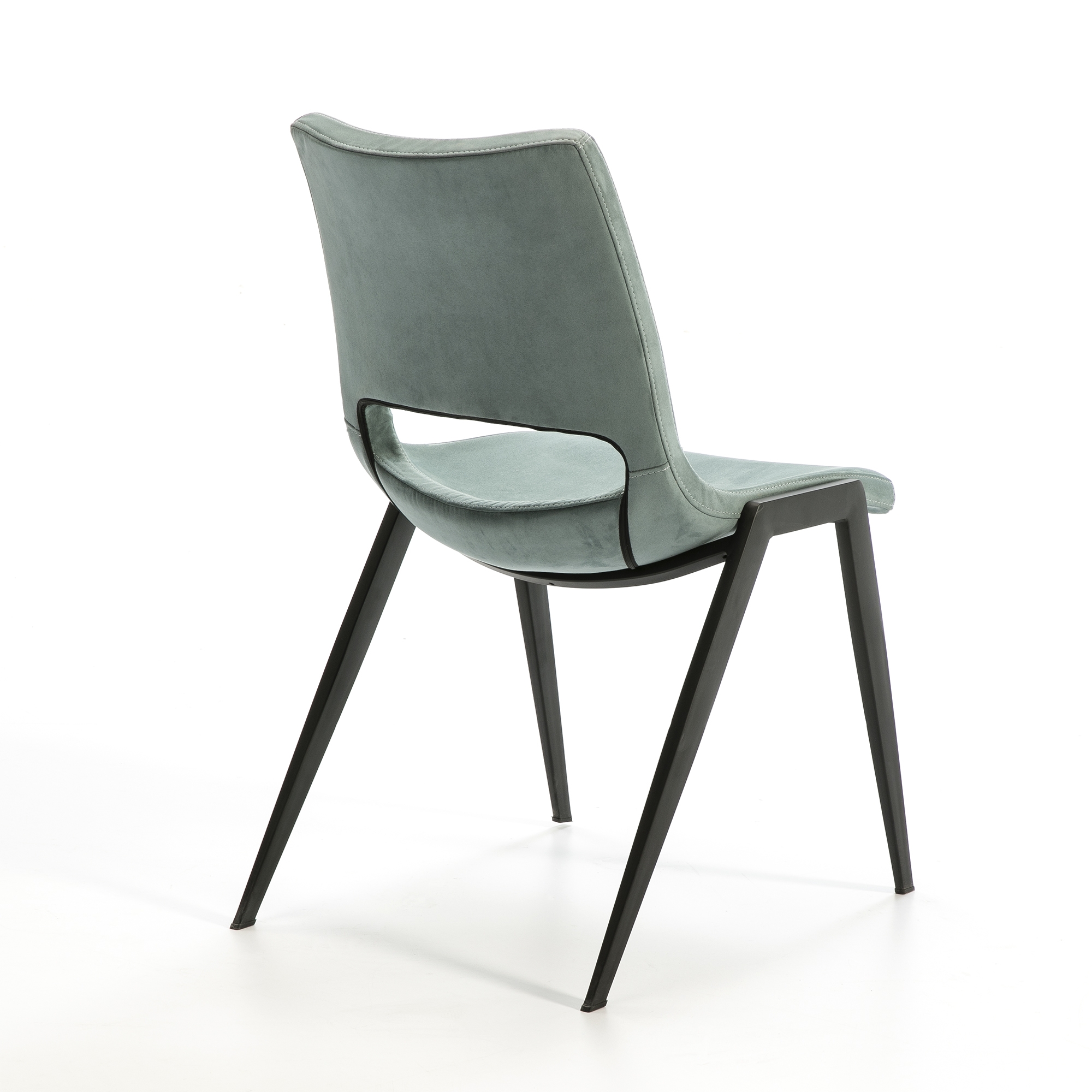 Стул из металла с матовым чёрным покрытием. Сиденье и спинка из фанеры и полиуретанового наполнителя. Обивка из водоустойчивой ткани цвета морской волны.