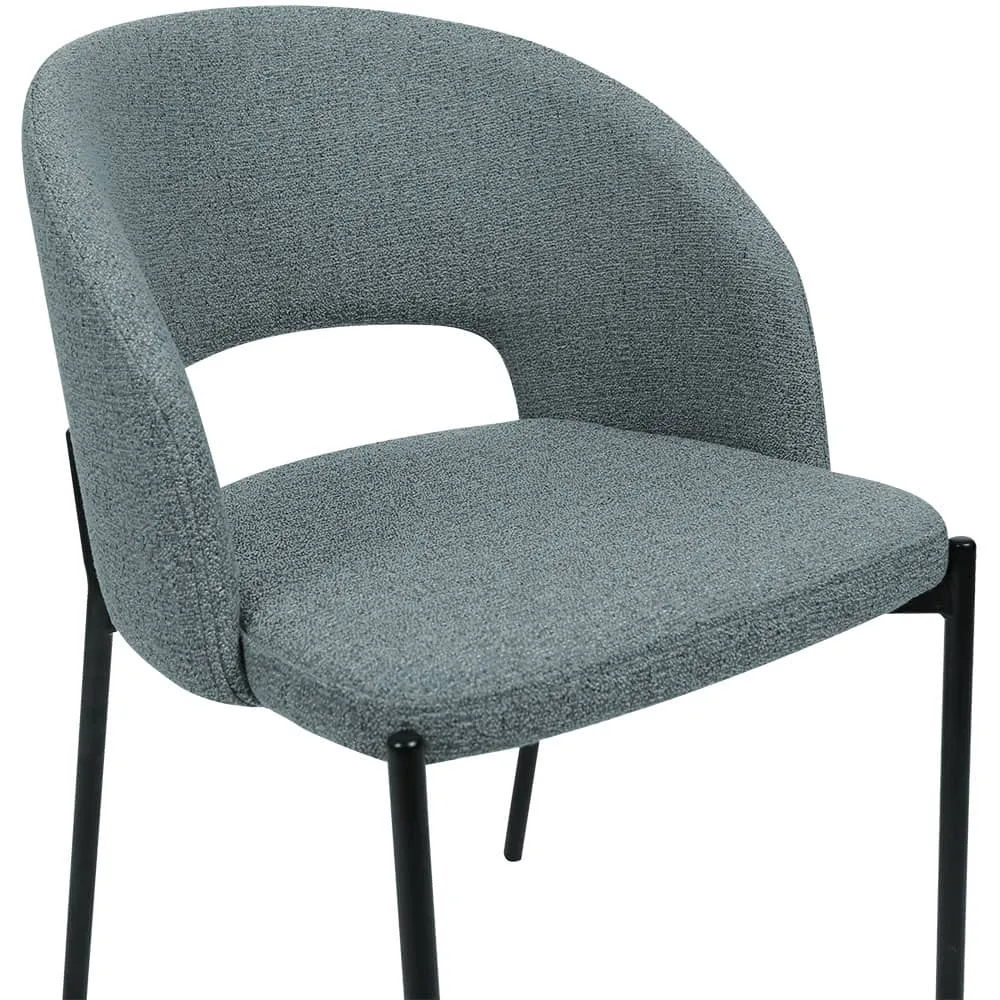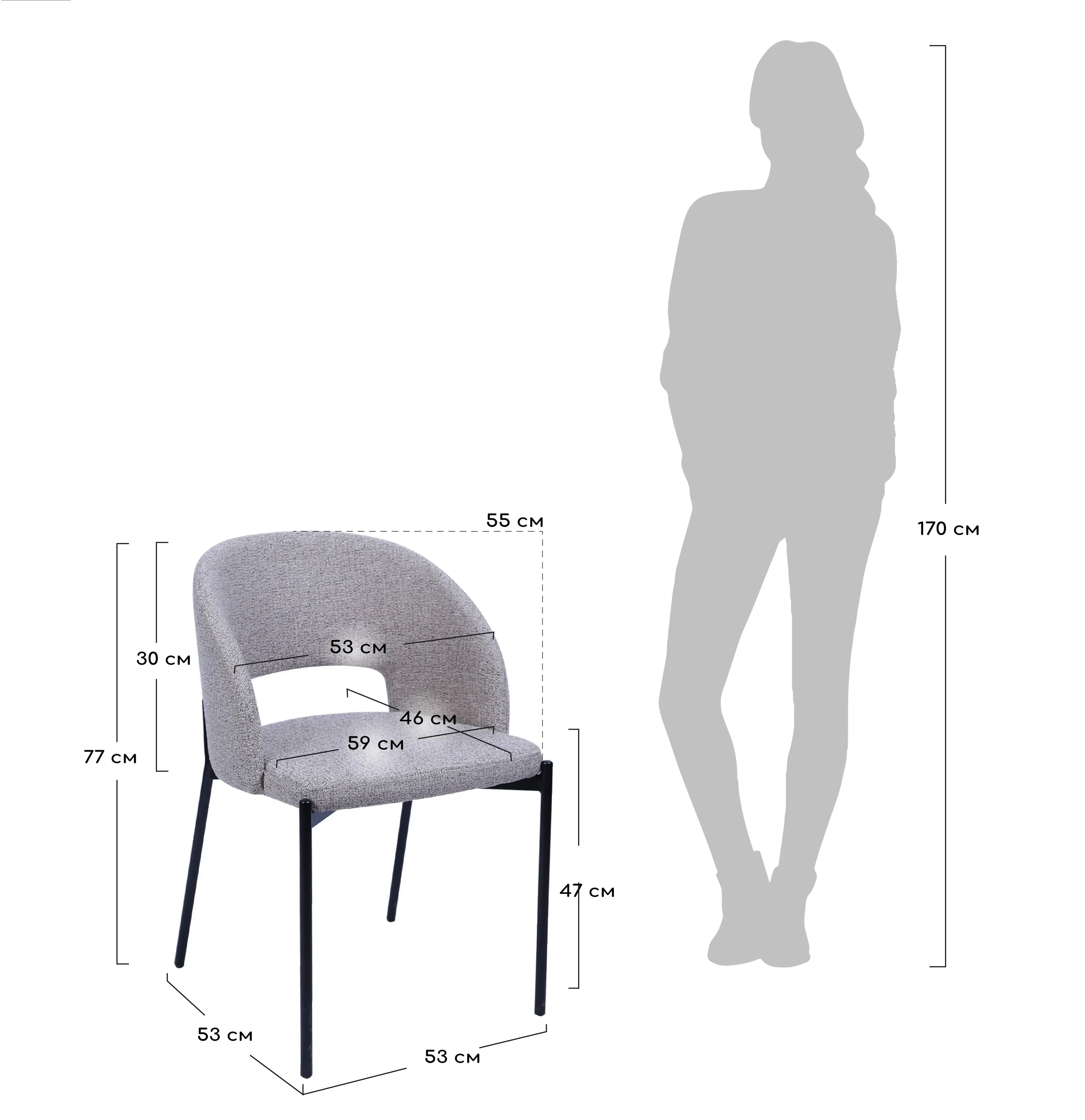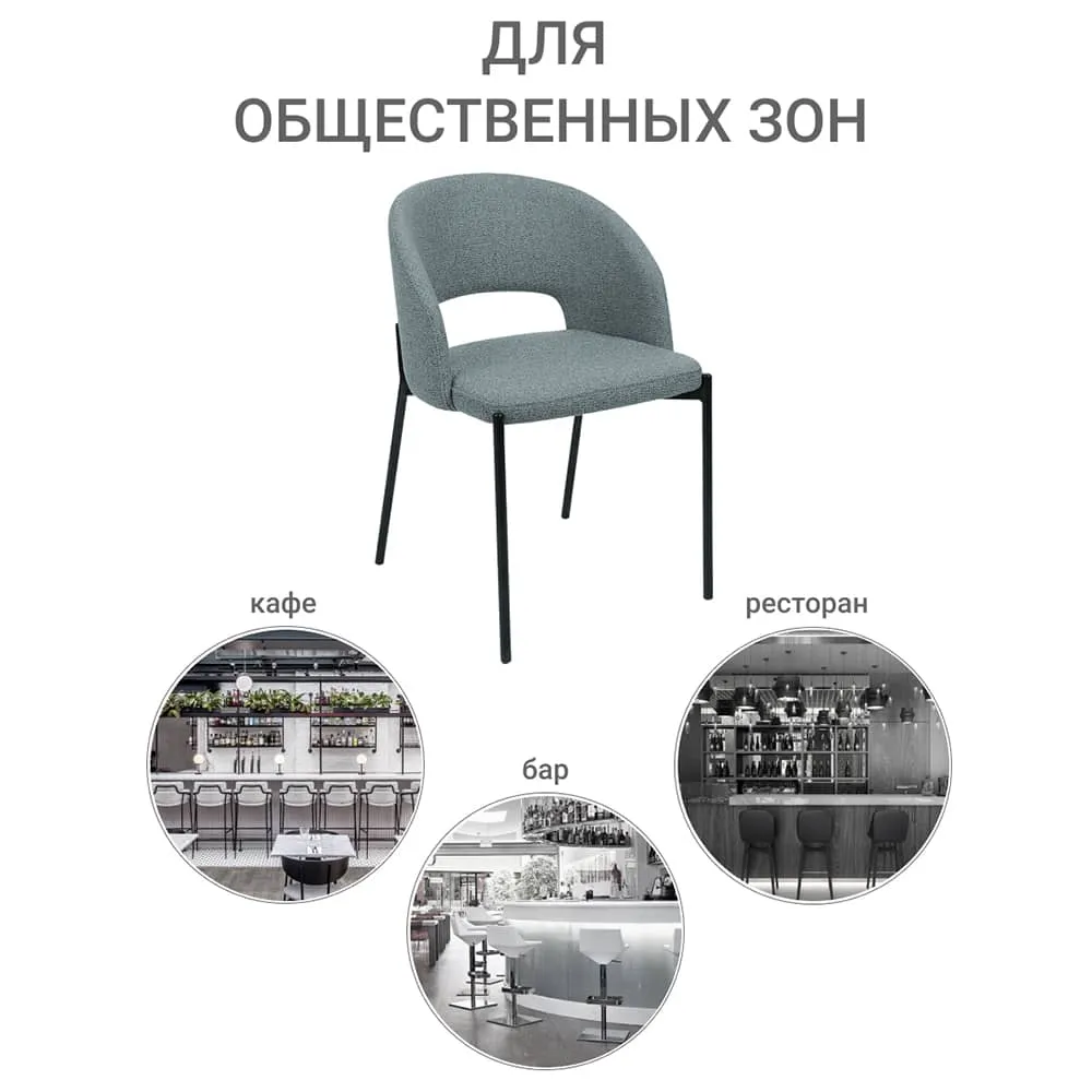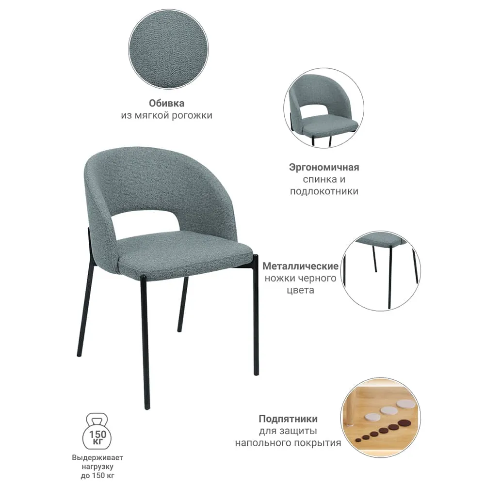 Чёрные матовые металлические ножки добавляют визуальной лёгкости и строгости, создавая визуальный контраст, который делает композицию завершённой и выразительной. Спинка с плавной аркой дарит ощущение комфорта и поддержки, а продуманная высота сиденья делает модель удобной как за обеденным столом, так и в рабочем уголке.