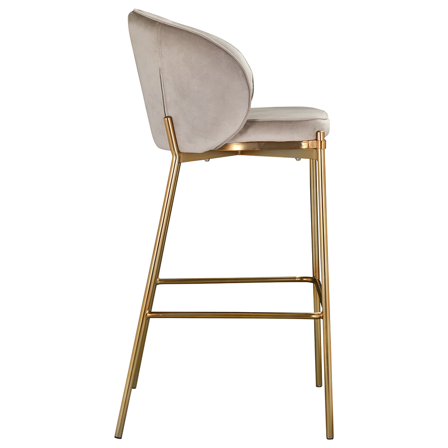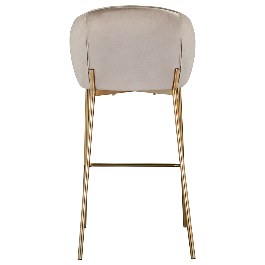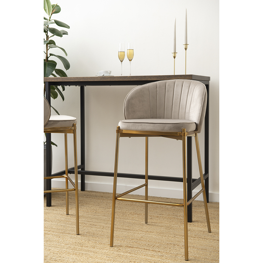 Комфорт во время отдыха на барном стуле создается за счет мягкого сиденья с наполнителем из пенополиуретана и высокой закругленной спинки. Обивка из бархатистого велюра, украшенная декоративной строчкой, придает модели особый шарм. Эстетический потенциал материала настолько высок, что ему сложно найти конкурентов. Помимо презентабельного вида и приятных тактильных ощущений, ткань обладает хорошими эксплуатационными характеристиками, такими как прочность, износоустойчивость и долговечность. Ножки мебели выполнены из железа с гальваническим покрытием, что обеспечивает конструкции надежность и защиту от коррозии.