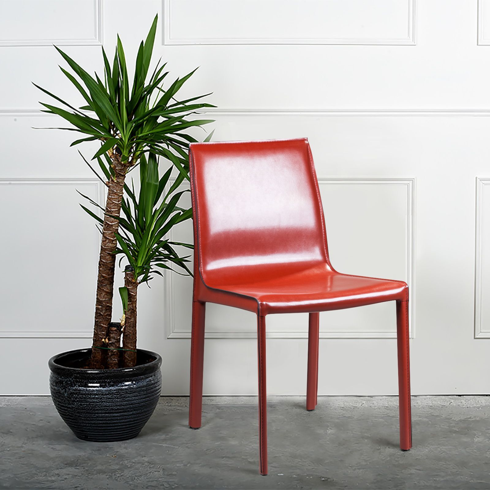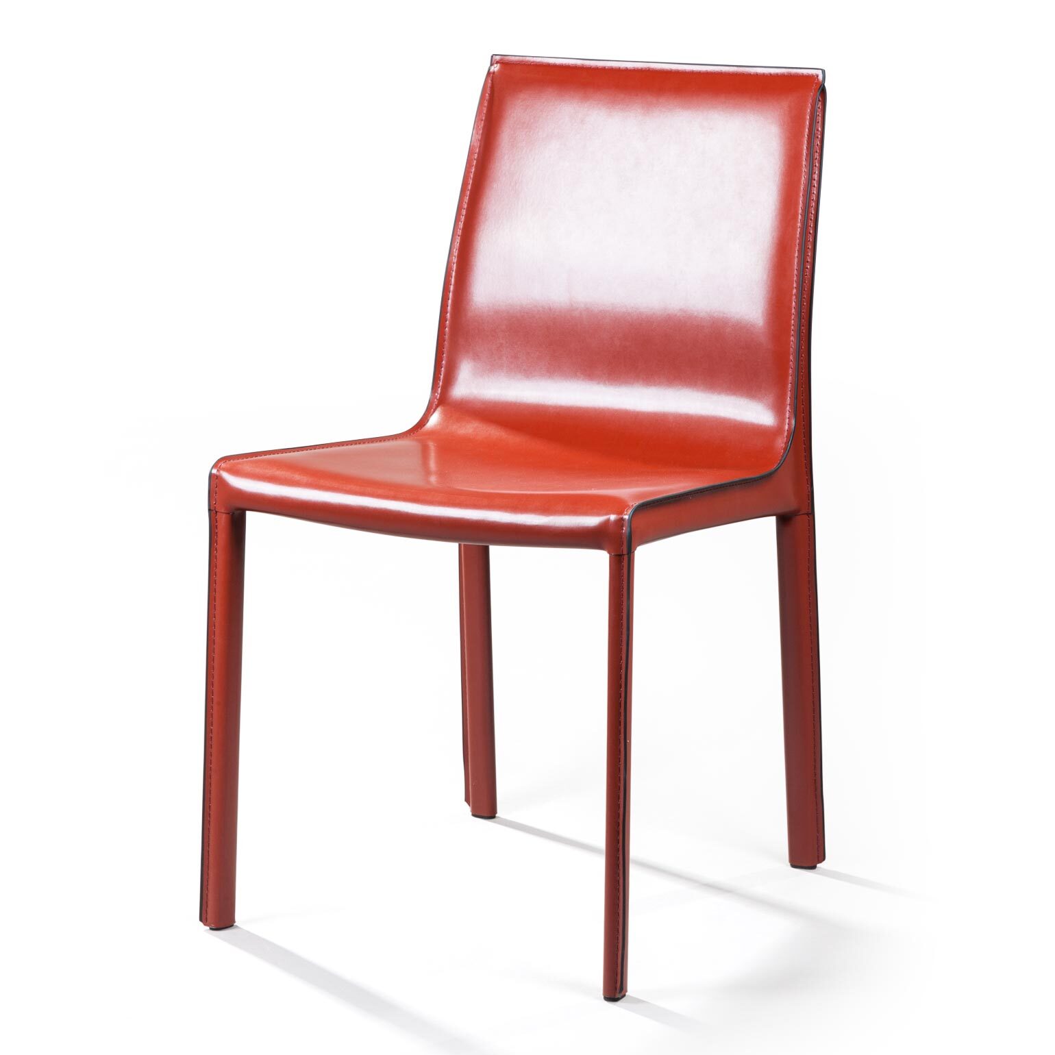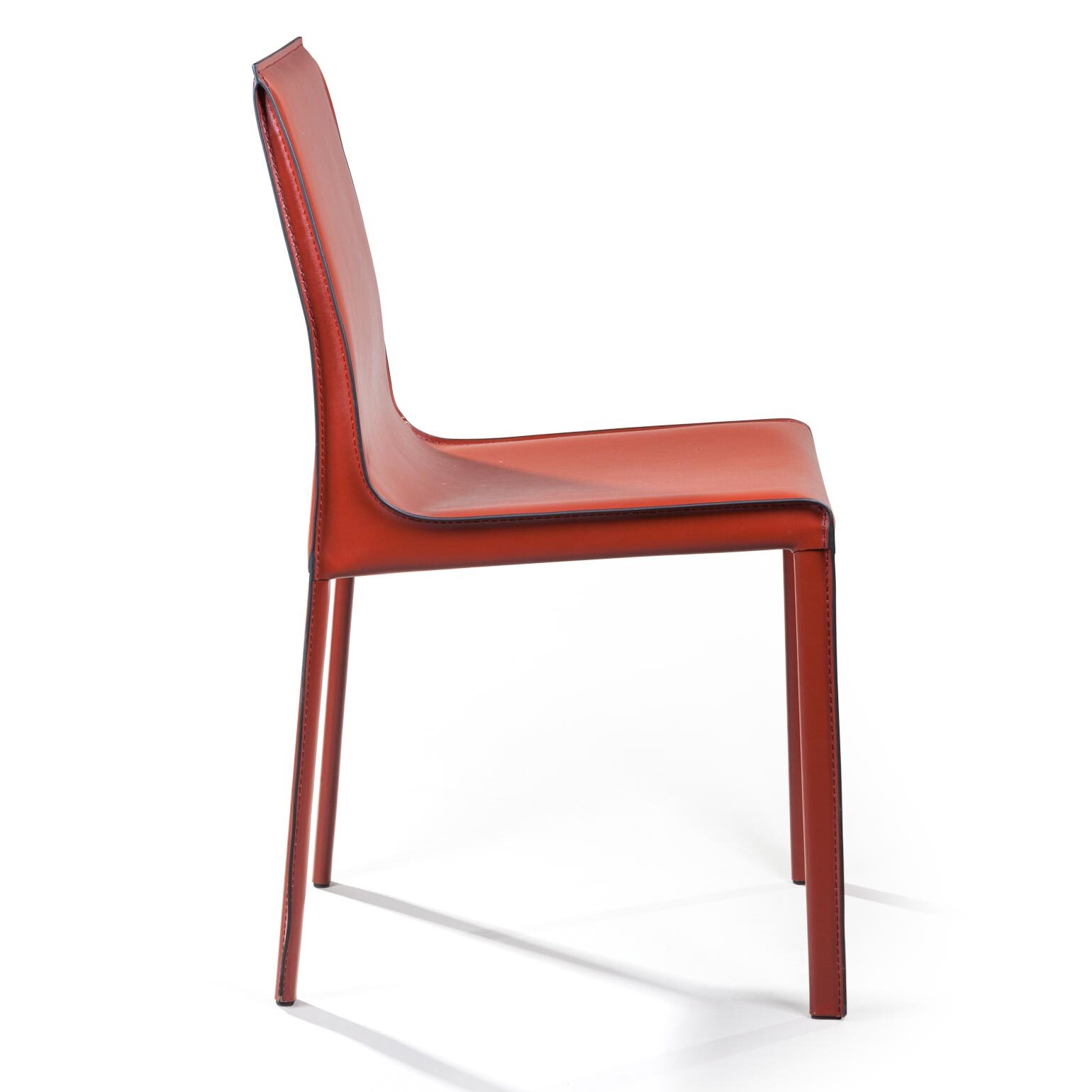 Крепкие металлические ножки скрыты под натуральной кожей такого же цвета, как и сам стул, благодаря этому создается лаконичный образ единого целого. На ножках предусмотрены специальные пластиковые накладки, которые придают стулу дополнительную устойчивость и защищают пол от царапин.