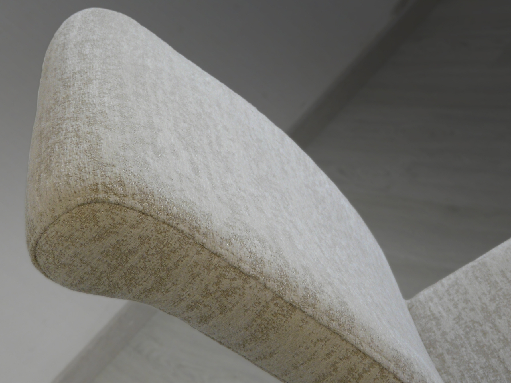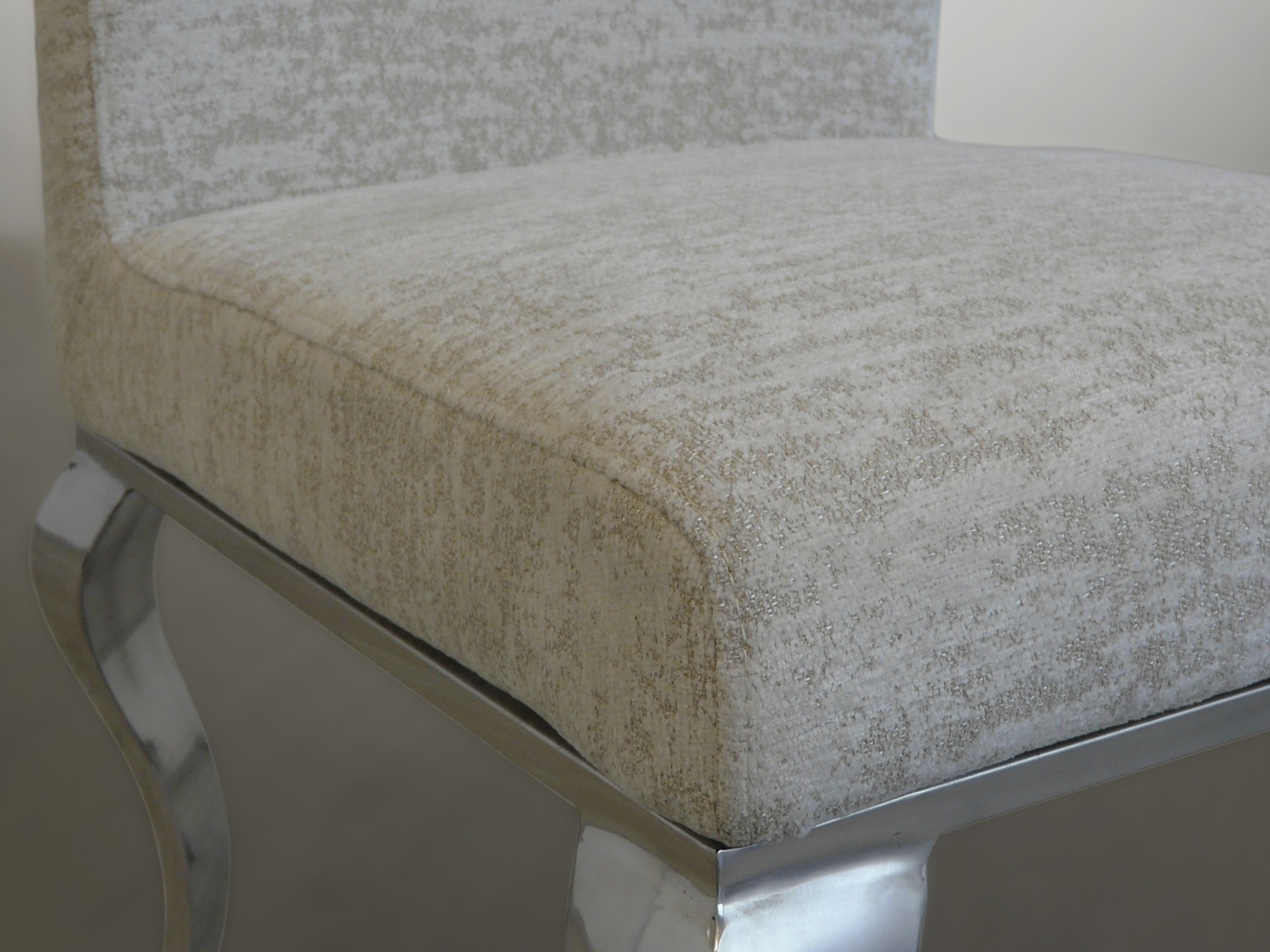 Стул из нержавеющей стали, обивка из ткани серого цвета.