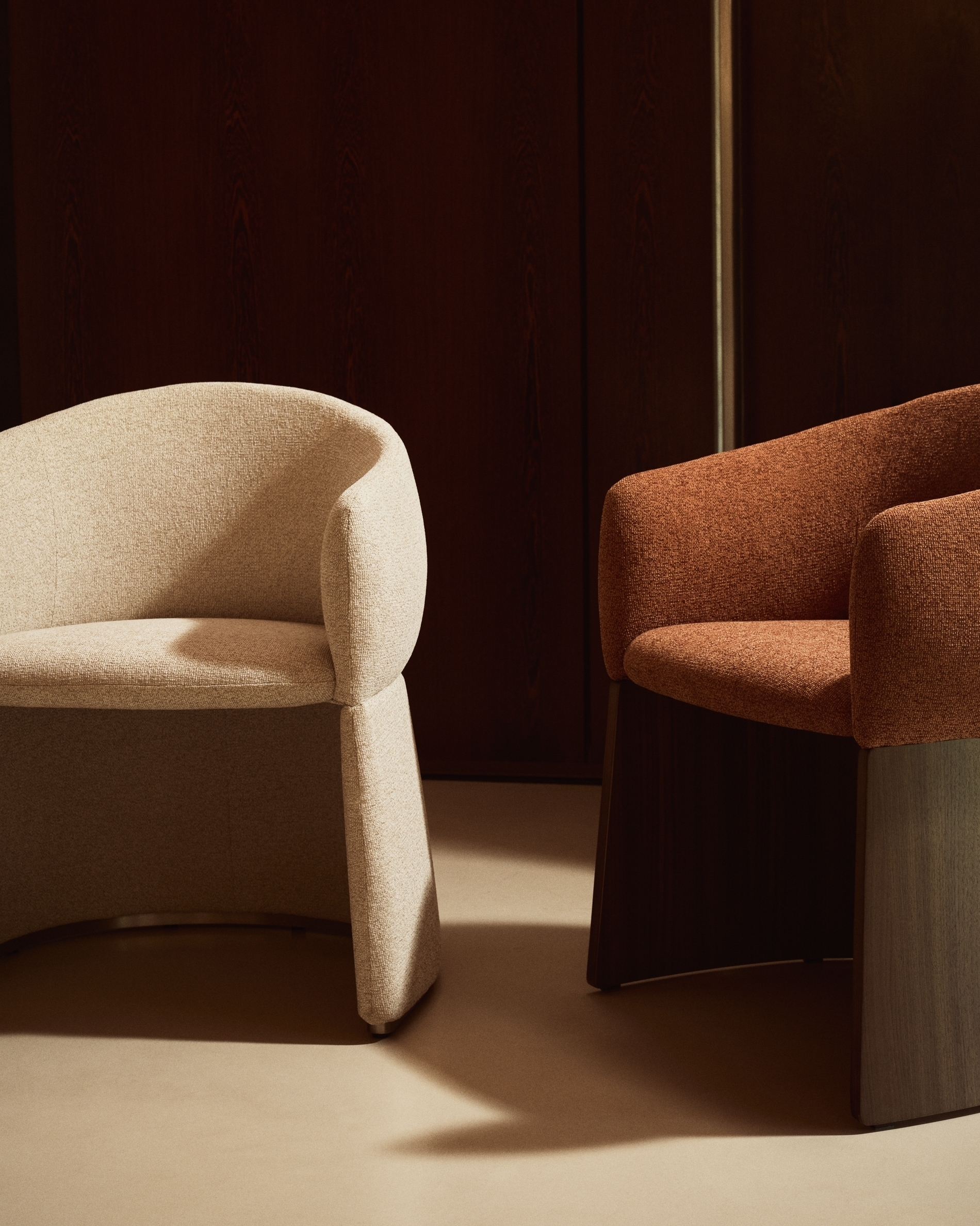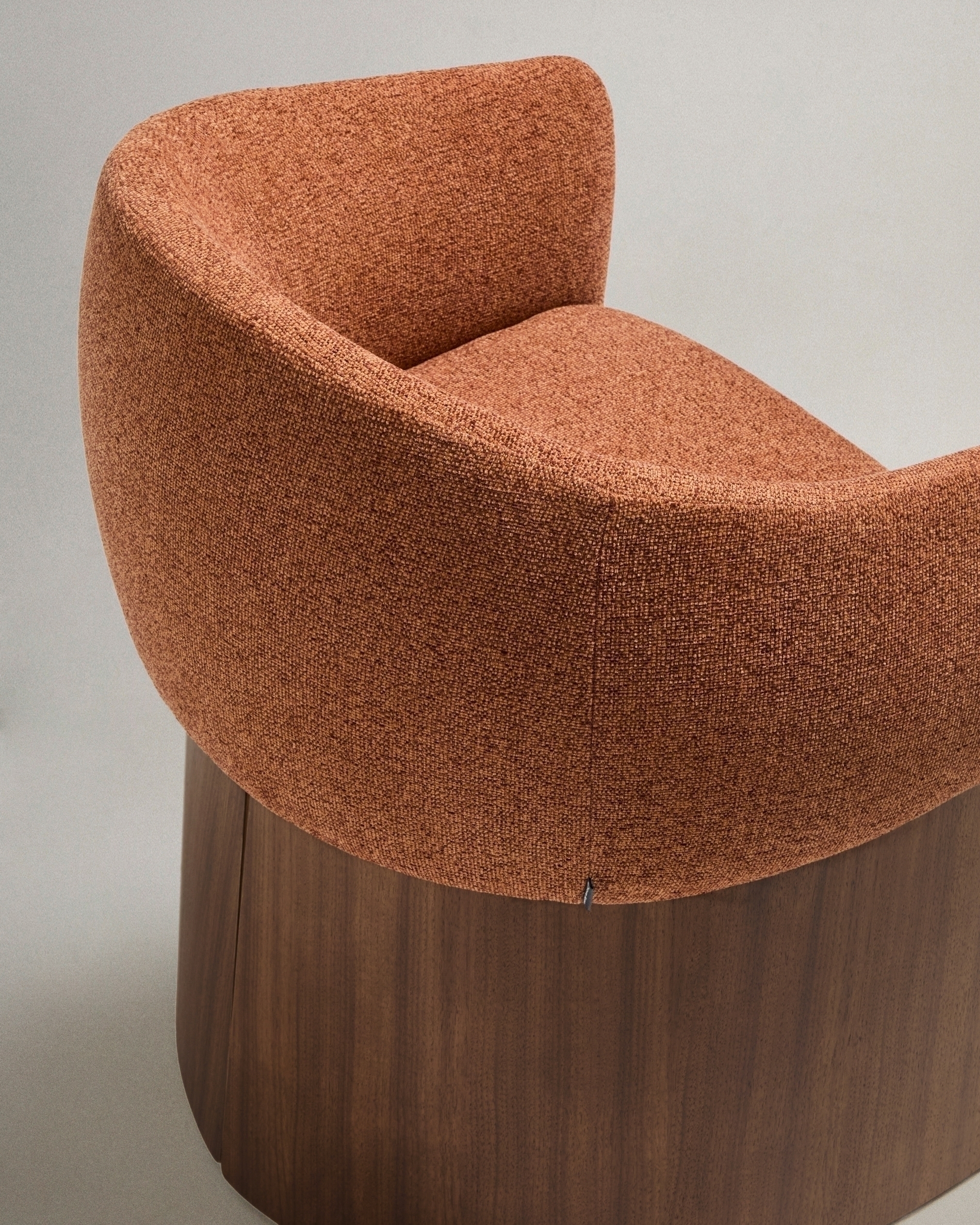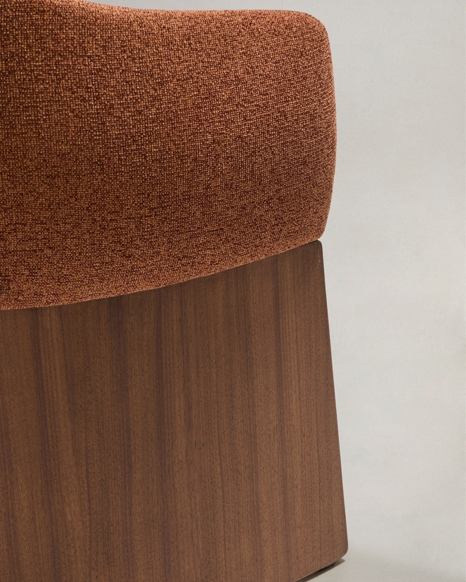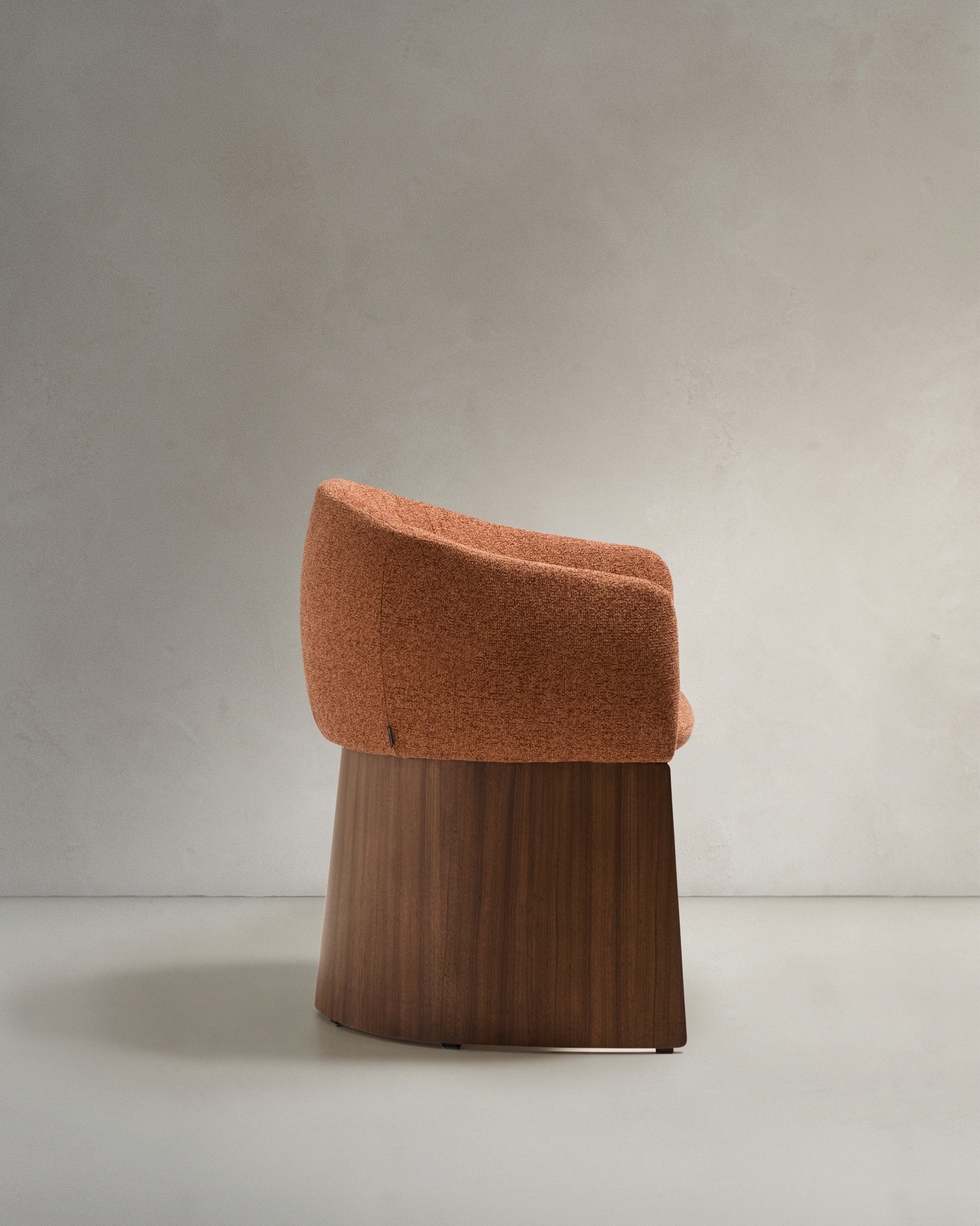 Этот стул отличается сбалансированным дизайном: широкое, удобное сиденье опирается на деревянное основание, покрытое ореховым шпоном. Матовое полиуретановое покрытие защищает поверхность и придает изделию теплоту. Древесина сертифицирована по системе FSC™ 100% и соответствует модели ответственного лесоуправления. Обивка выполнена из мелкоструктурного шенилла: мягкого на ощупь, прочного и долговечного, изготовленного из 100% переработанного полиэстера от поставщика, сертифицированного по Глобальному стандарту переработки.