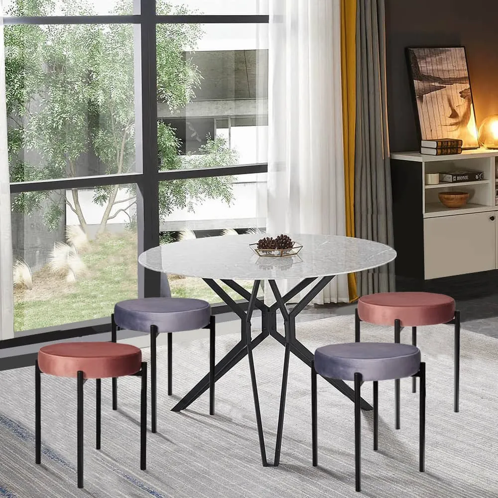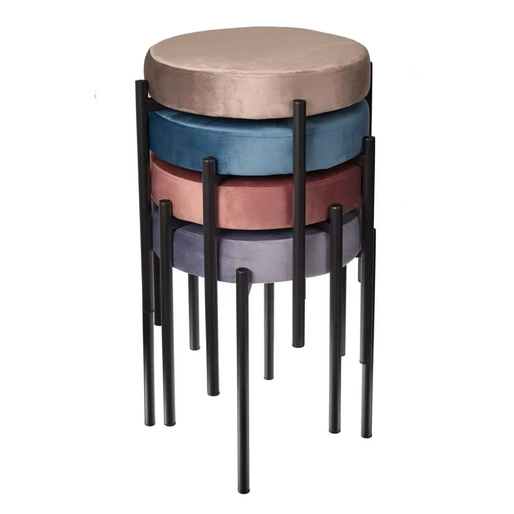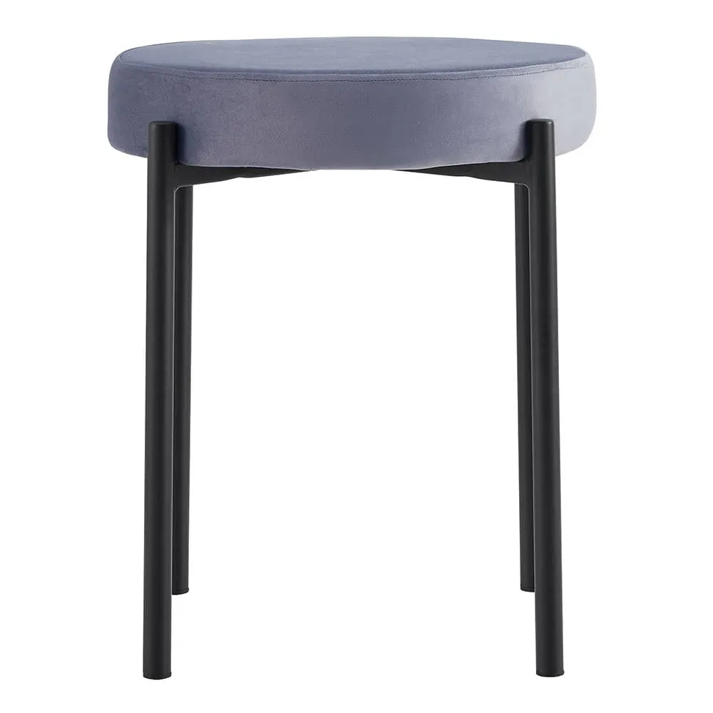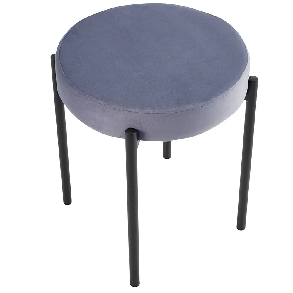 Обивка из мягкого серого велюра приятна на ощупь и держит презентабельный вид: ткань неприхотлива, для ухода достаточно сухой чистки пылесосом, щёткой или валиком. Каркас выполнен из фанеры с упругим пенополиуретаном плотностью 25 кг/м³ — посадка мягкая, но собранная. Сверху — круглая геометрия: диаметр сиденья 40 см, ровно столько, чтобы сидеть удобно и не перегружать пространство.